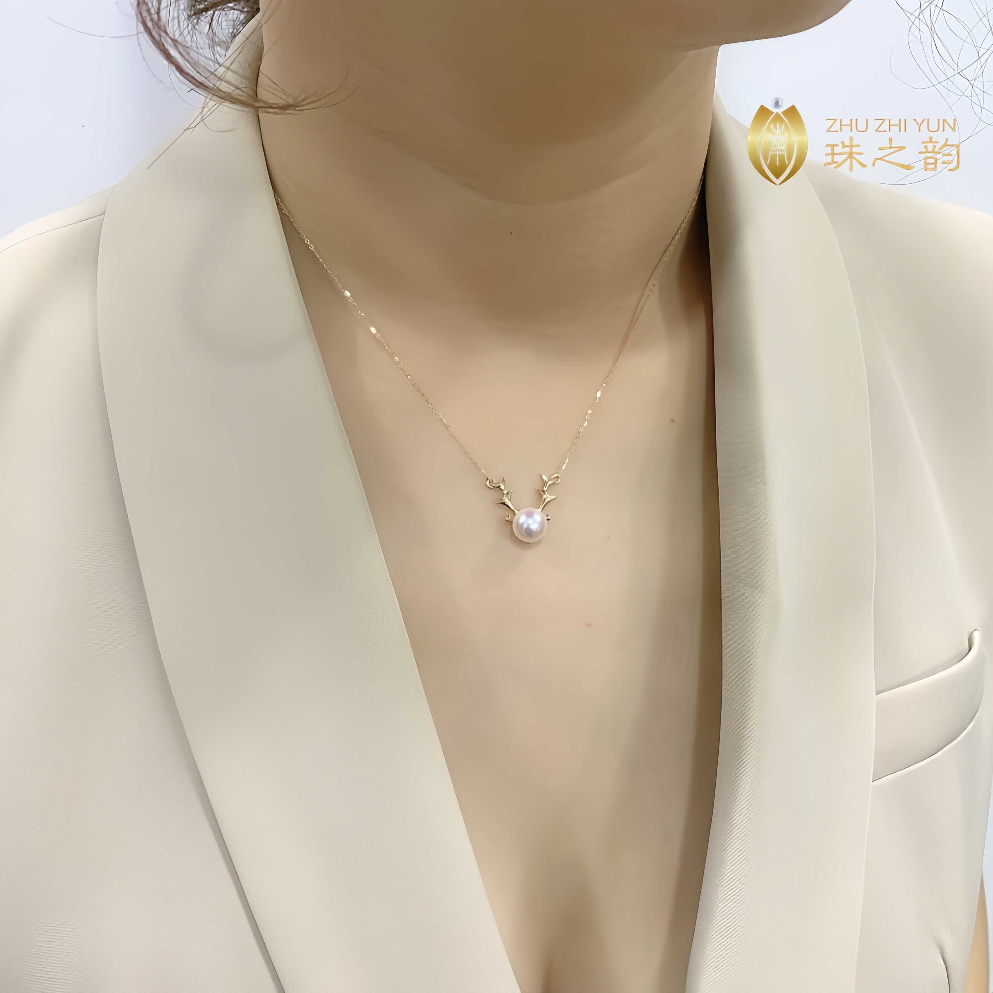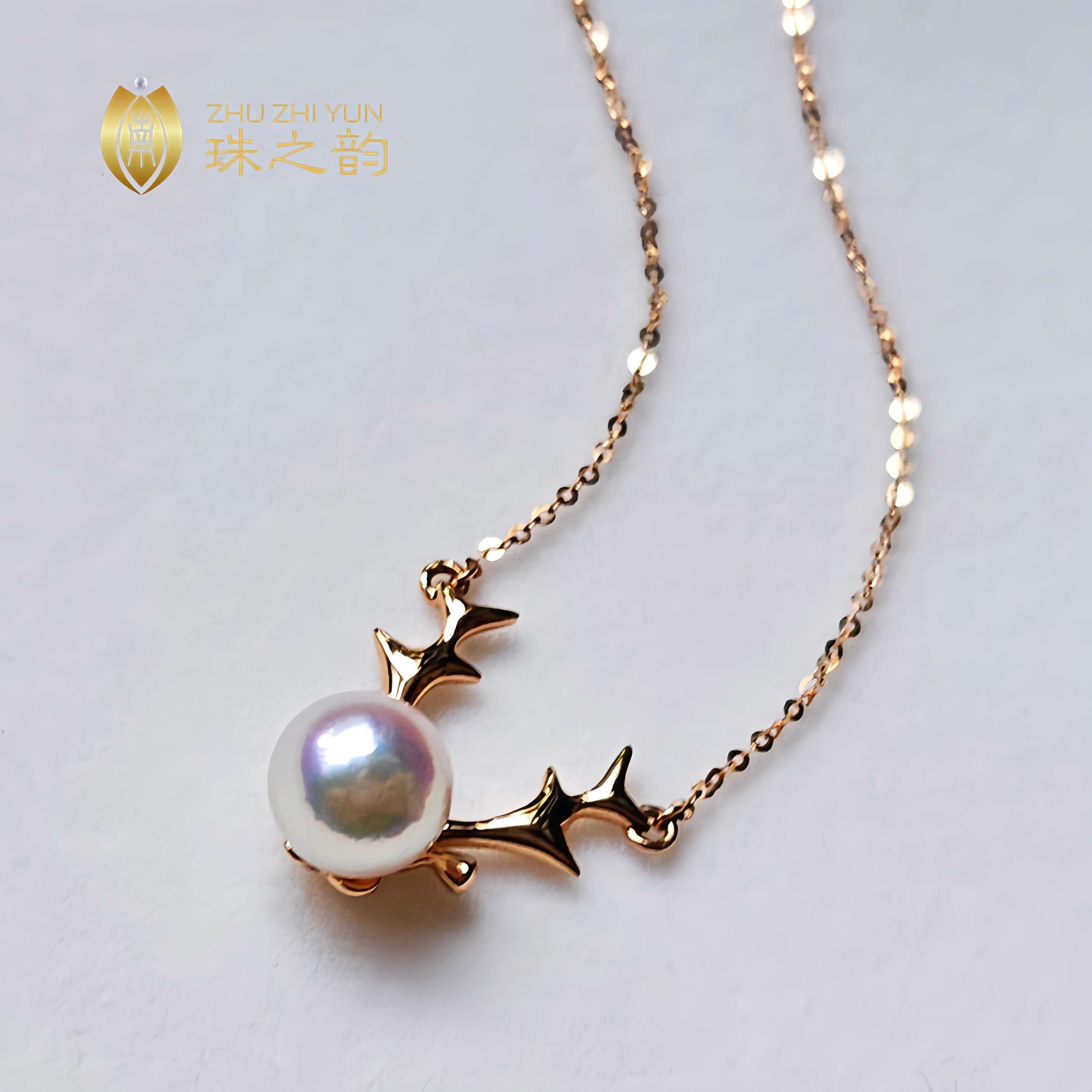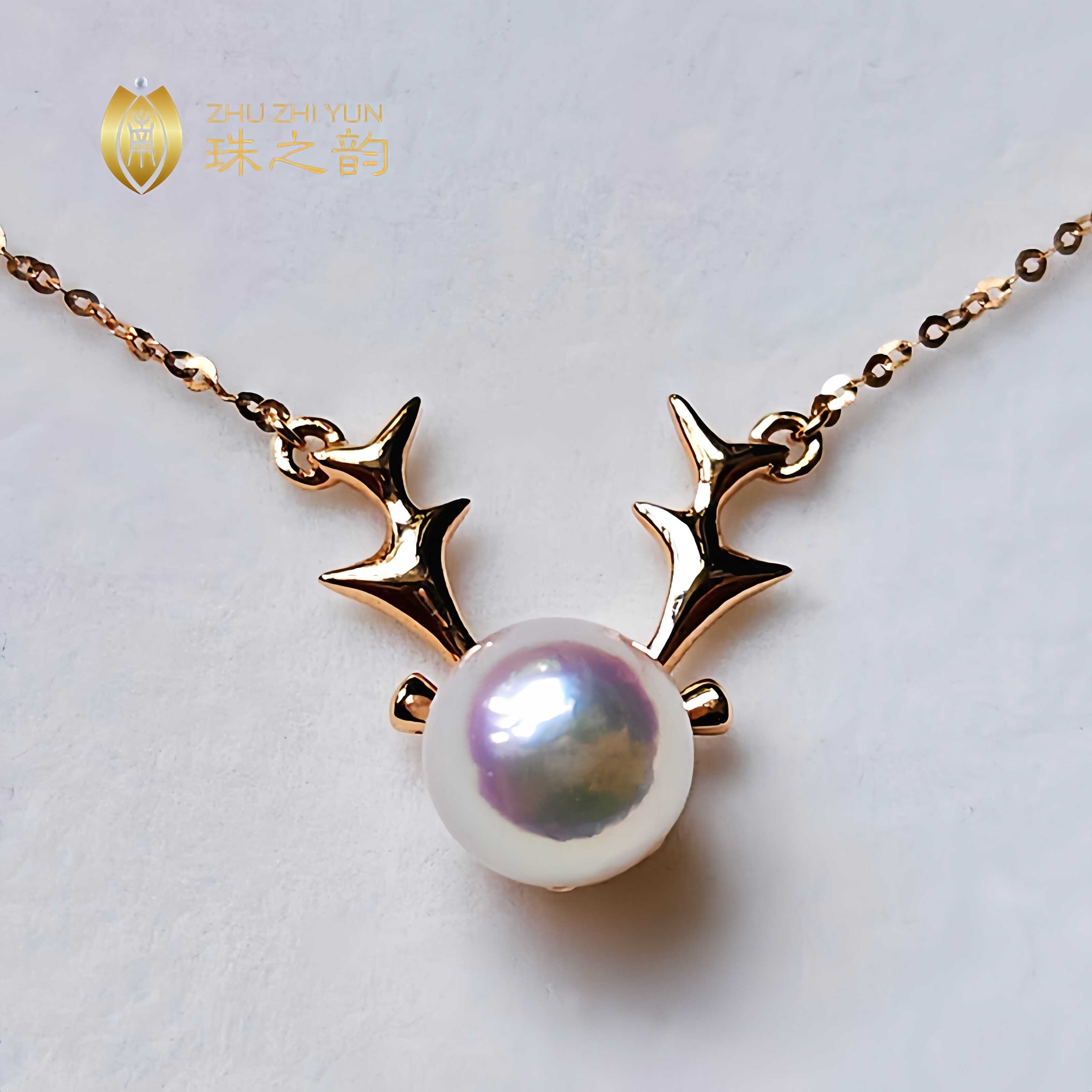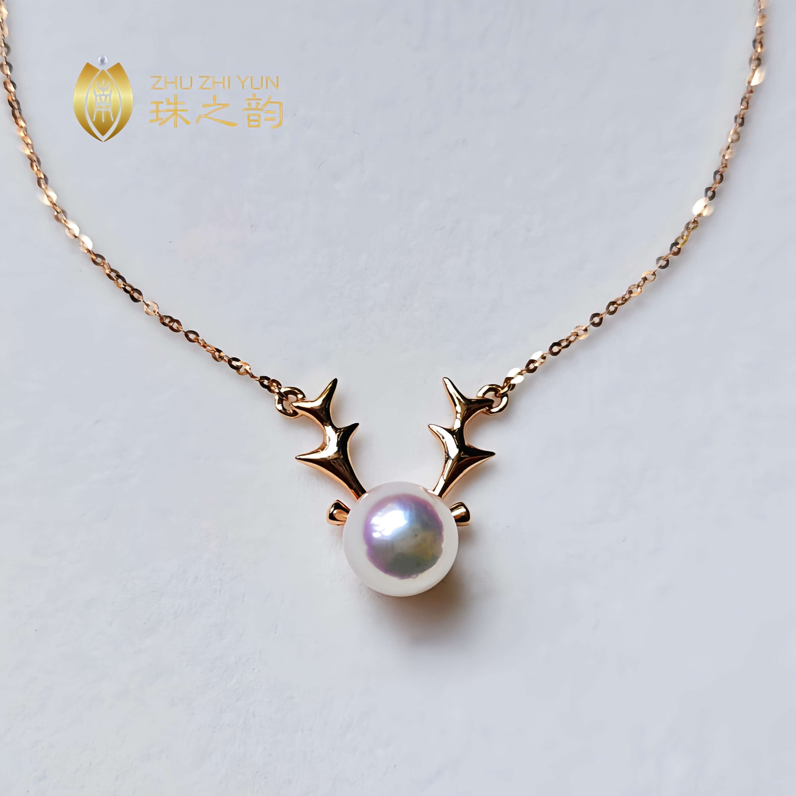 Only double aurora goddess Japanese akoya sea water pendant 18k rose gold antler necklace is round and fashionable 18k rose gold integrated chain + akoya flower beads 9.5-10mm