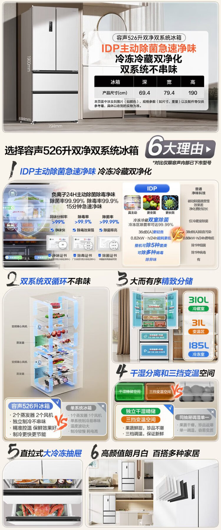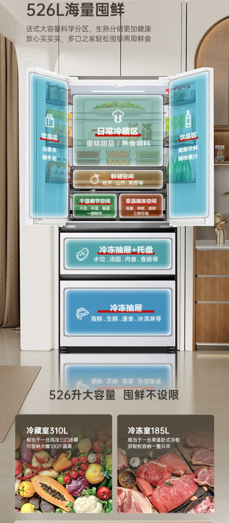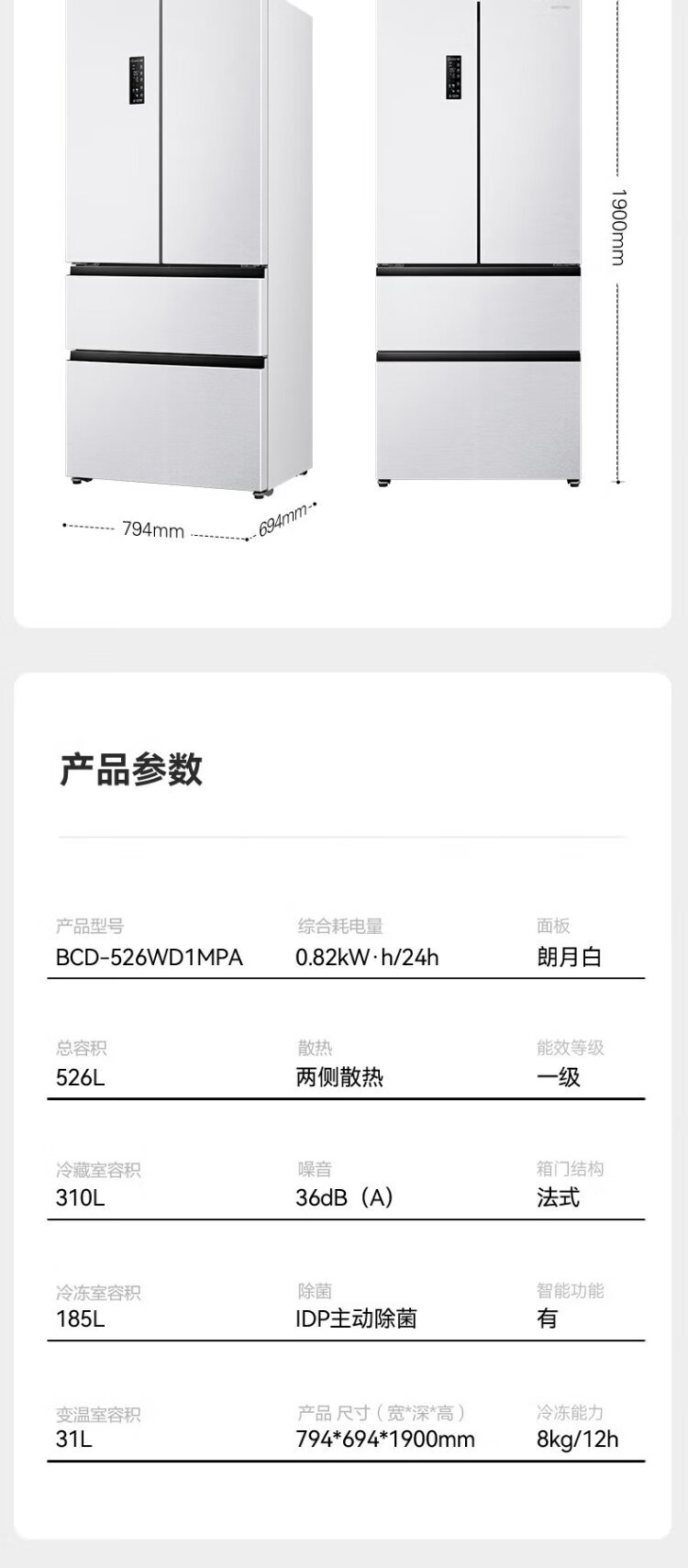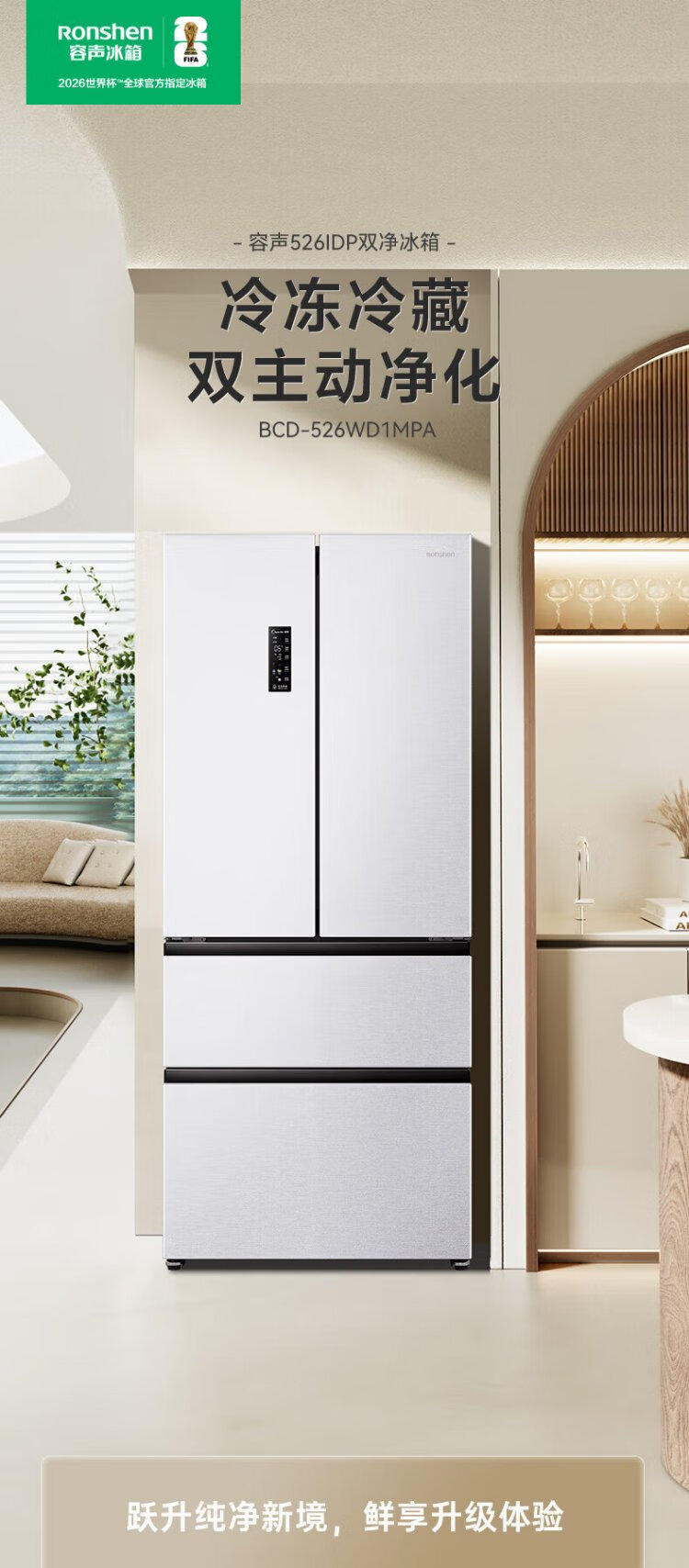Rongsheng 526-liter dual-clean dual-system French multi-door four-door refrigerator household first-class energy efficiency air-cooled frost-free energy-saving large capacity BCD-526WD1MPA white national subsidy BCD-526WD1MPA