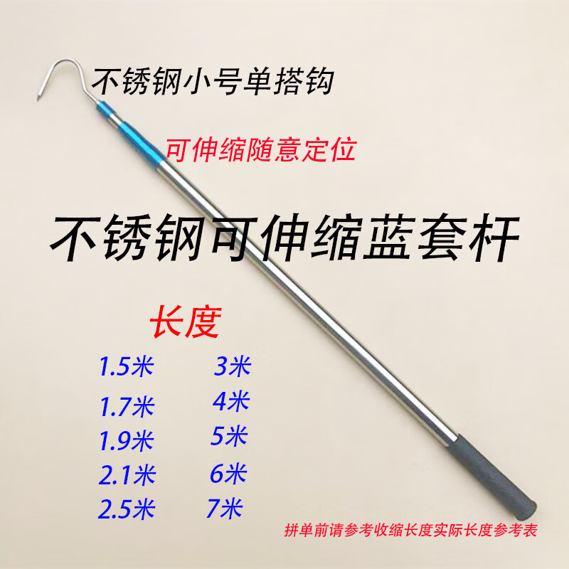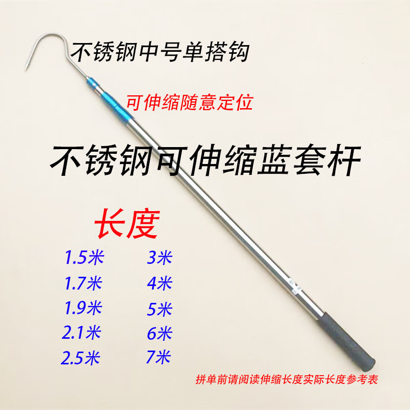 Vinoa thickened and lengthened blue set stainless steel telescopic pole single hook round tip large hook long handle long pole retrieval complete set blue set 1.5 meter telescopic pole + long hook