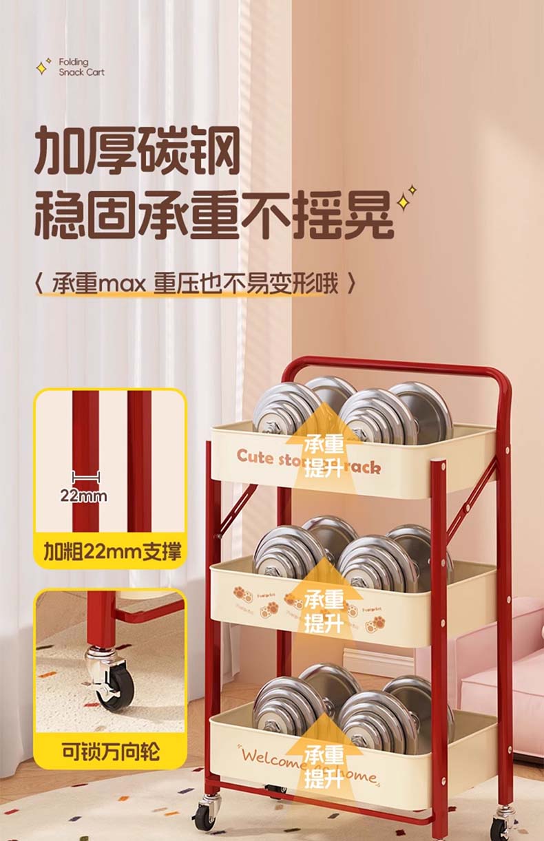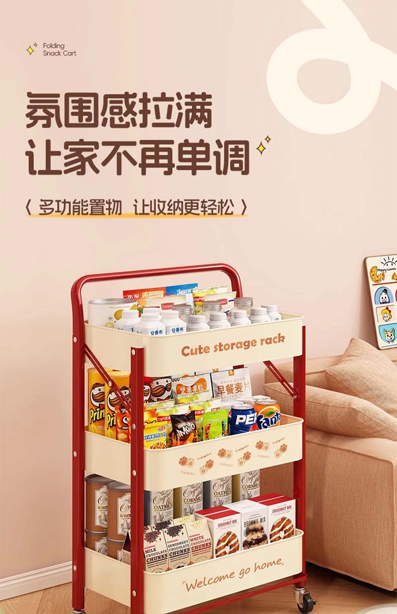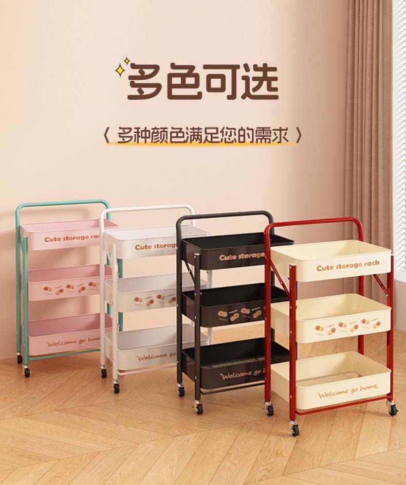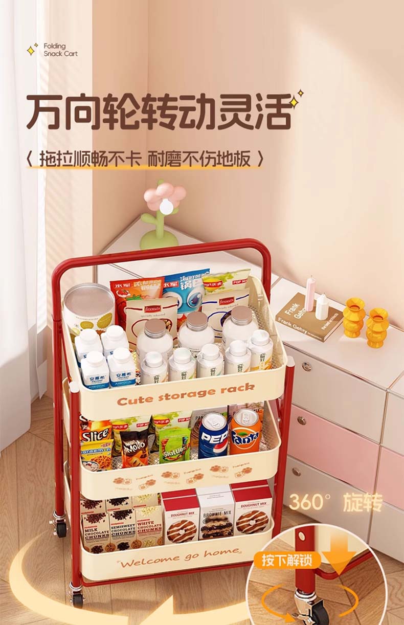 Tangneng excellent product storage rack floor-standing removable trolley storage rack free of installation household snack rack dopamine storage rack with wheels installation-free three-layer thickened carbon steel storage rack