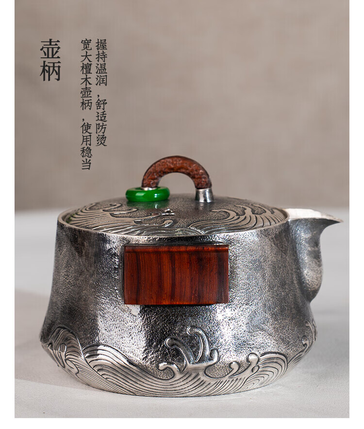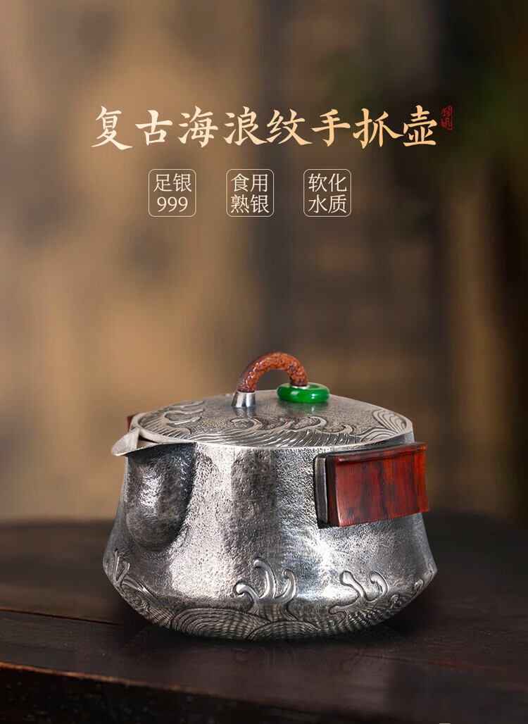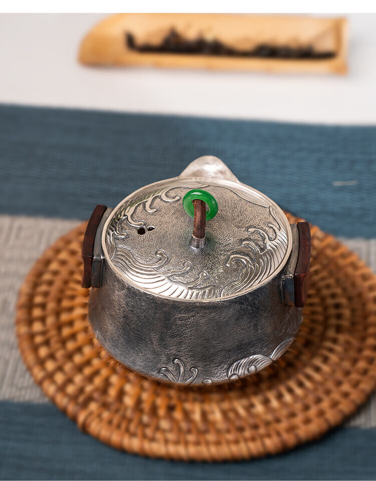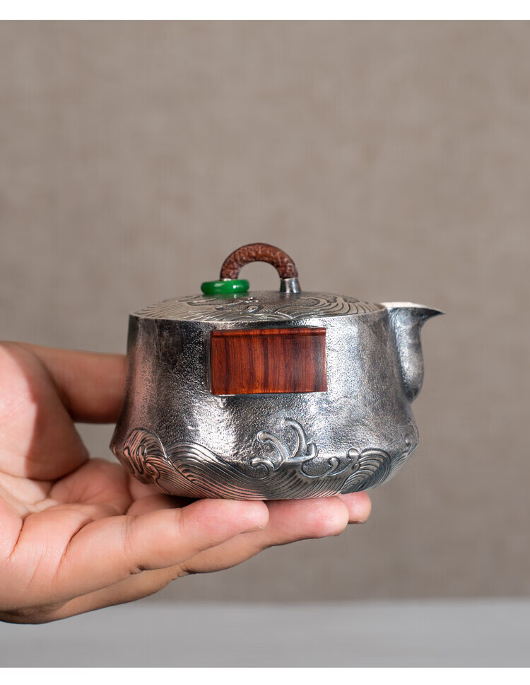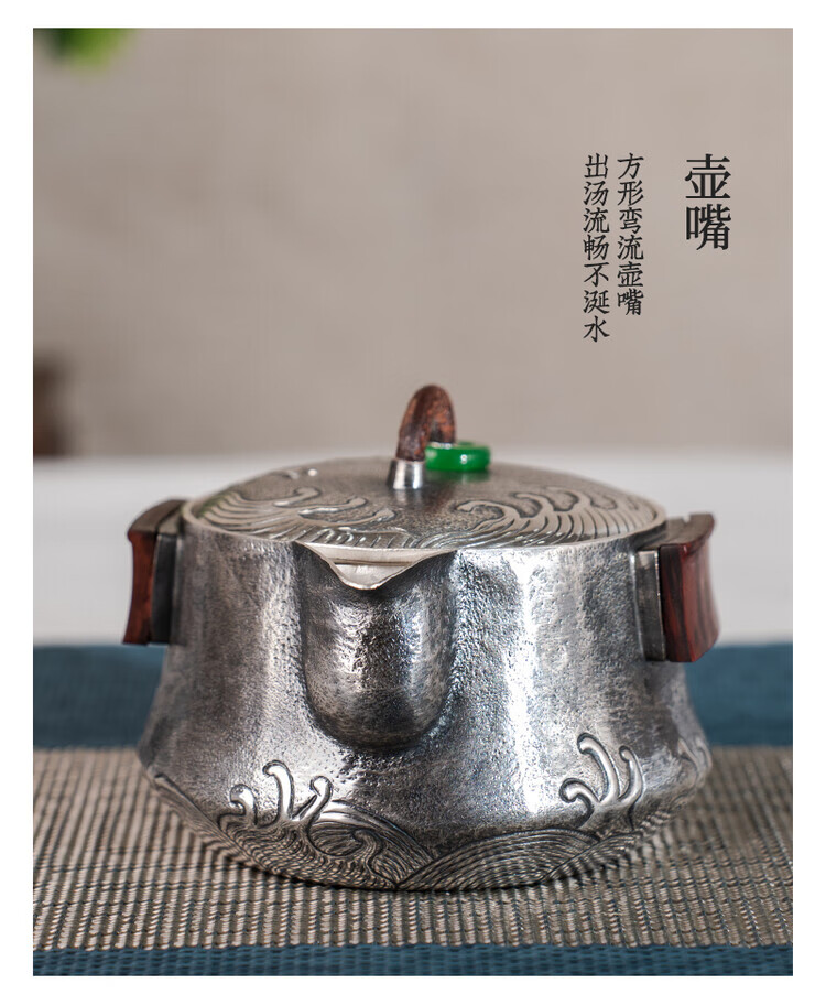 Dian Qingtang Yunnan Handmade Silver Teapot Pure Silver 999 Retro Wave Pattern Hand-caught Pot Pure Silver Chinese Tea Set Tea Set Wave Pattern Hand-caught Pot About 180g+Certificate+Gift Box