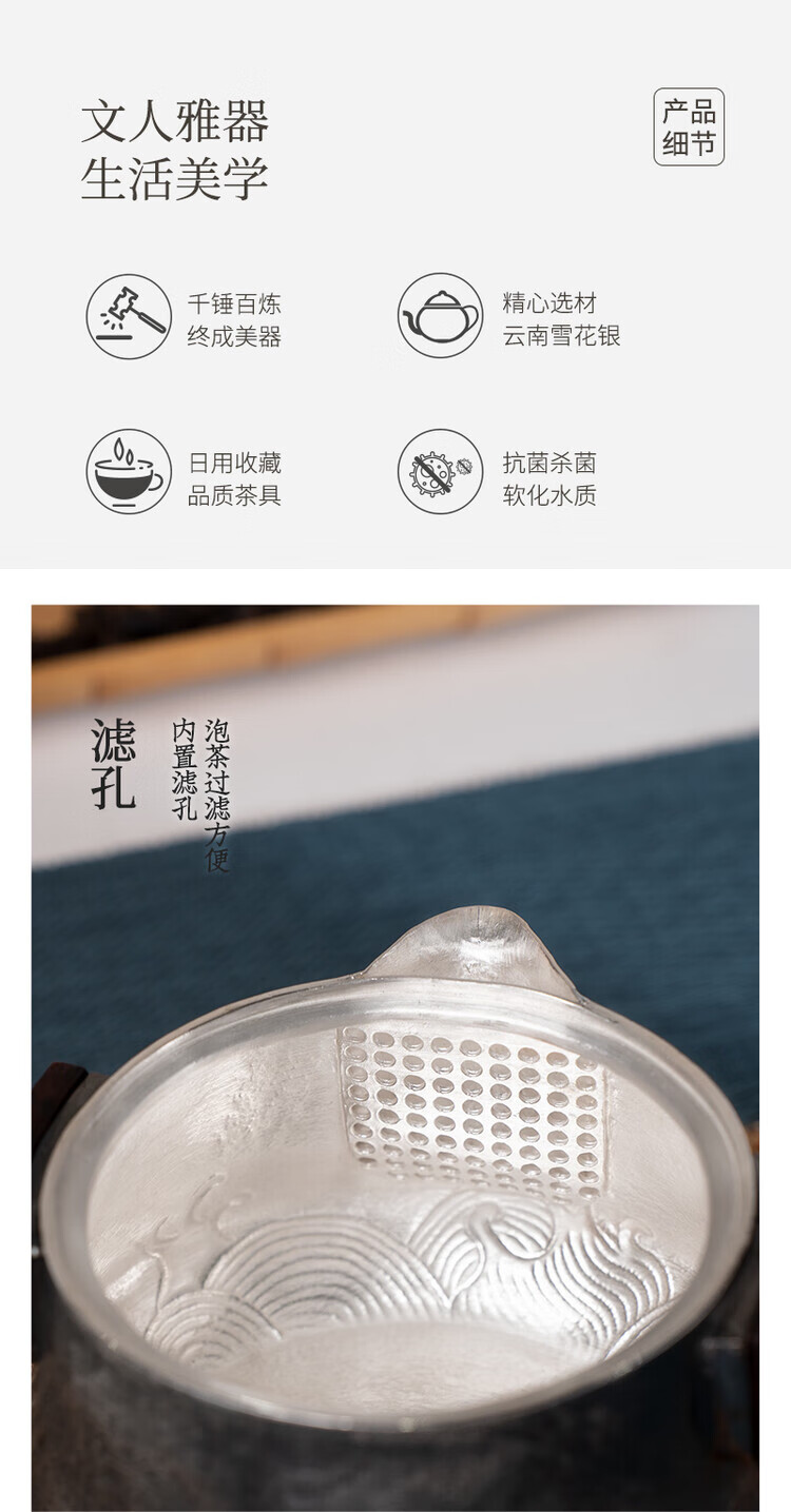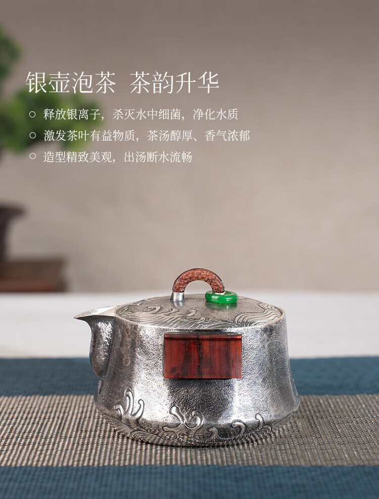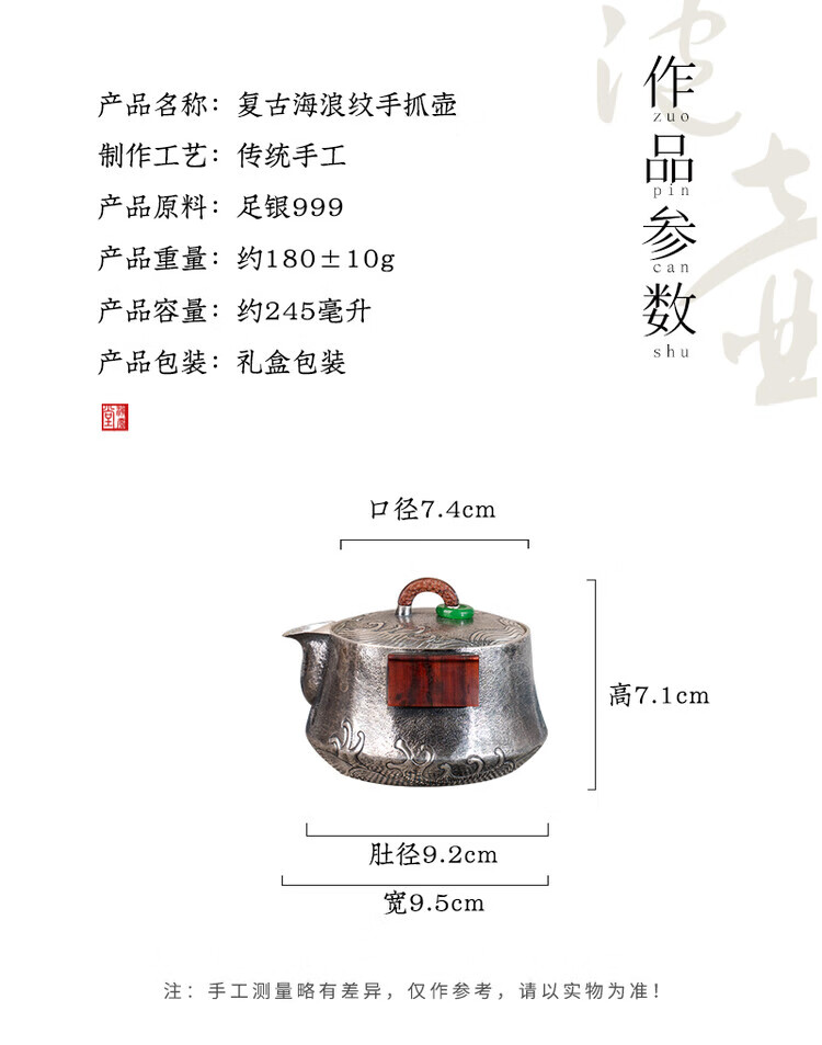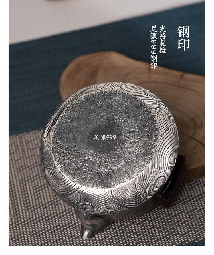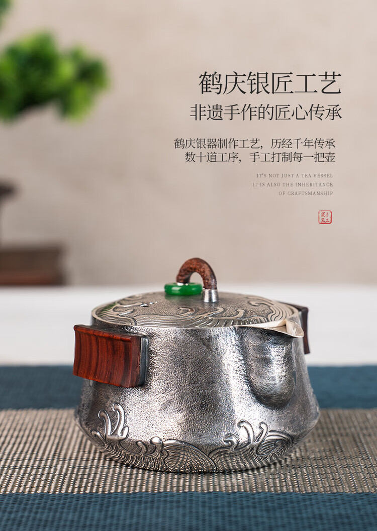Dian Qingtang Yunnan Handmade Silver Teapot Pure Silver 999 Retro Wave Pattern Hand-caught Pot Pure Silver Chinese Tea Set Tea Set Wave Pattern Hand-caught Pot About 180g+Certificate+Gift Box