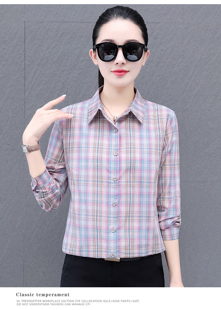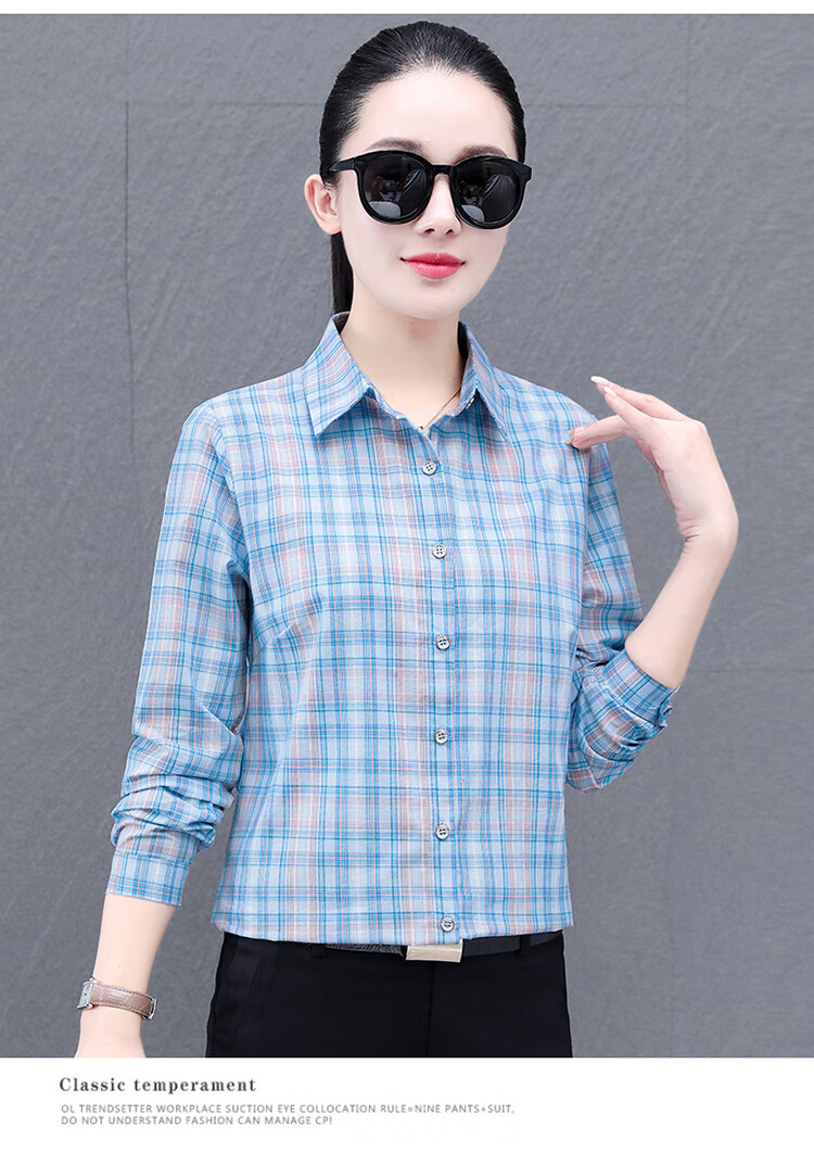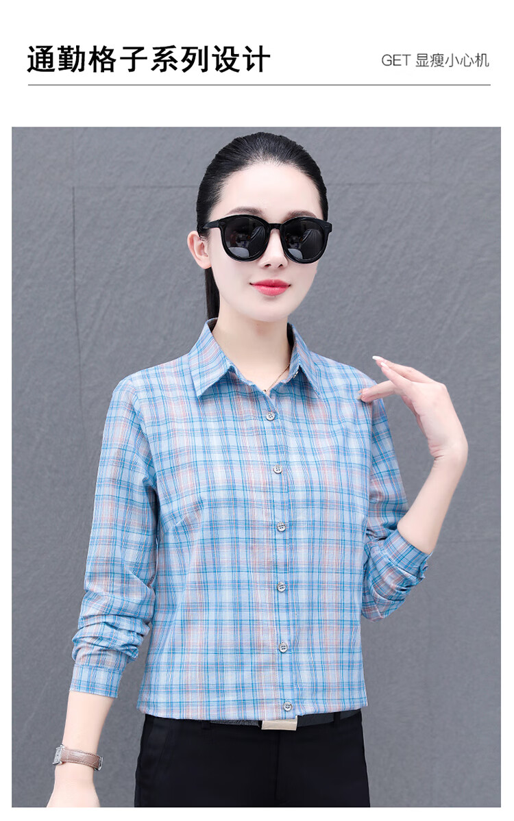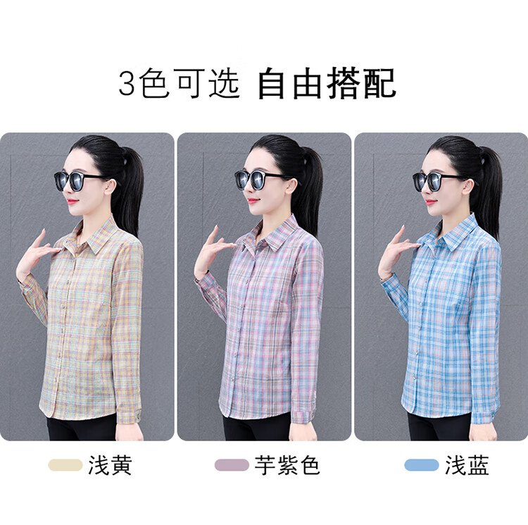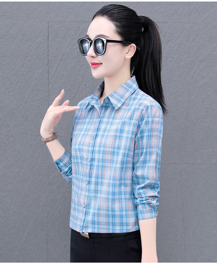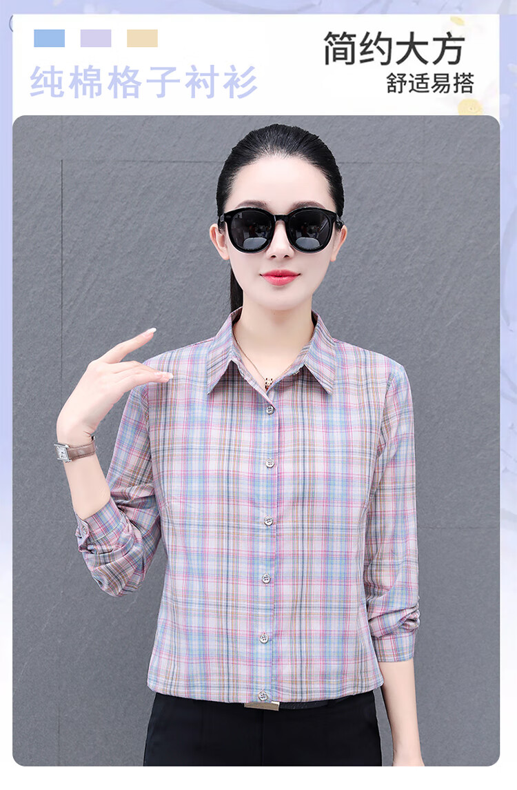 Pure cotton plaid shirt women's spring and autumn new middle-aged mother style long-sleeved temperament lapel slim top light blue 3XL 136-145