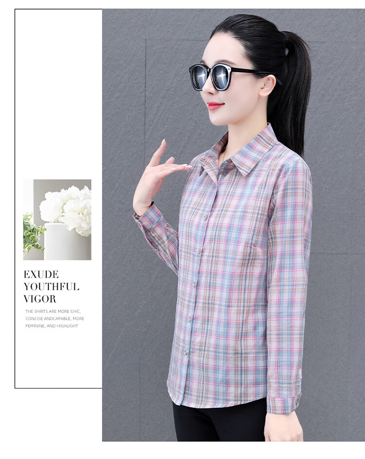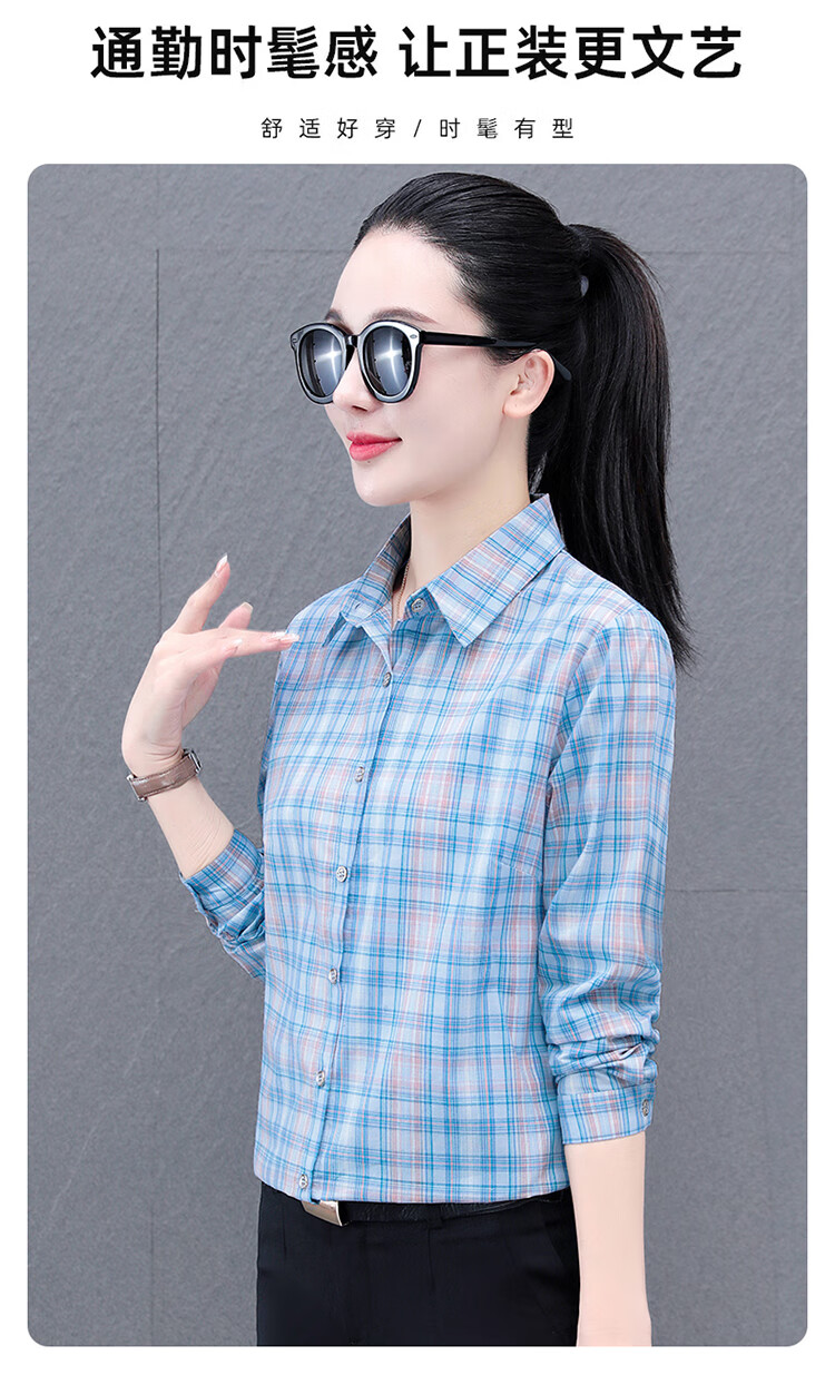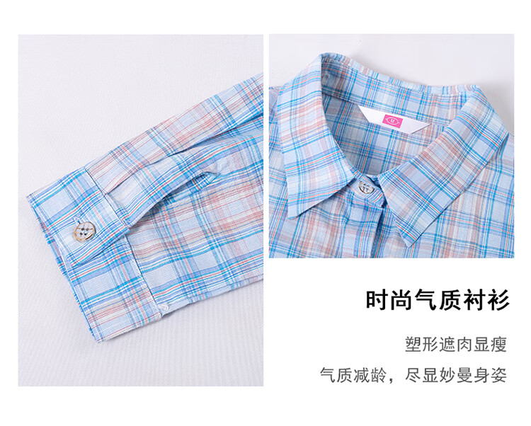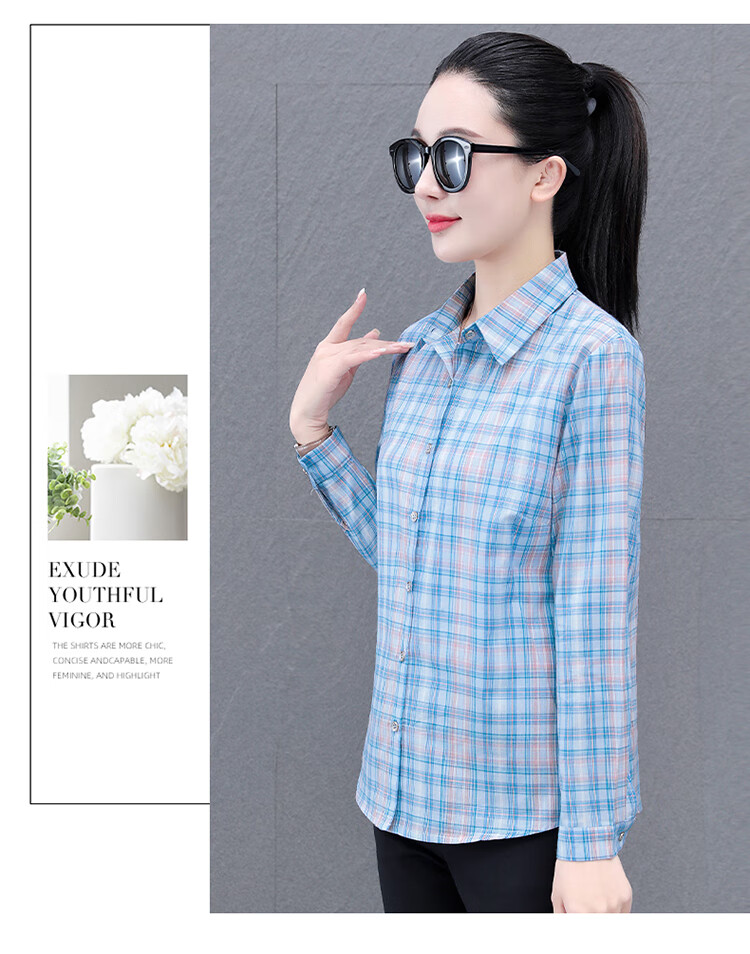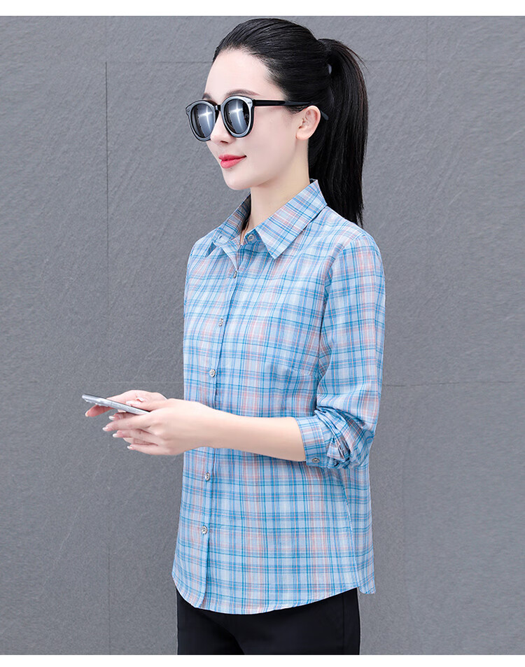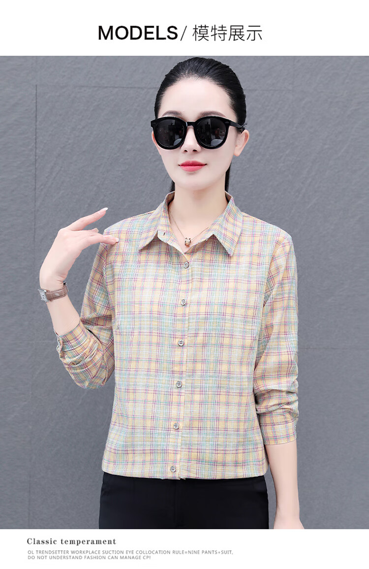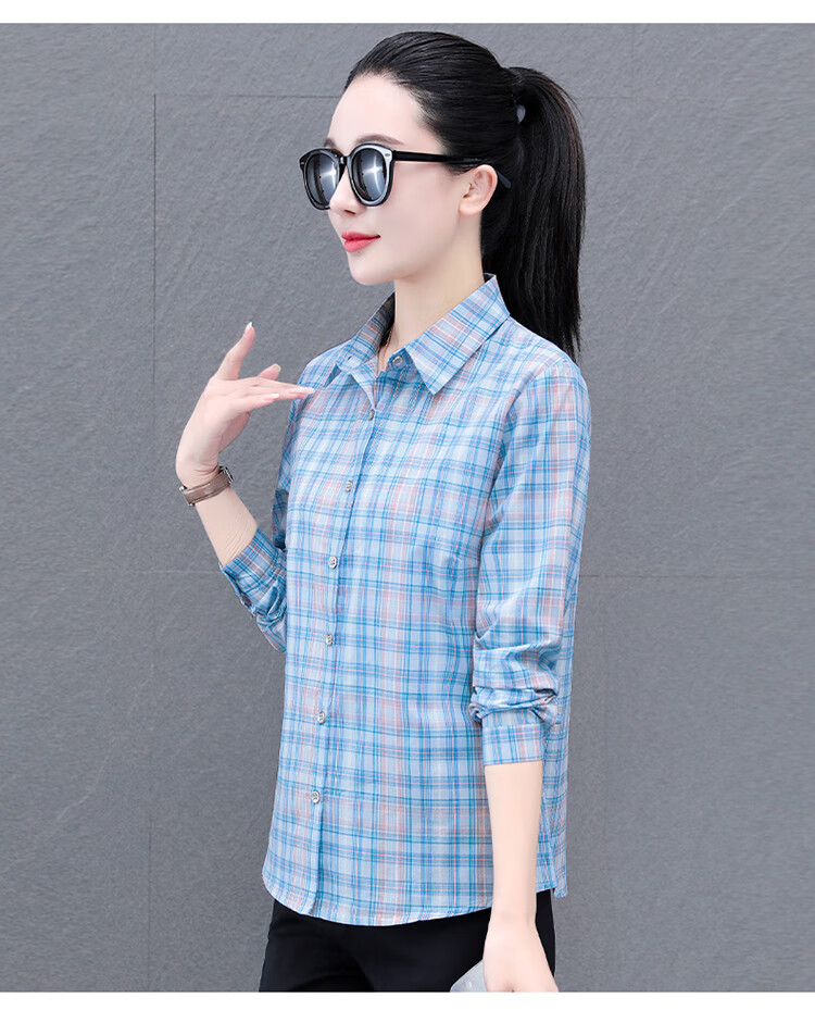 Pure cotton plaid shirt women's spring and autumn new middle-aged mother style long-sleeved temperament lapel slim top light blue 3XL 136-145