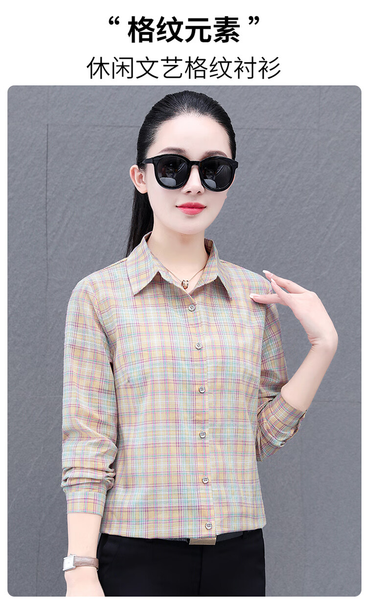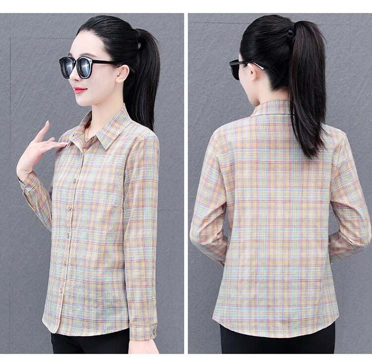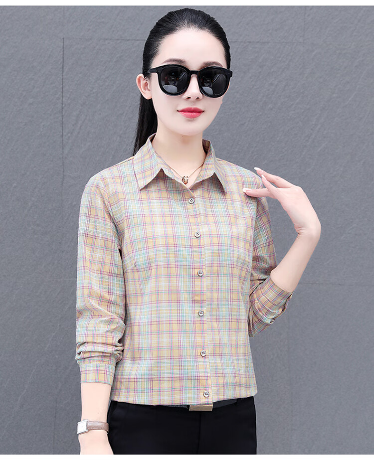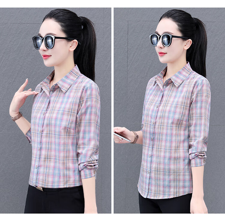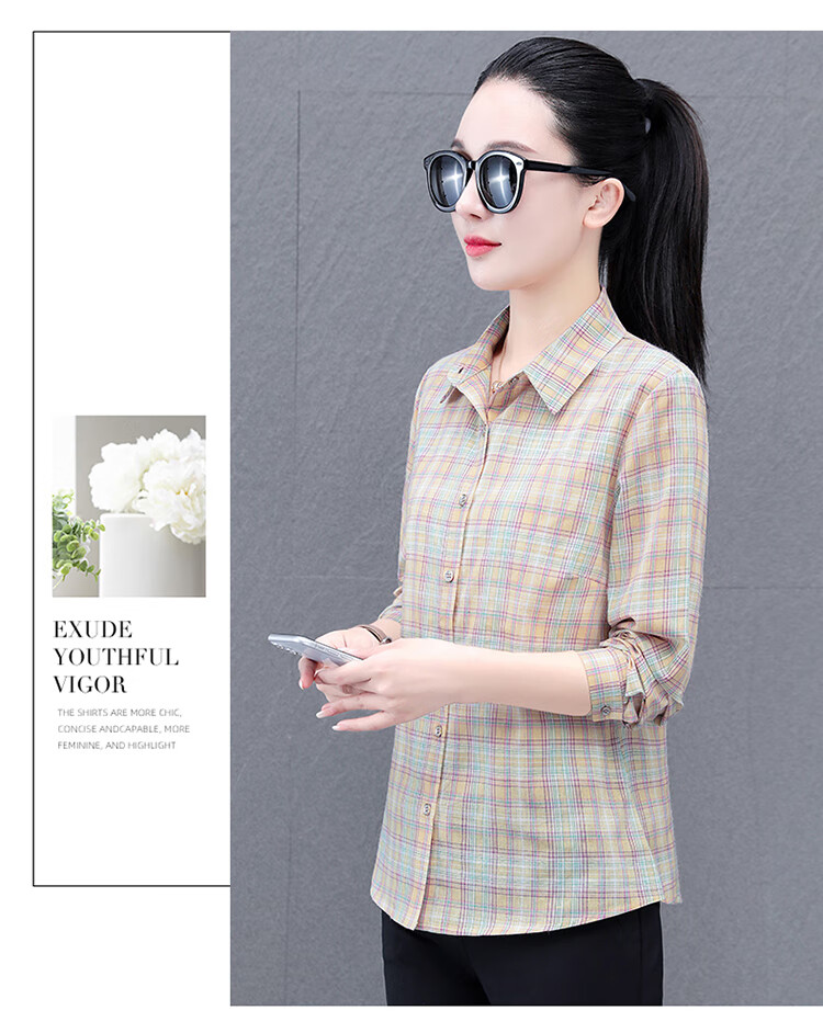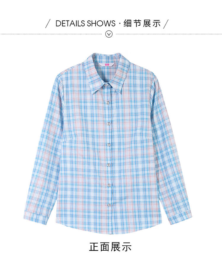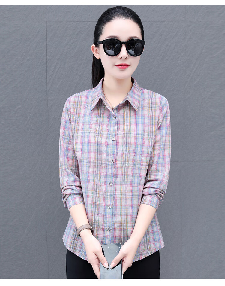 Pure cotton plaid shirt women's spring and autumn new middle-aged mother style long-sleeved temperament lapel slim top light blue 3XL 136-145