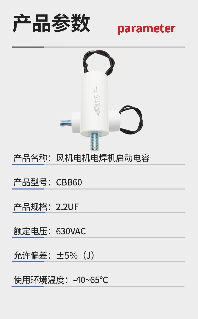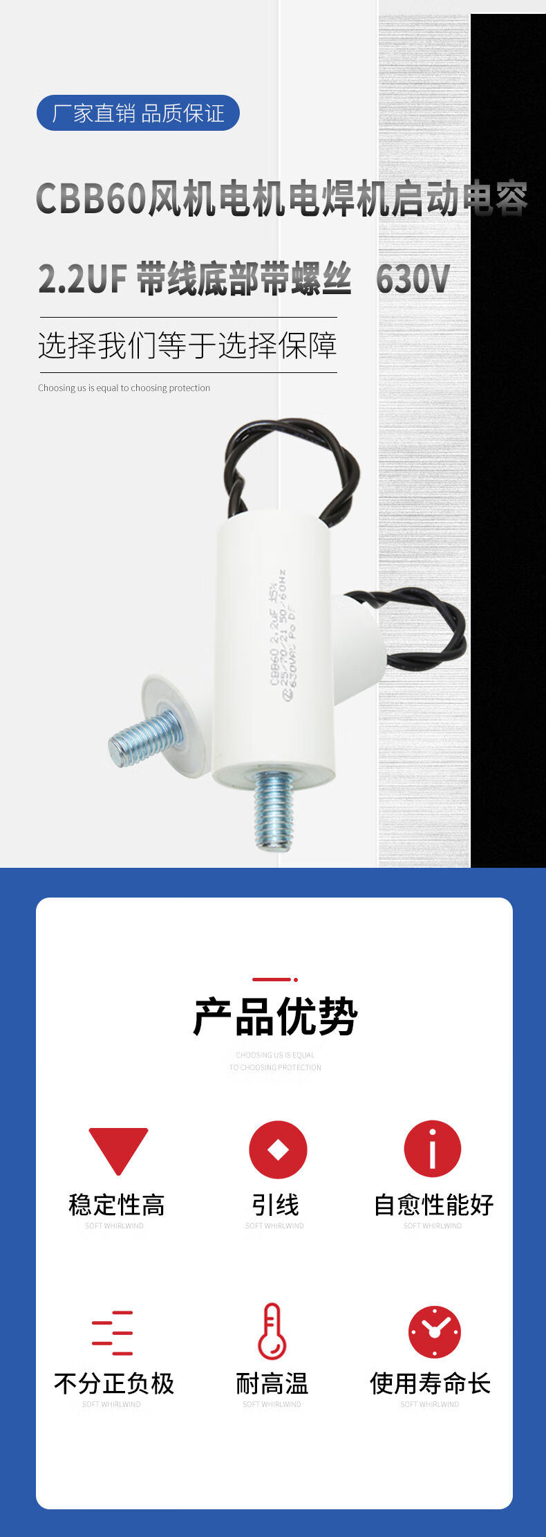 CBB60 2.2UF 630V fan motor starting capacitor welding machine capacitor with wire and screws at the bottom 2.2UF 630V with screws at the bottom