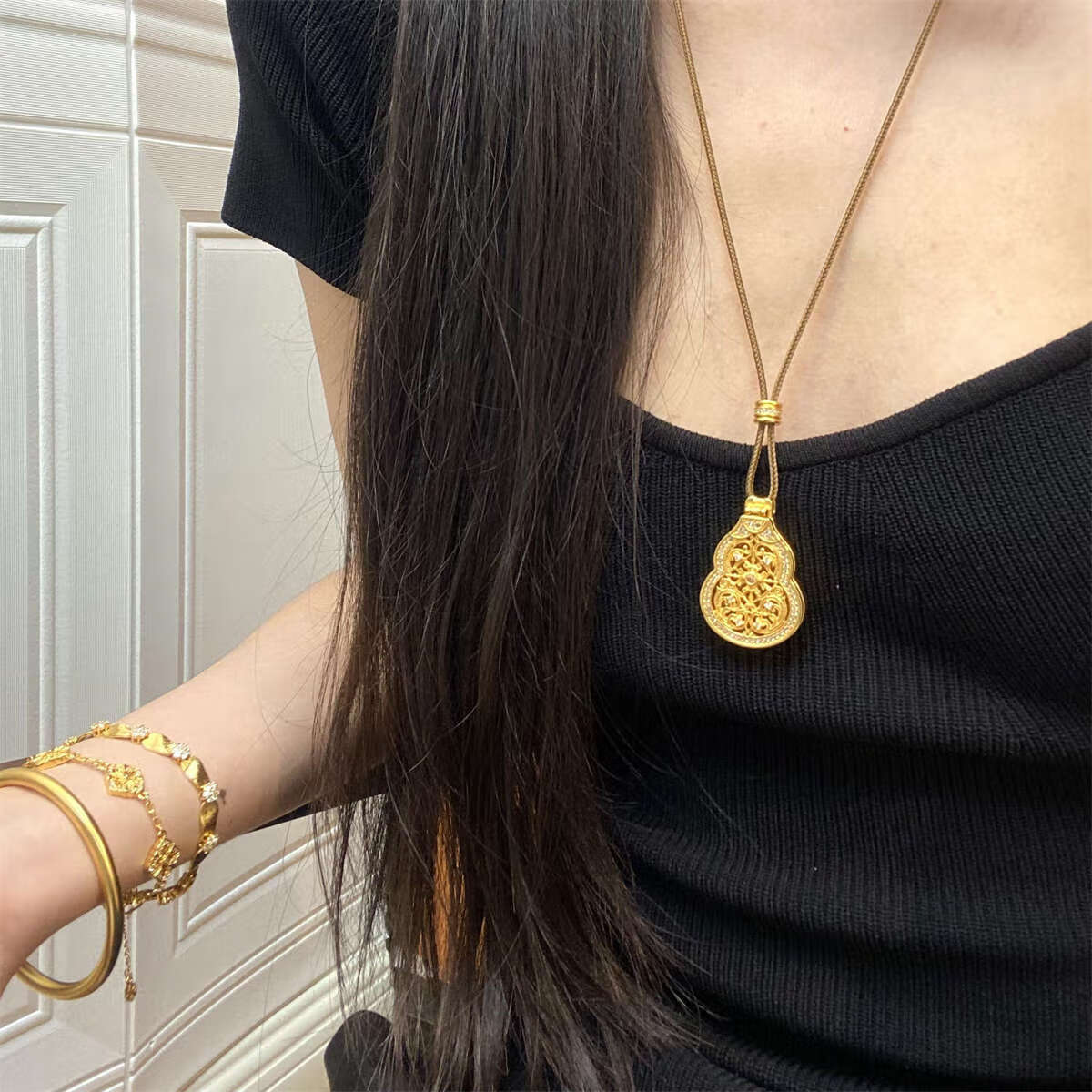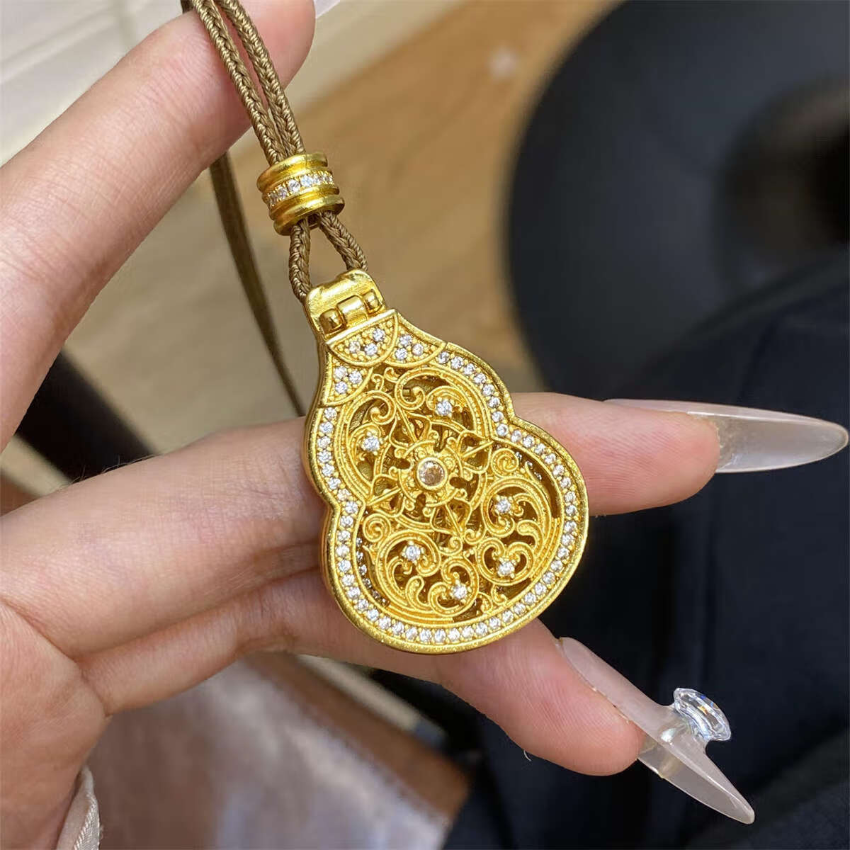 Only pair of retro style Buddha Blessing Gourd Pendant Necklace Ancient Method 18k Gold Autumn and Winter Style Hollow Micro-Inlaid Clavicle Chain Jewelry Accessories Buddha Blessing Gourd Pendant + Coffee Rope