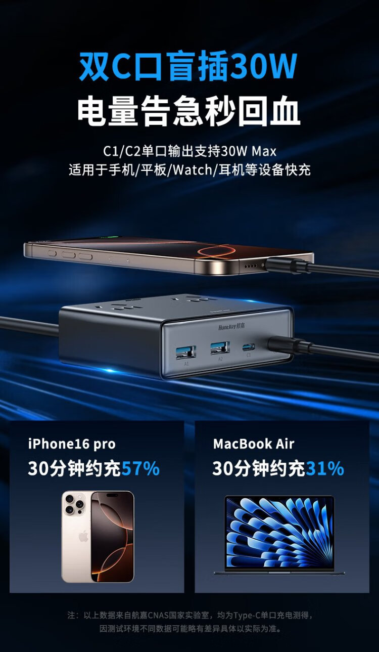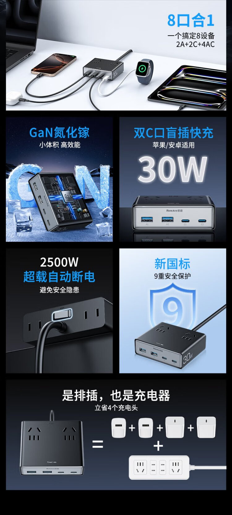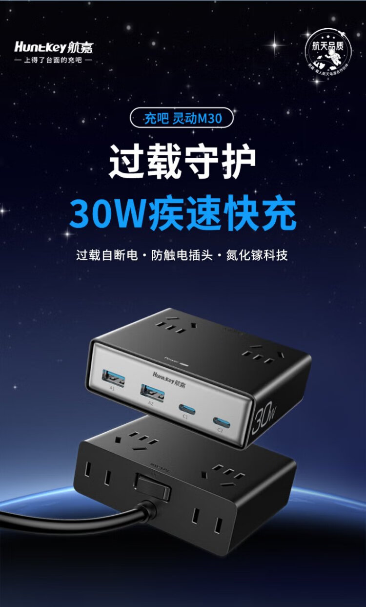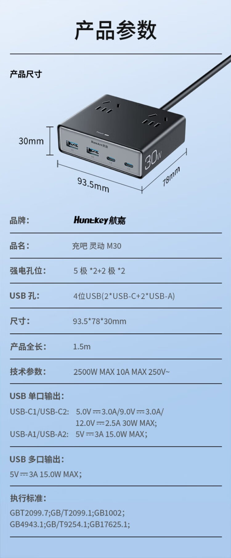 Huntkey Charging Bar Smart M30/M20 Desktop Socket Power Strip USB Fast Charging Plug Board Charging Station Gallium Nitride 30W Multi-port Portable Typec Multi-function Bedside Anti-overload Power Strip 20W 8-in-1 Charging Station - Total Length 1.5 Meters Aerospace Quality New National Standard
