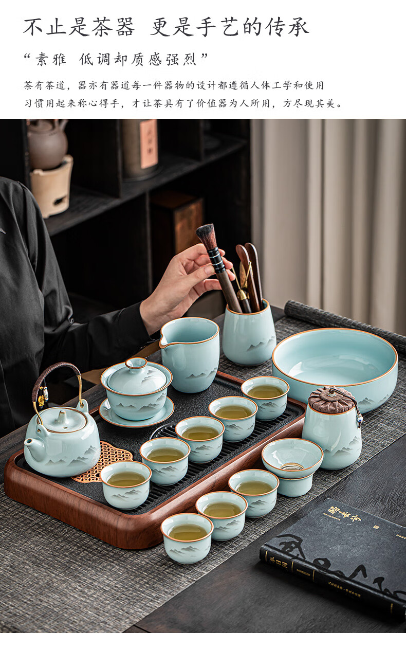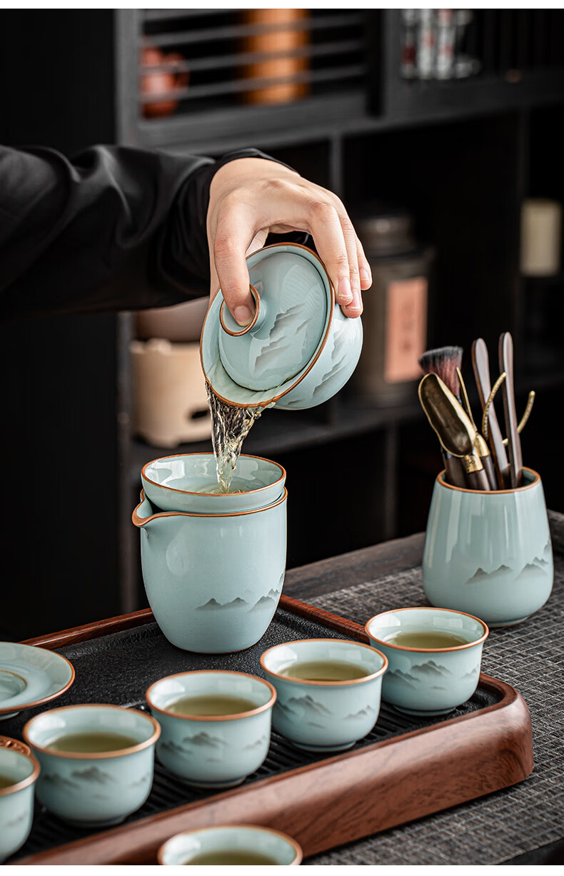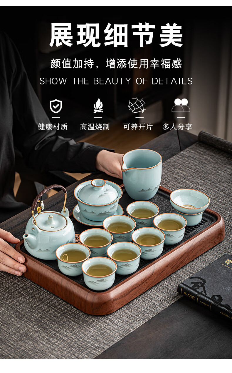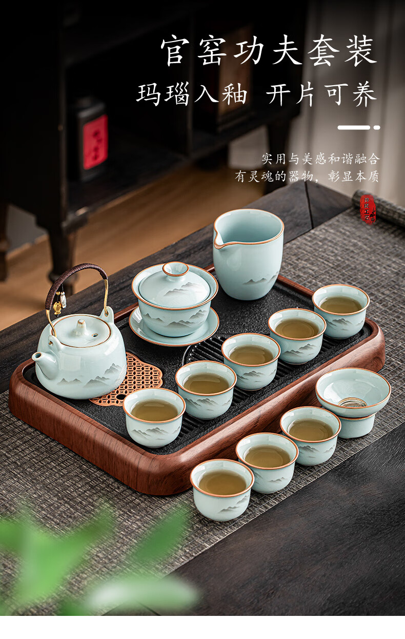 Porcelain brand tea set, official kiln ink and wash Guanshan tea set, complete set of high-end ceramic Kung Fu tea set, open piece can be used to grow teapot and bowl, ink and wash Guanshan lifting beam teapot and bowl, 8 cups, 13 pieces + tea tray