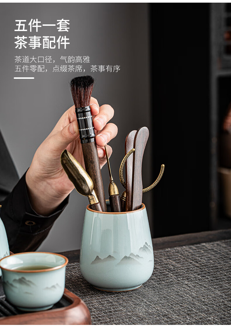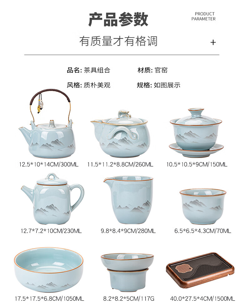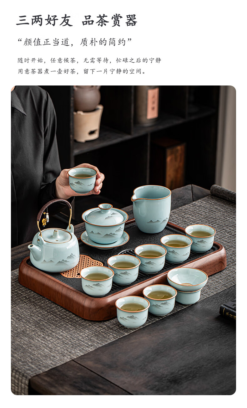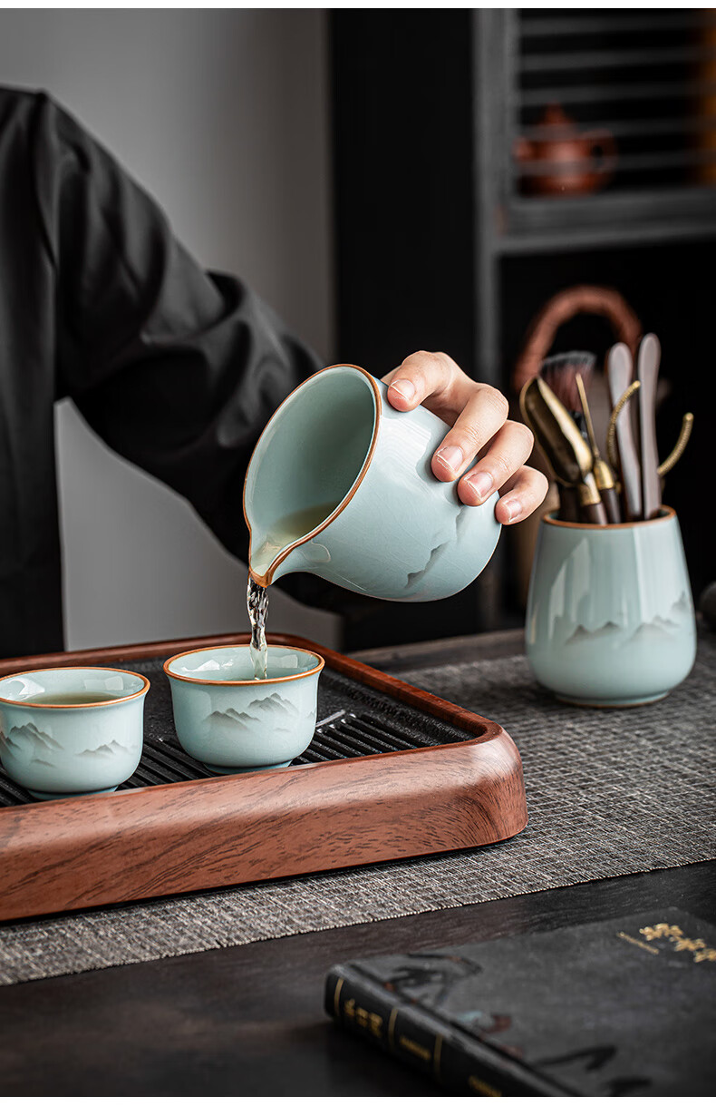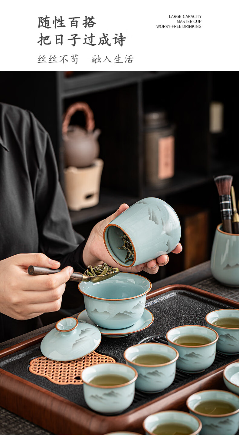 Porcelain brand tea set, official kiln ink and wash Guanshan tea set, complete set of high-end ceramic Kung Fu tea set, open piece can be used to grow teapot and bowl, ink and wash Guanshan lifting beam teapot and bowl, 8 cups, 13 pieces + tea tray