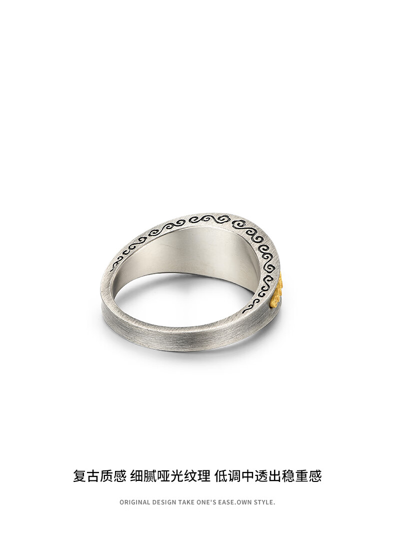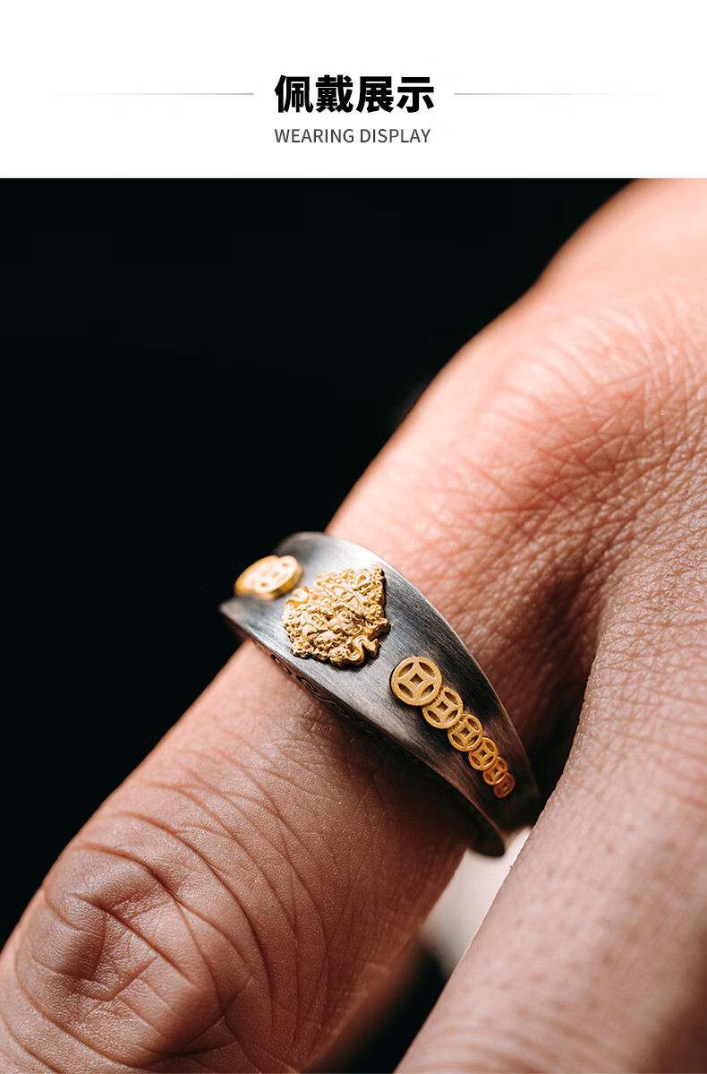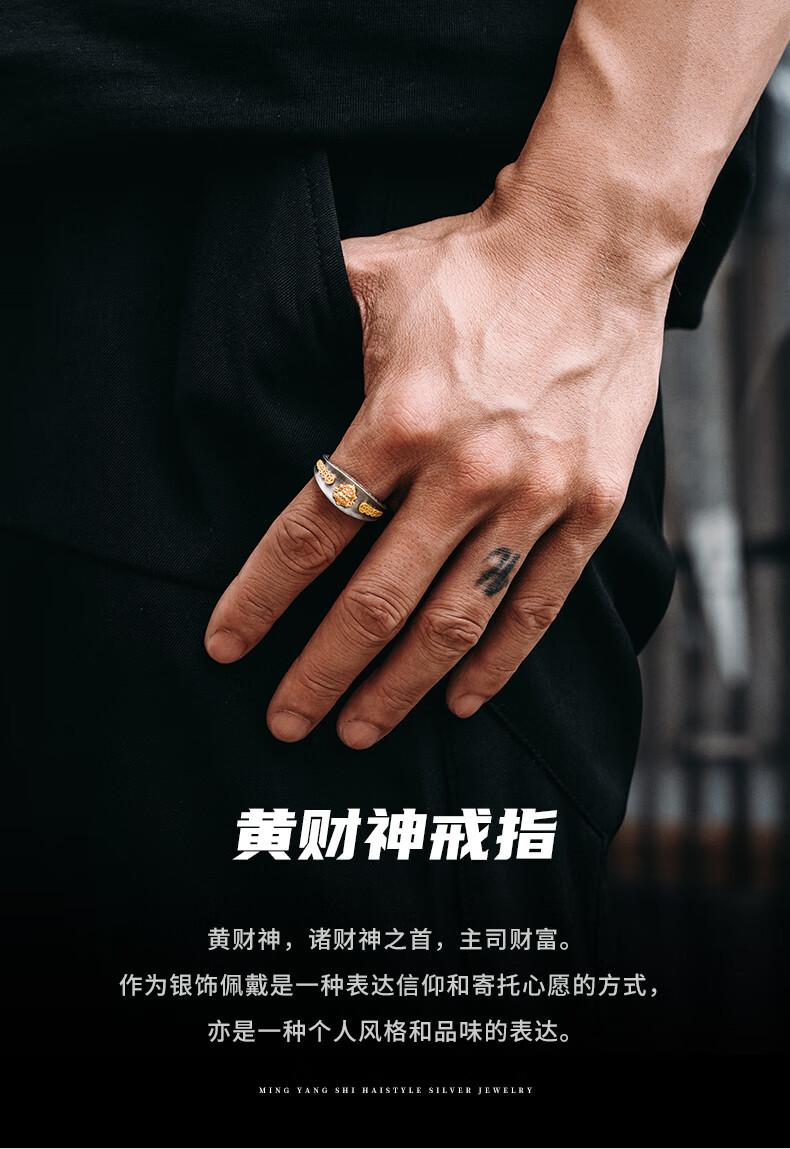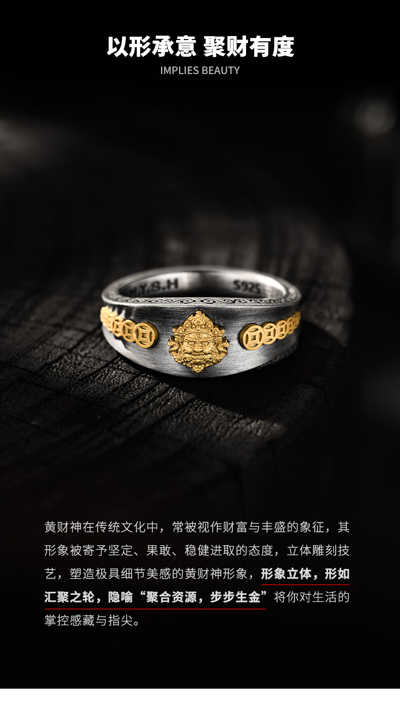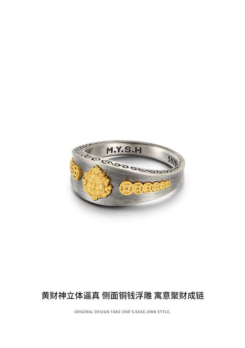 Mingyang Decoration Sea 925 sterling silver 3D yellow God of Wealth ring men's high-end retro original design national trend index finger ring US size 11# (suitable for Hong Kong sizes 25-26)