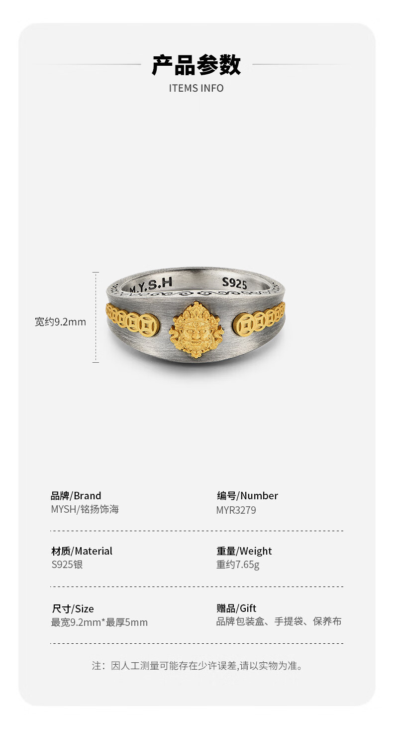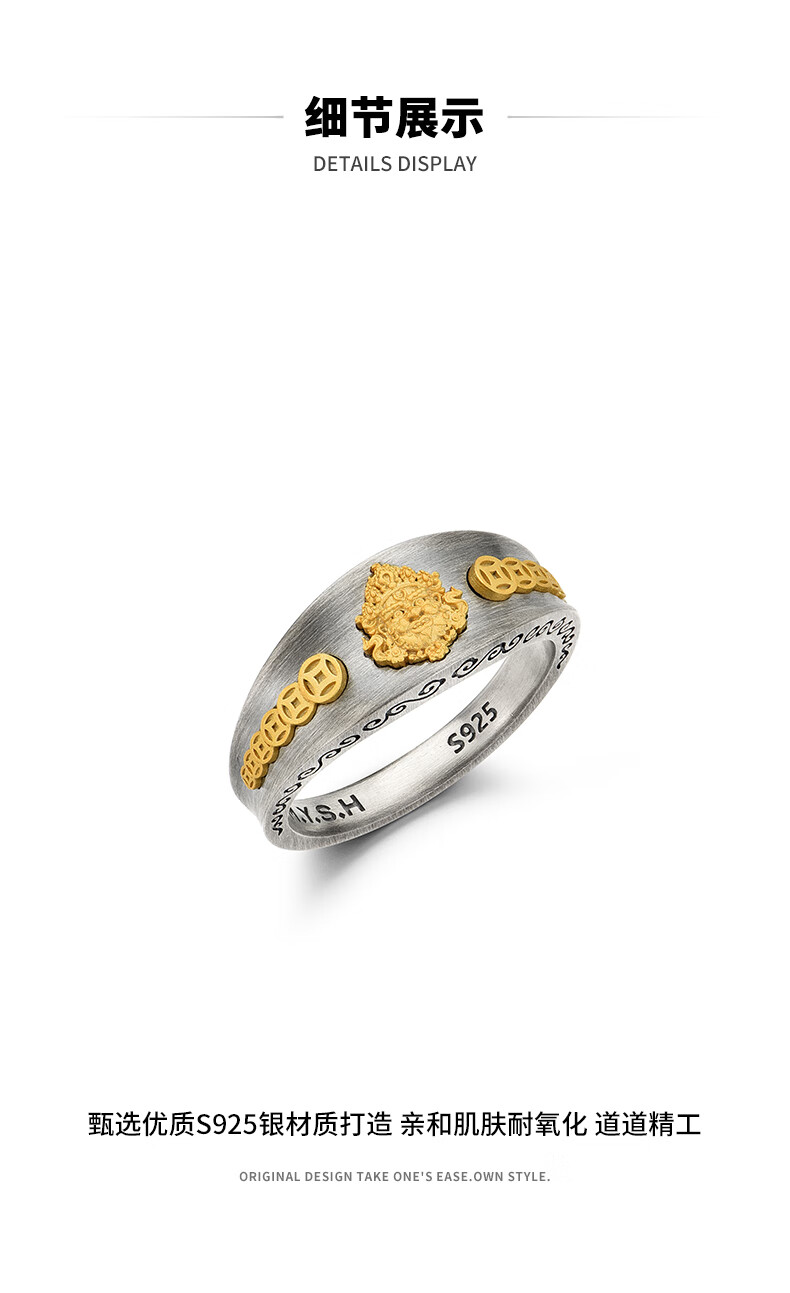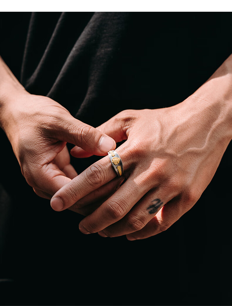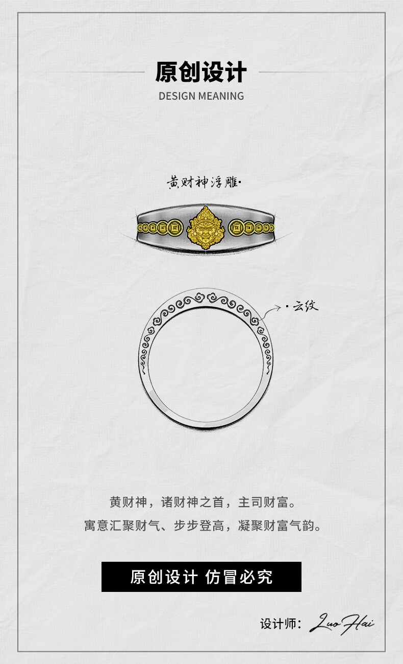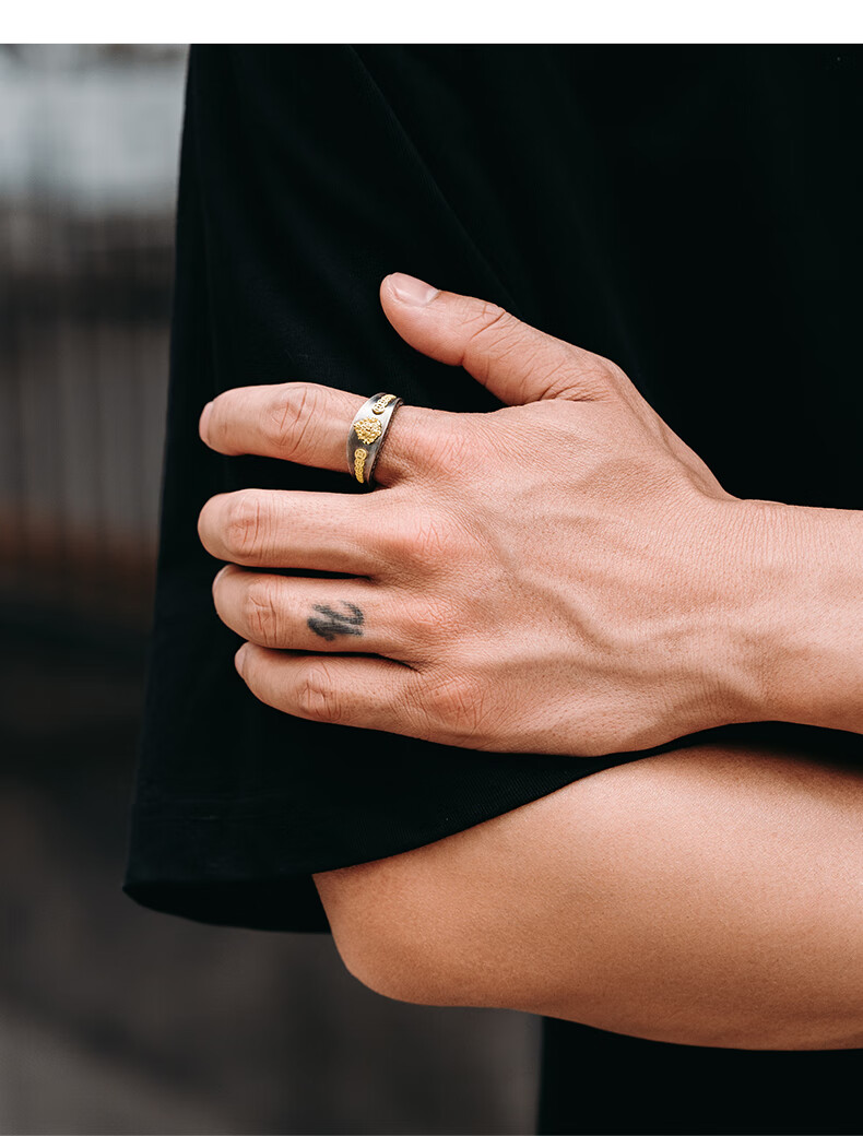 Mingyang Decoration Sea 925 sterling silver 3D yellow God of Wealth ring men's high-end retro original design national trend index finger ring US size 11# (suitable for Hong Kong sizes 25-26)