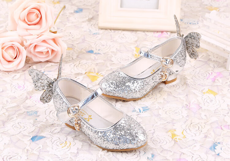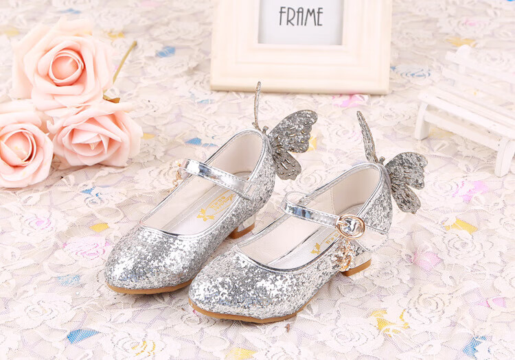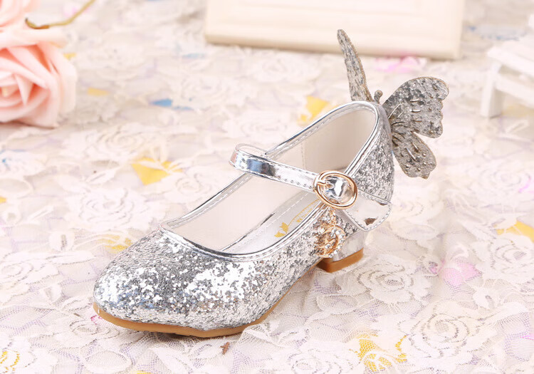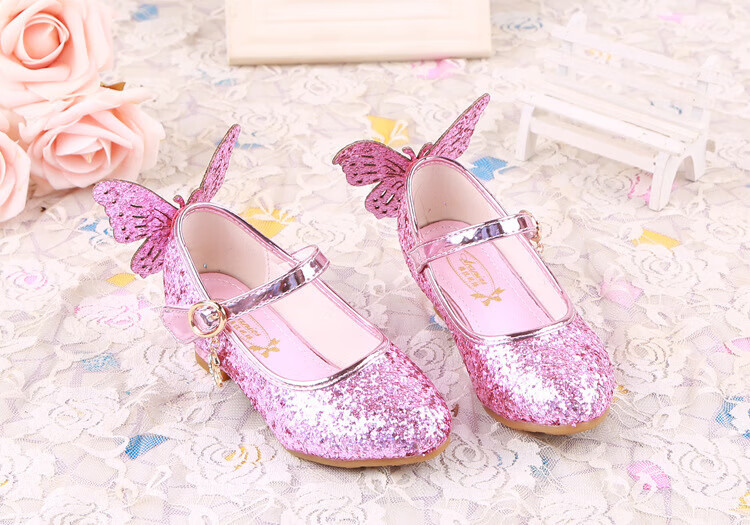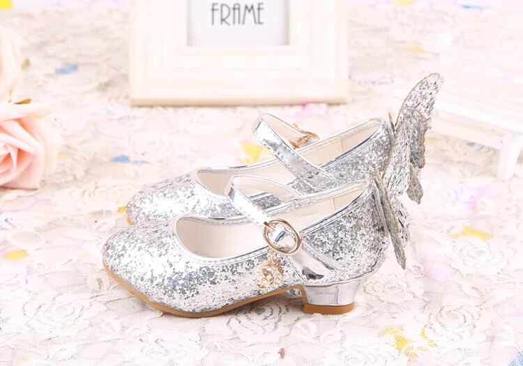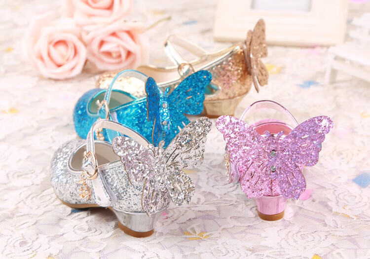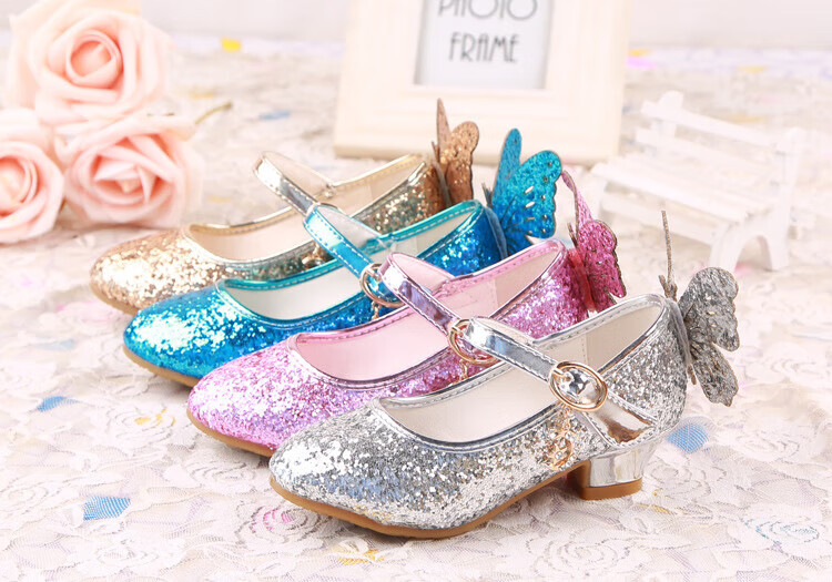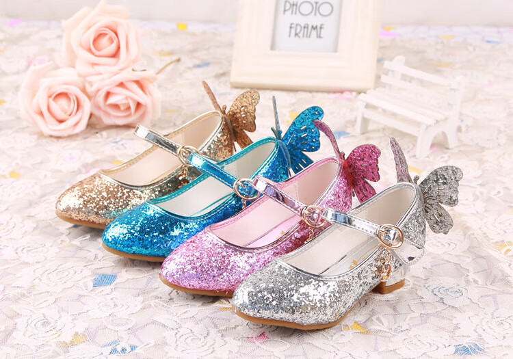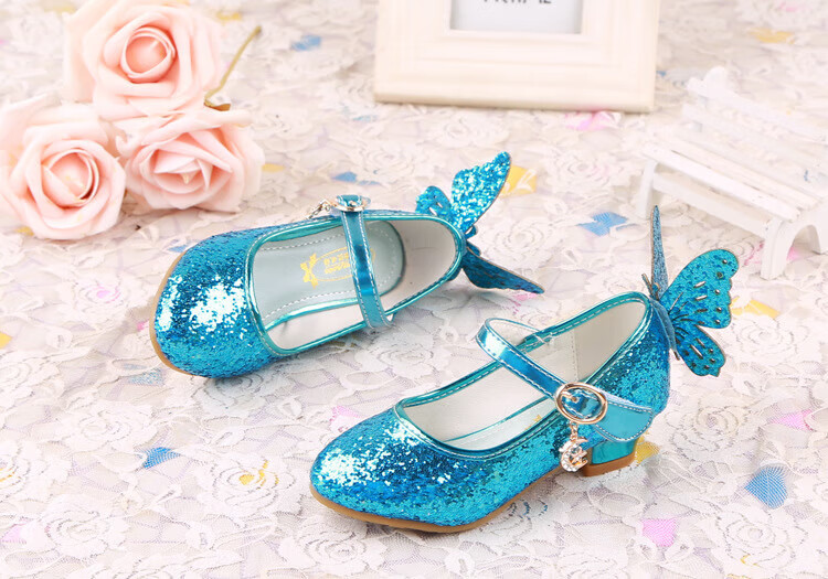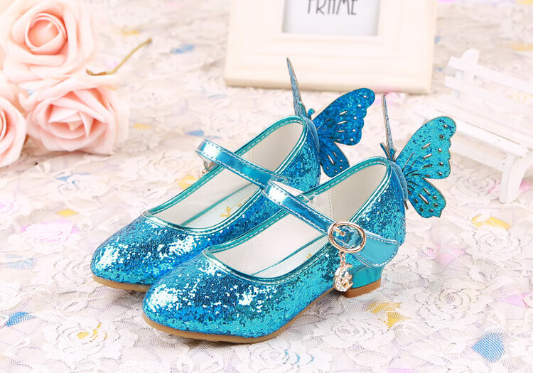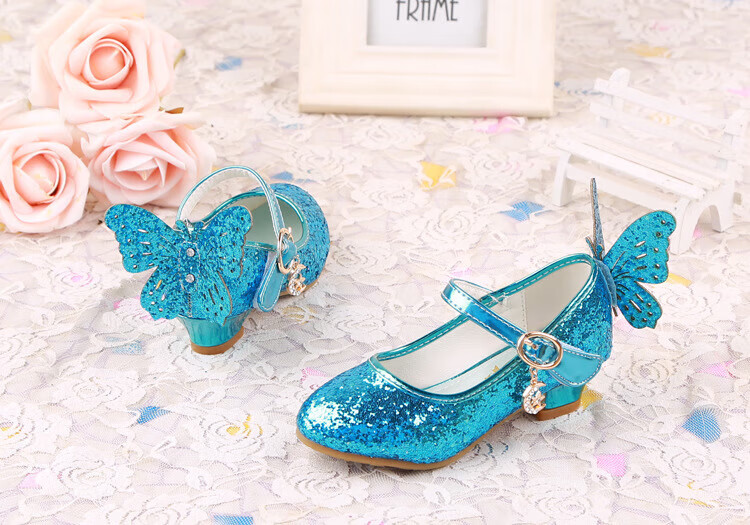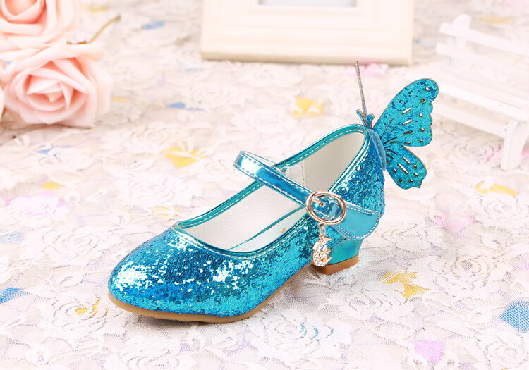 BAOZOUXIE Girls' Single Shoes Butterfly Princess Shoes Children's High-heeled Leather Shoes Little Girls Crystal Shoes Host Dance Performance Blue Size 31 Shoes Inner Length 19.5cm