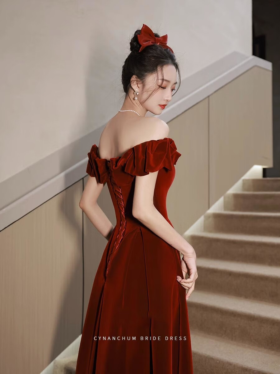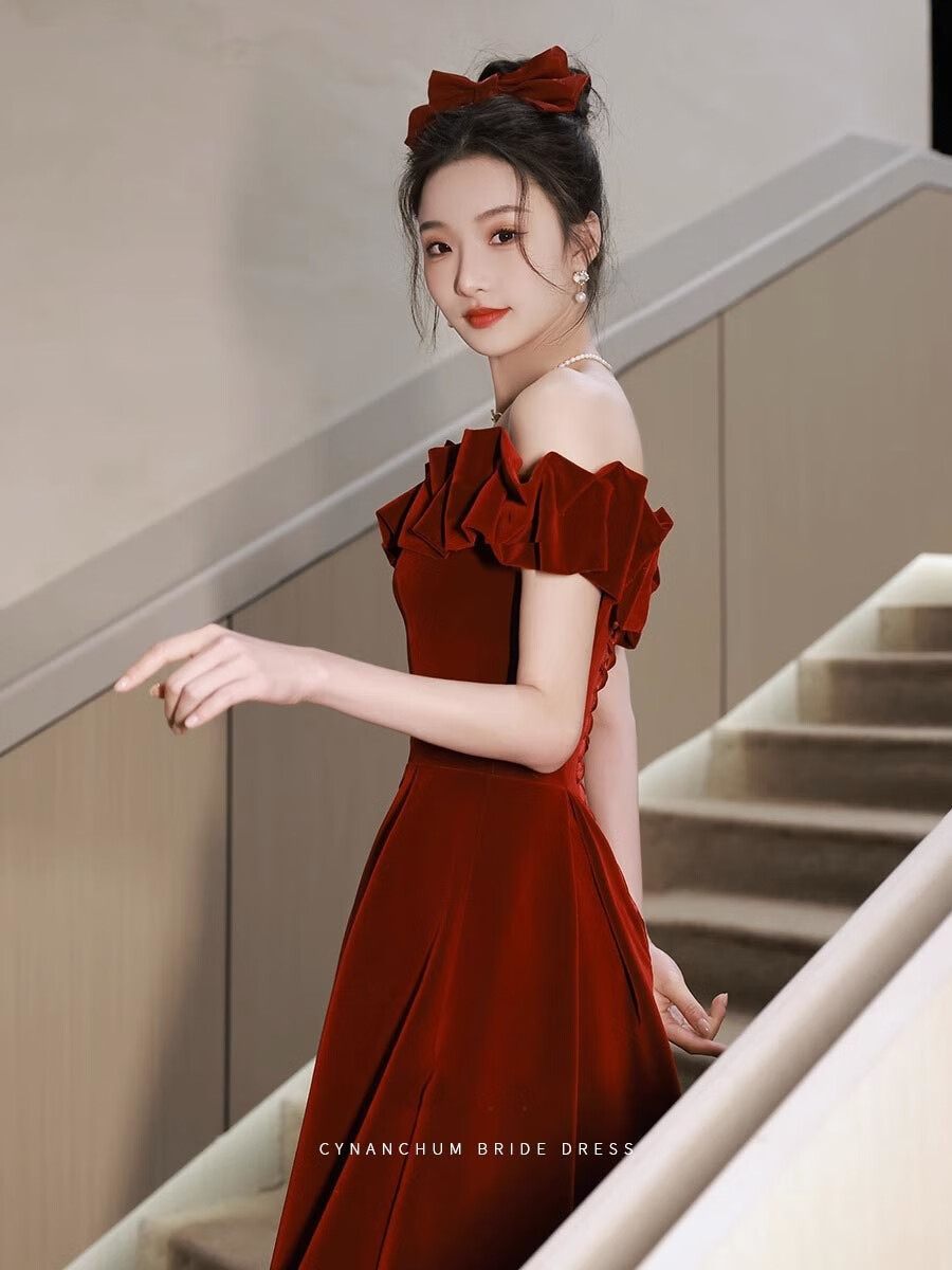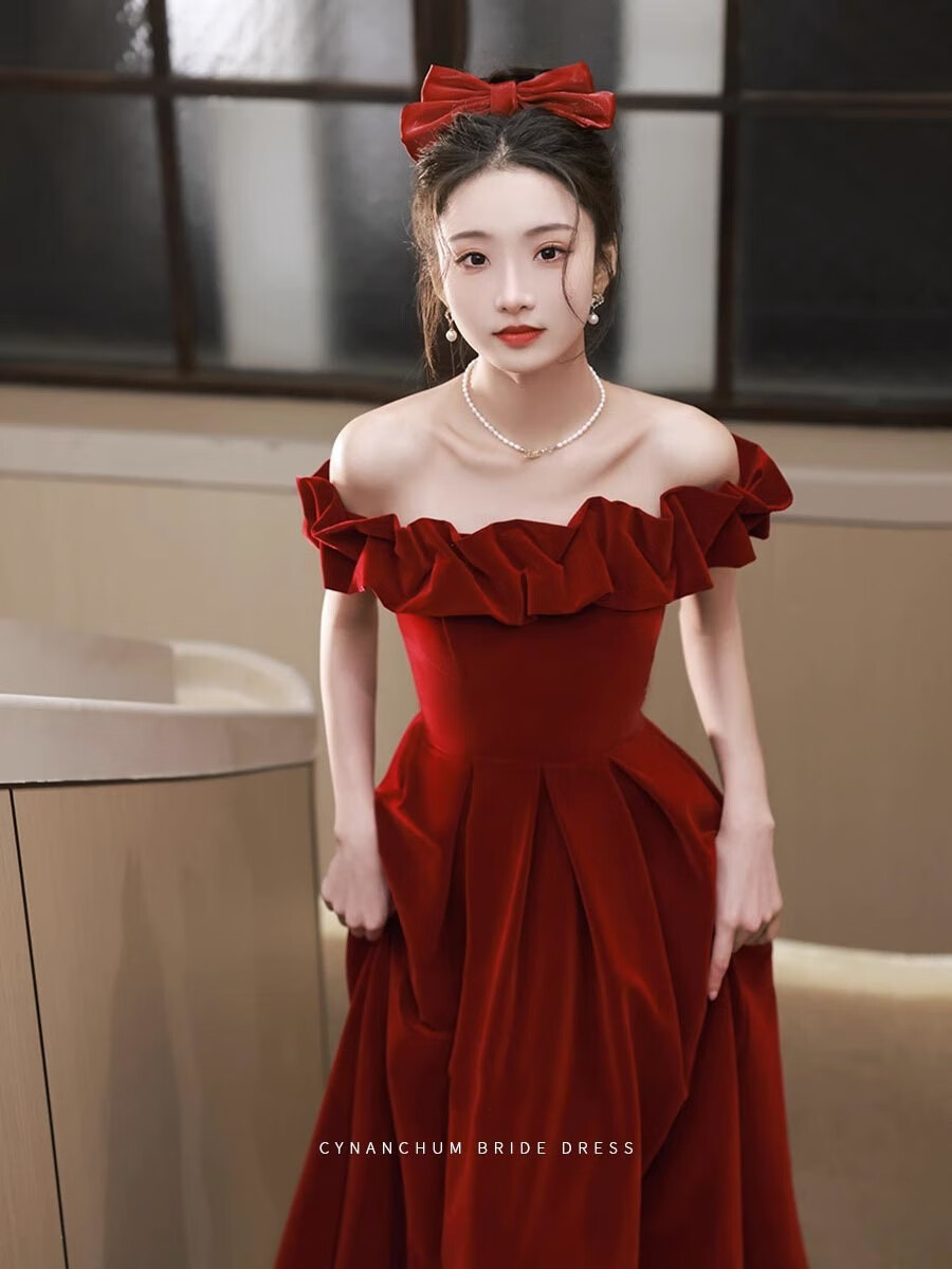 Cha Xiao'a one-shoulder engagement dress for women 2025 new toast dress bride can usually wear wedding dress back to the door banquet burgundy L