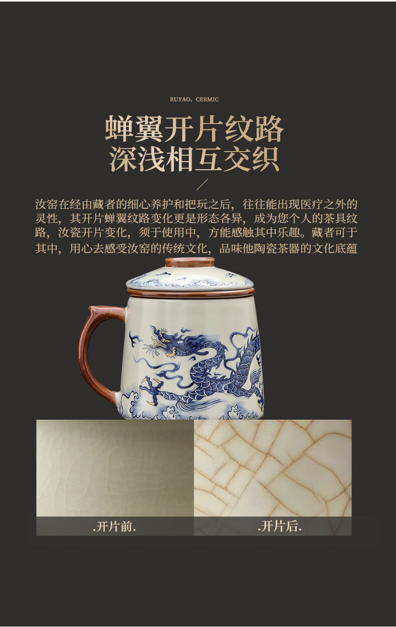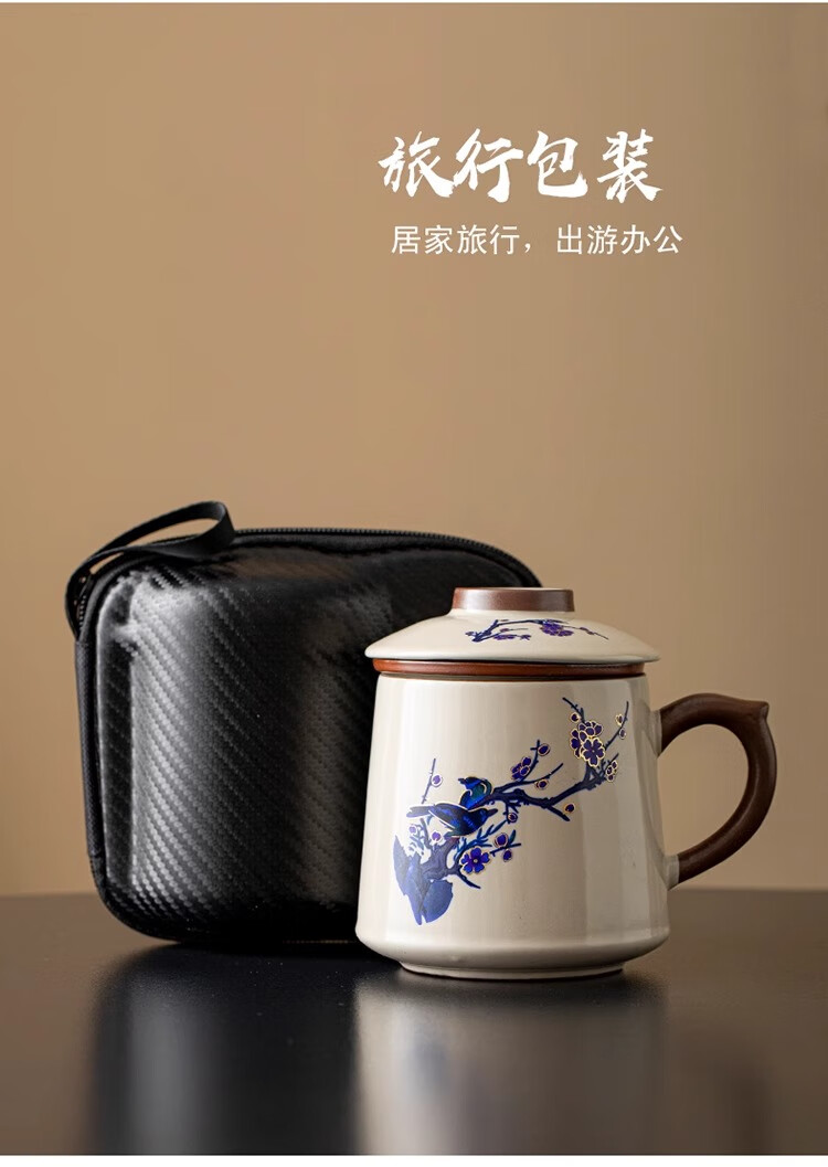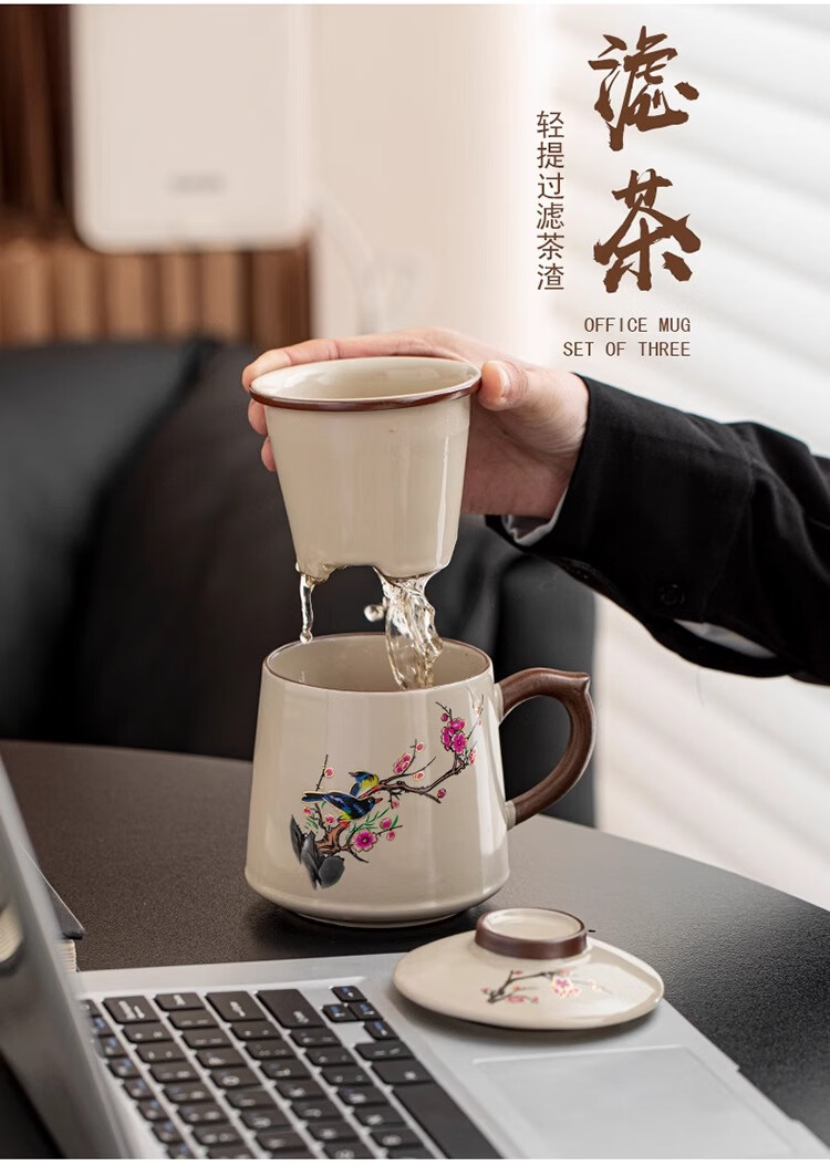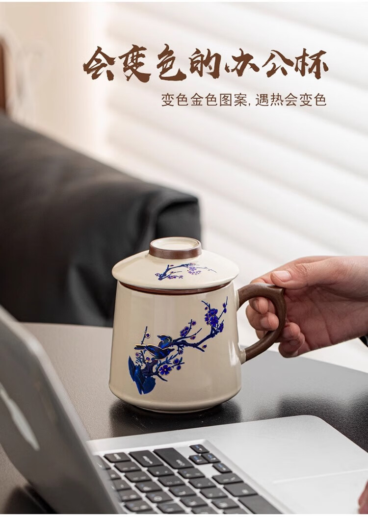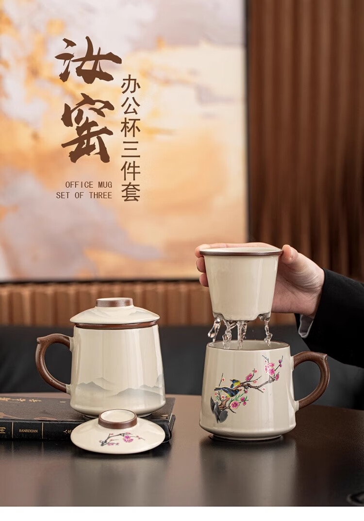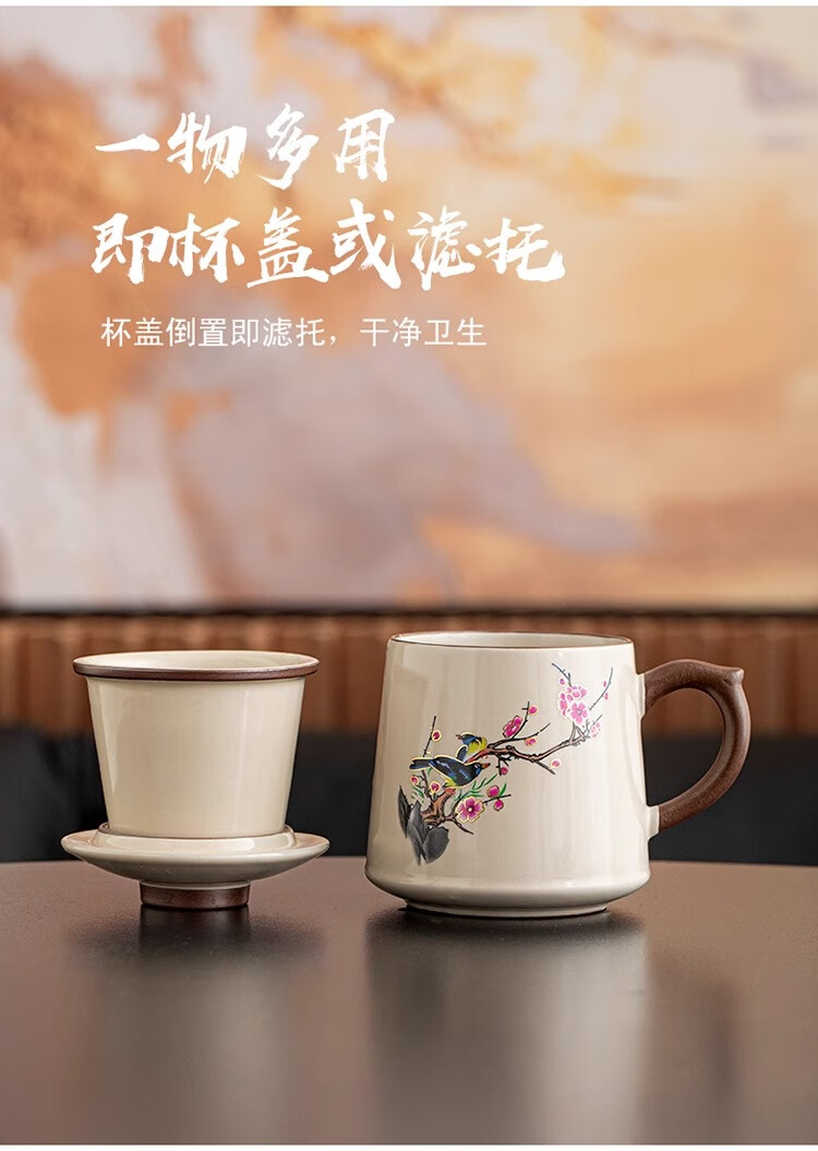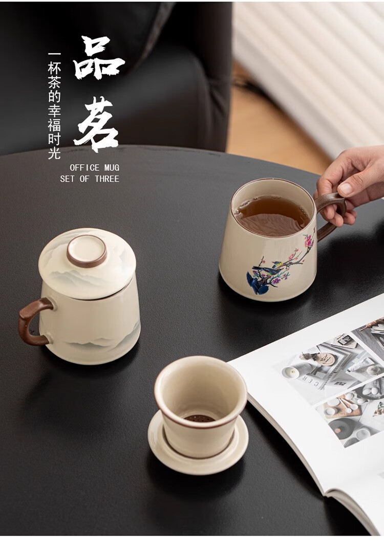 Ru Kiln Tea Cup Large Capacity Office Cup Chinese Tea Separator Cup Color Changing Mug Filtered Tea Cup with Lid Ceramic Ru Kiln Landscape Painting Office Cup