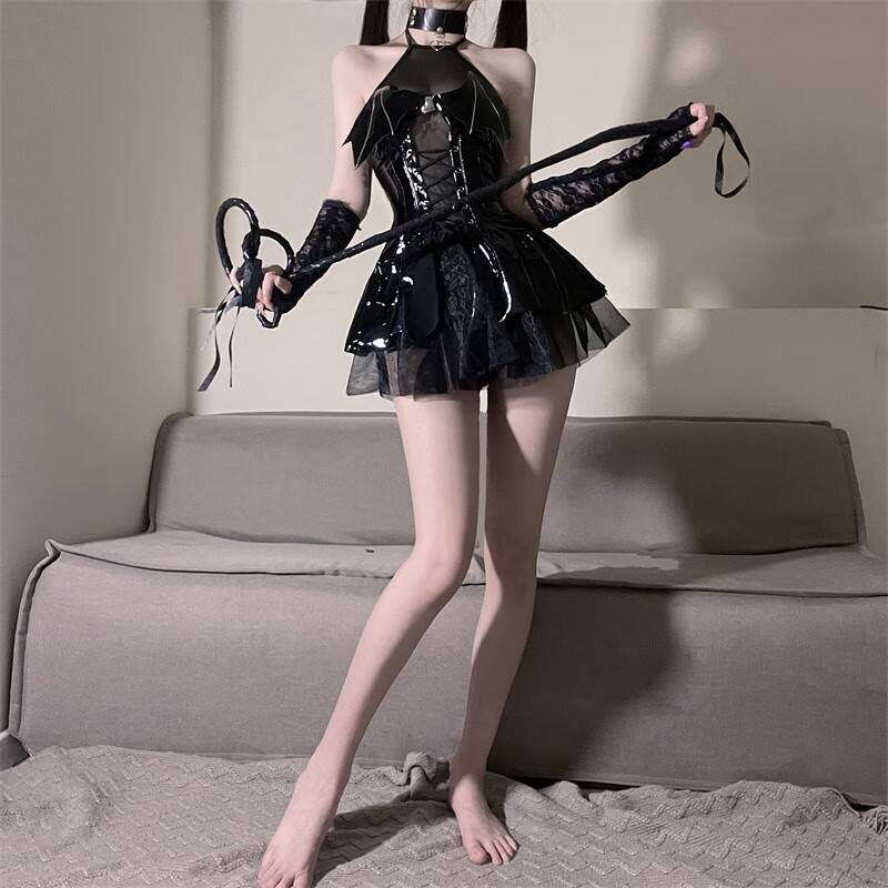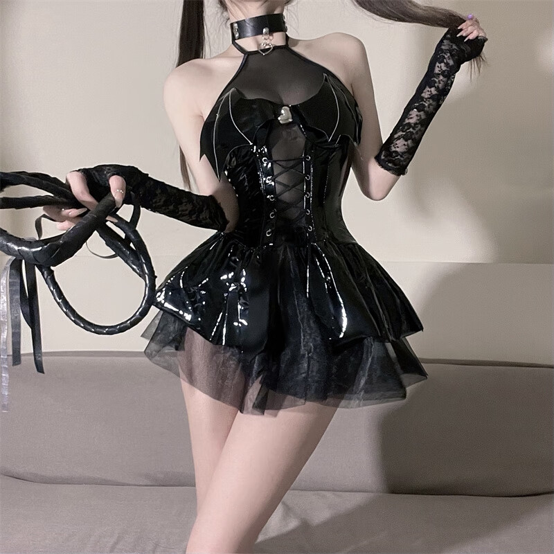 Sexy glossy PU halter neck bandage little devil cos women's Lolita succubus jumpsuit see-through short skirt uniform suit black (dress + neck ring + thong L