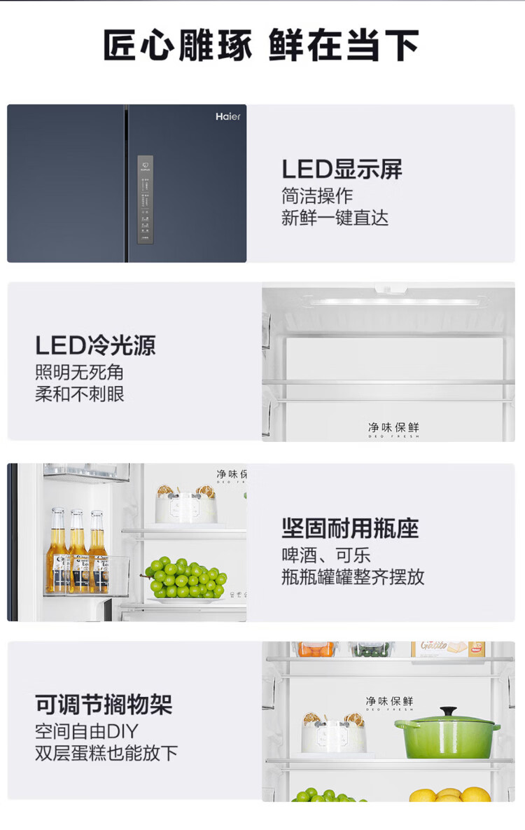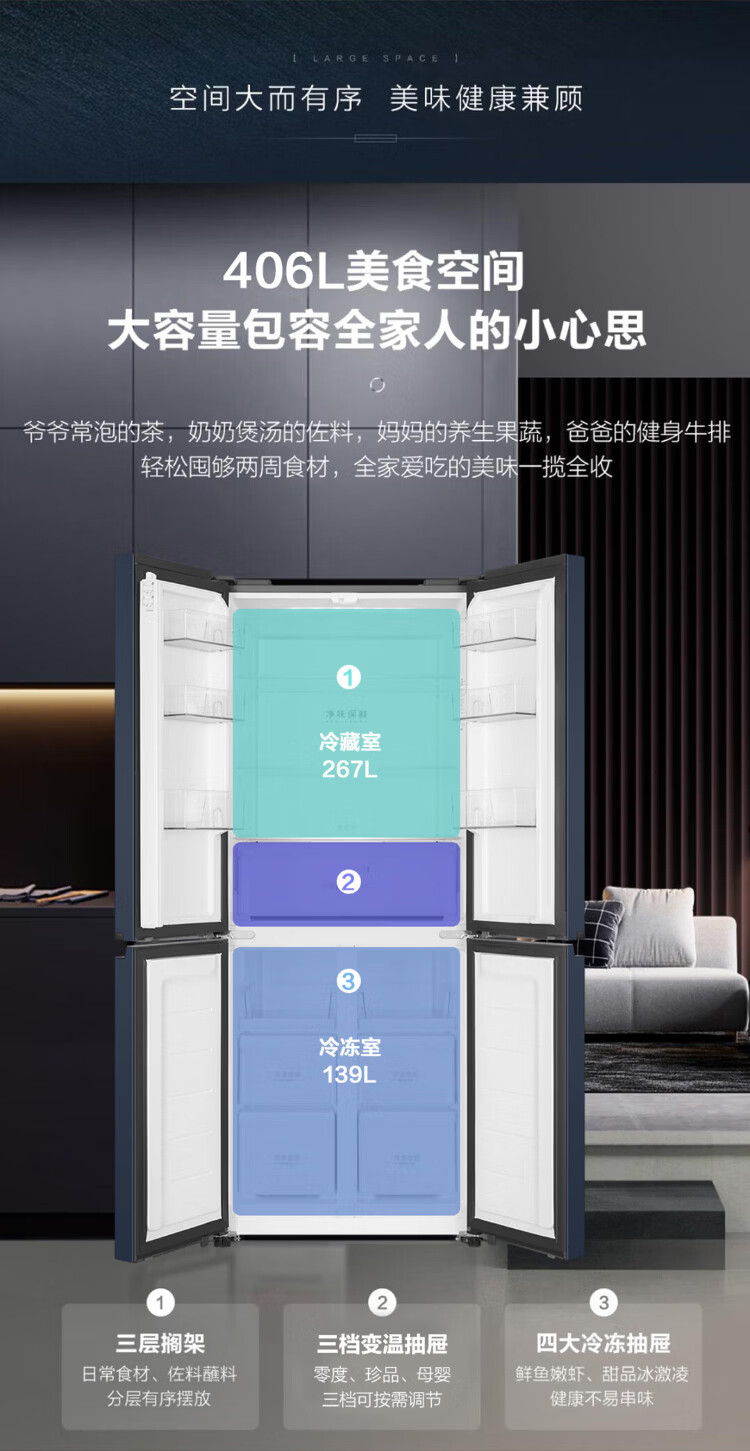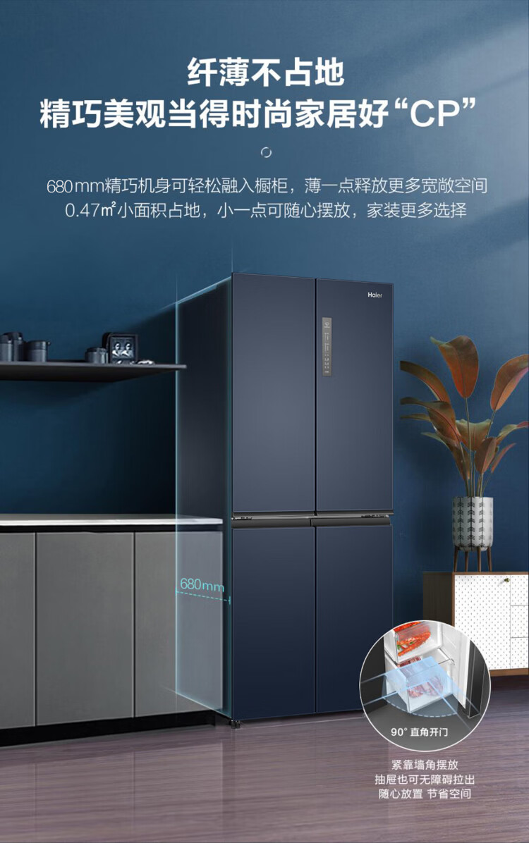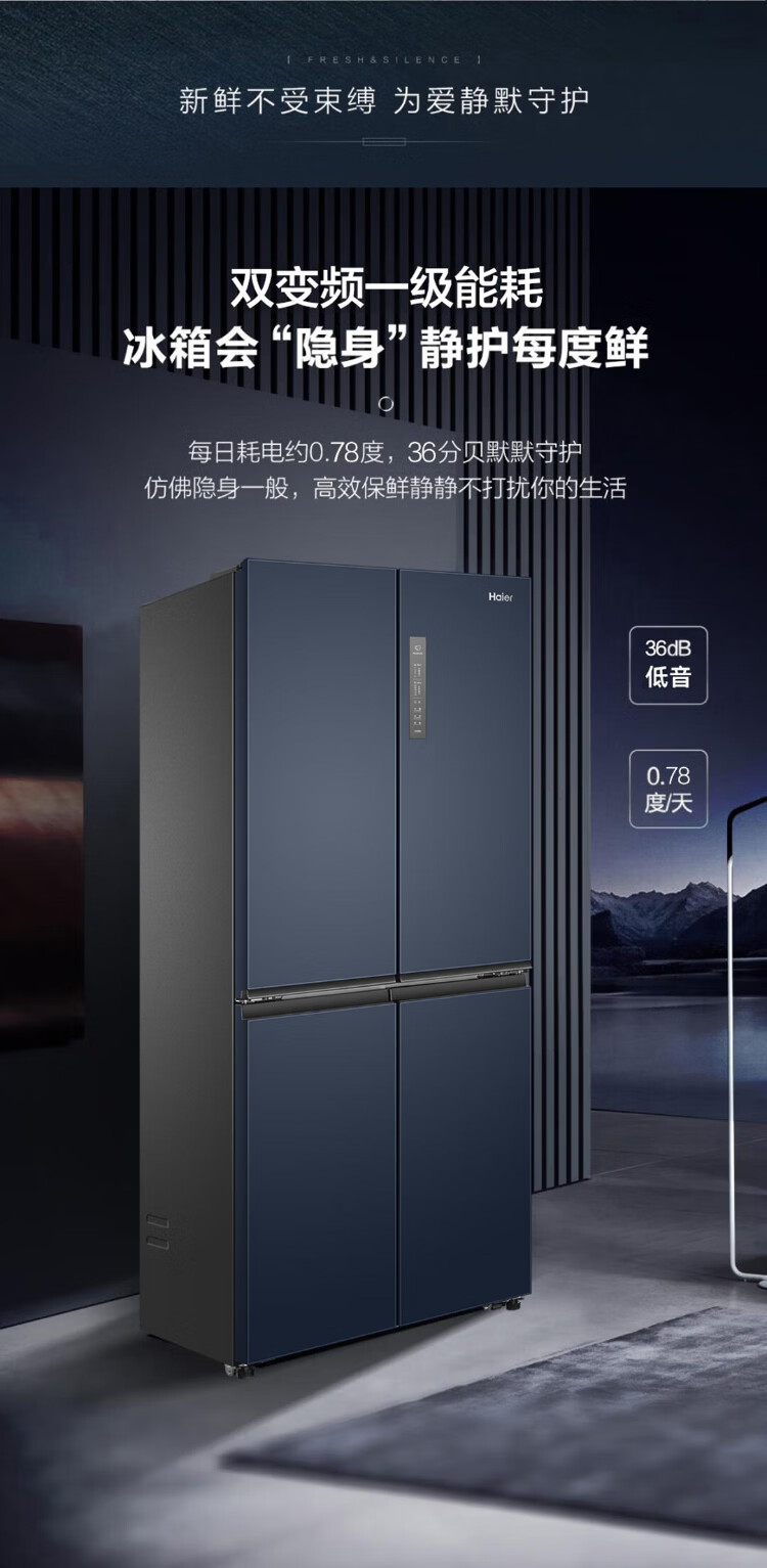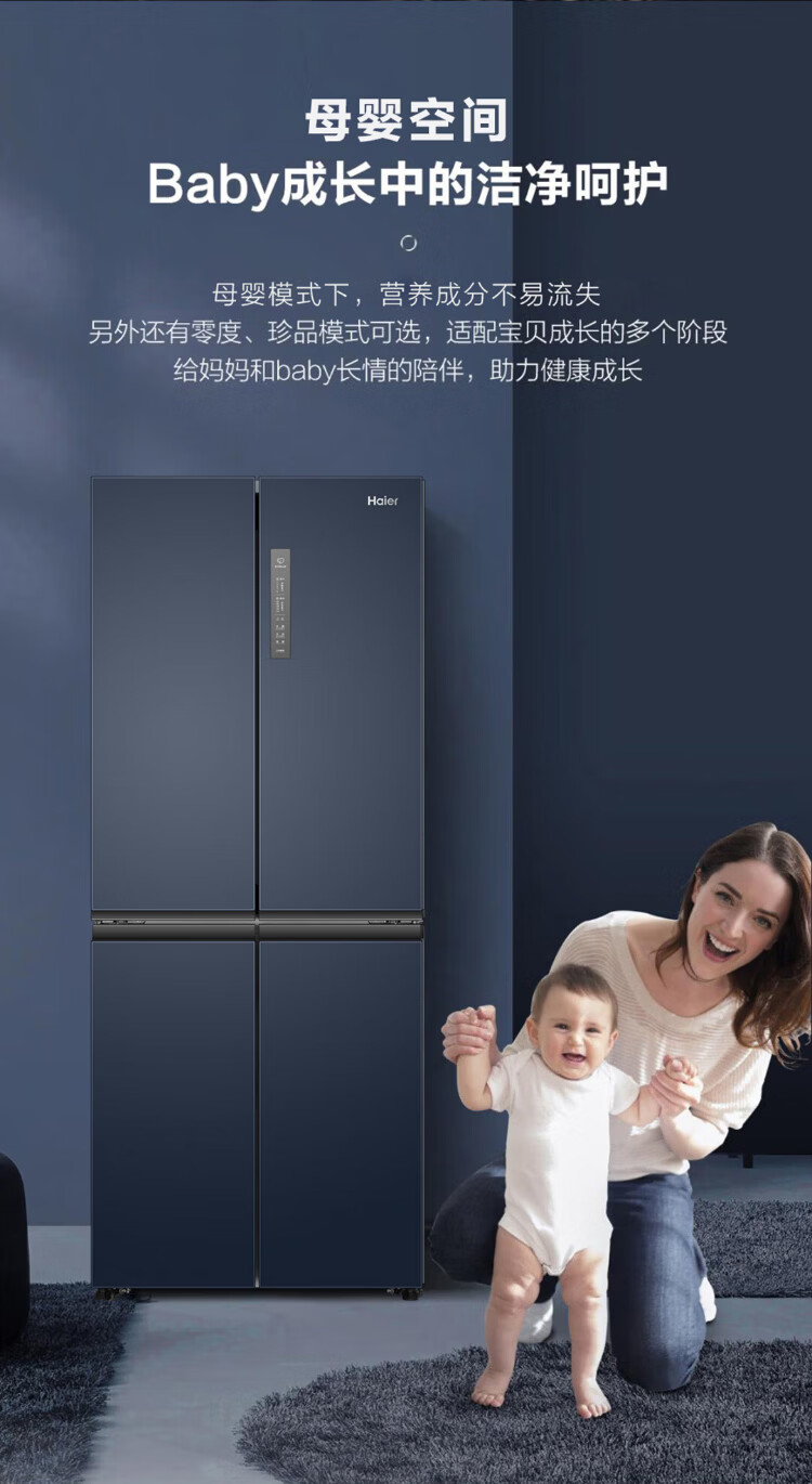 海尔母婴冰箱406升十字门四开门风冷无霜双变频节能一级能效干湿分储冰箱双排轴家用大容量智能空间 海尔406升无霜+净味保鲜+专属母婴空间【热销】