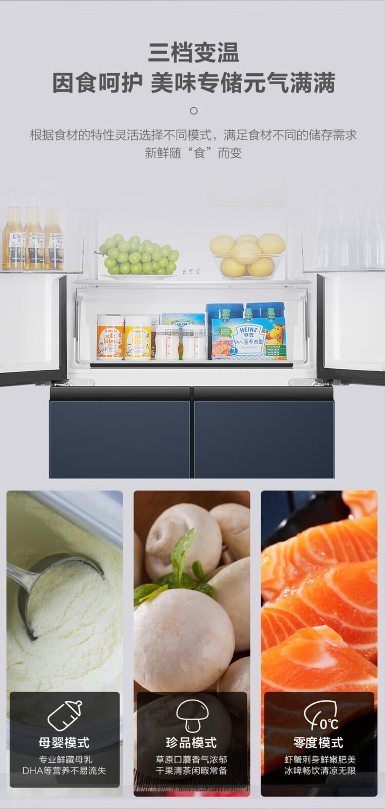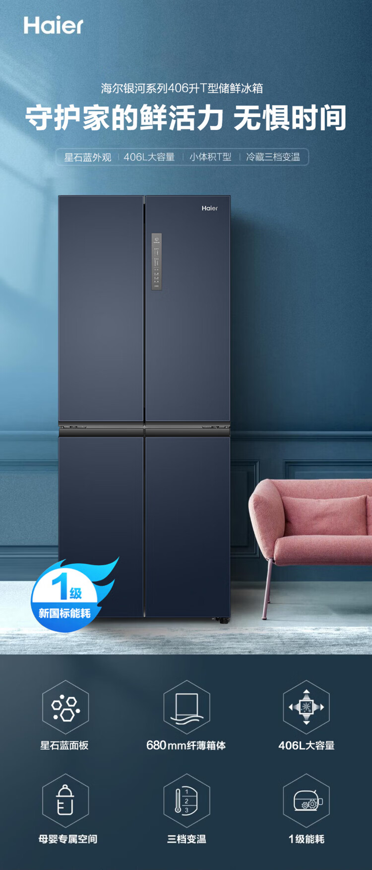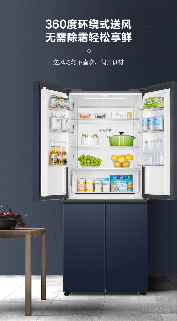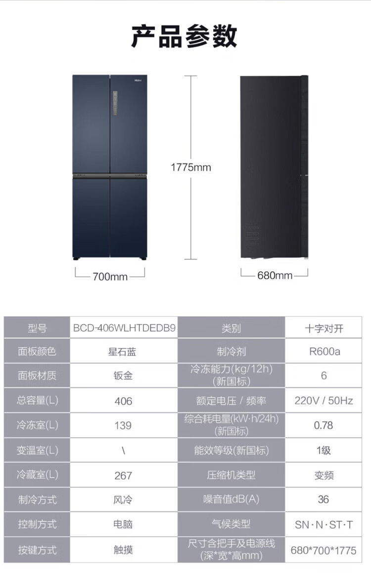 海尔母婴冰箱406升十字门四开门风冷无霜双变频节能一级能效干湿分储冰箱双排轴家用大容量智能空间 海尔406升无霜+净味保鲜+专属母婴空间【热销】
