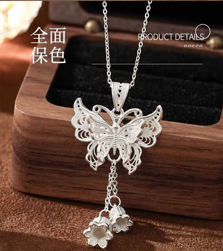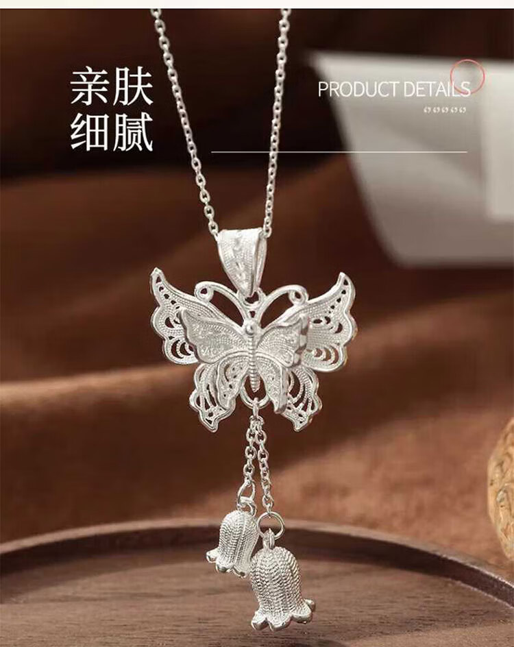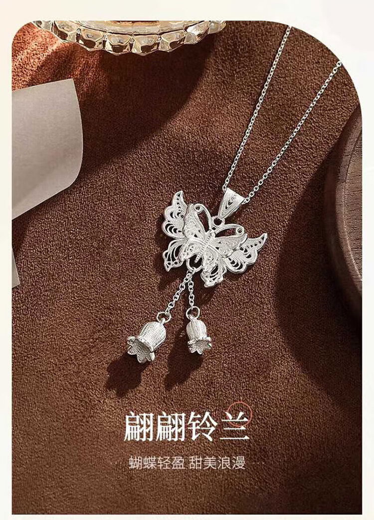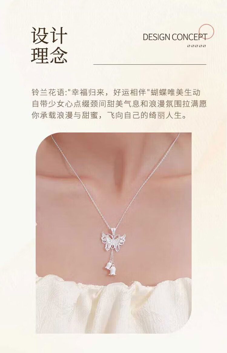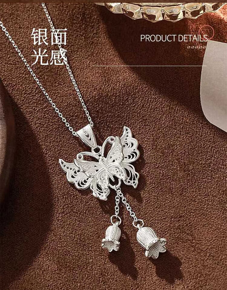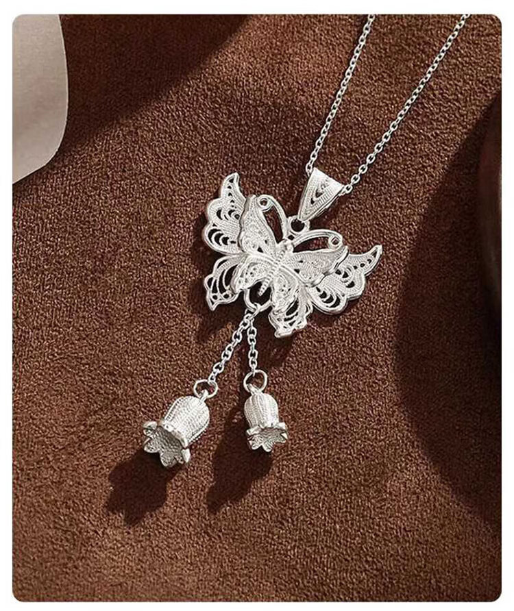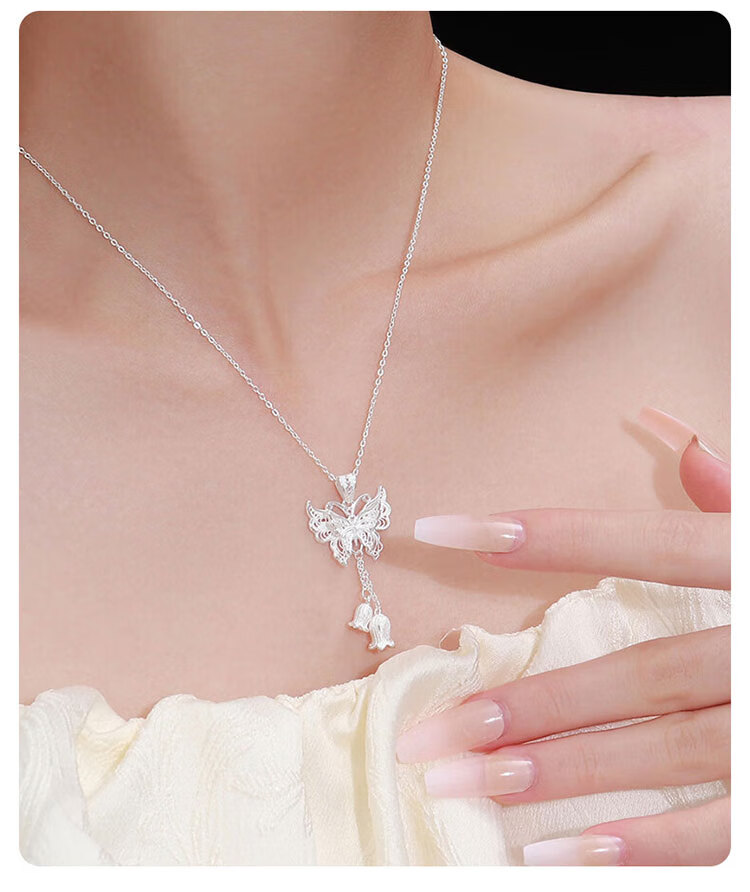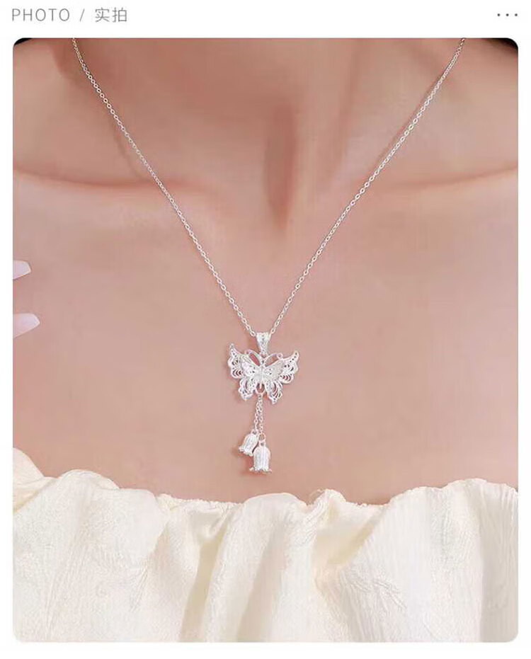 China Gold (CHINA GOLD) Butterfly Lily of the Valley Flower Tassel Necklace Women's Light Luxurious Silver Pendant Valentine's Day Birthday Gift for Girlfriend and Lover Butterfly Lily of the Valley Flower Tassel Necklace