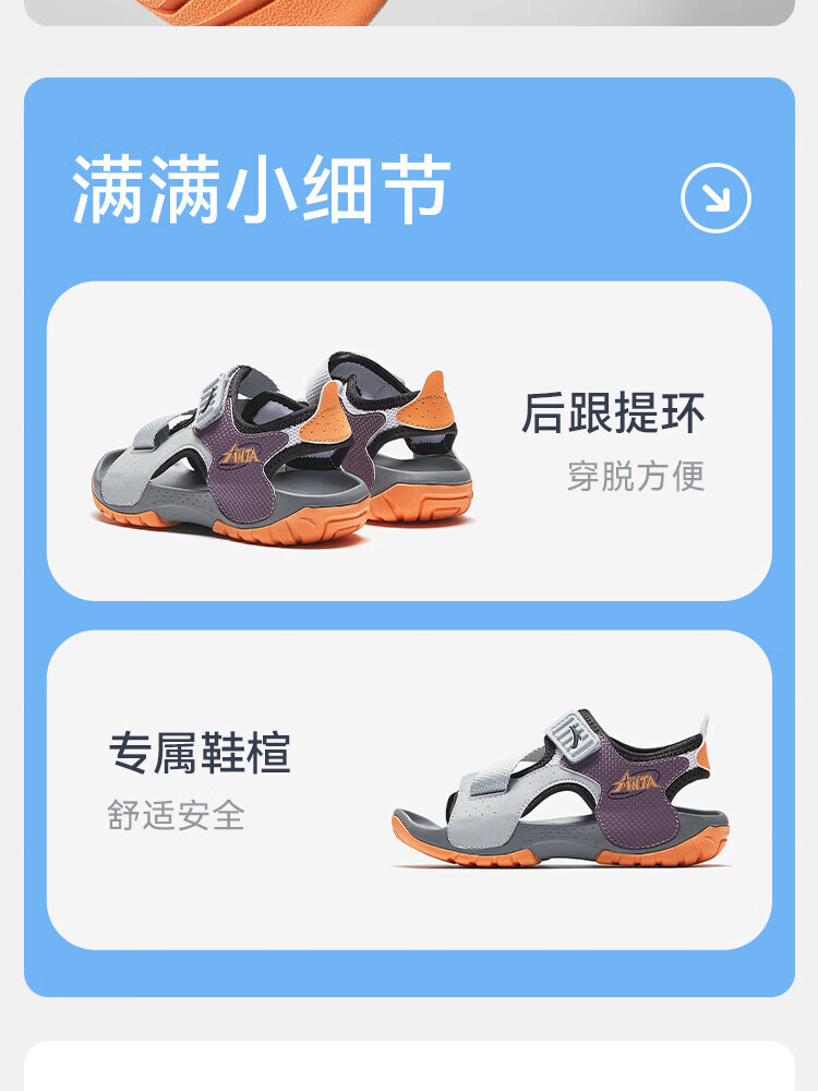 ANTA Children's Sandals Boys' Shoes 2025 Spring New Outdoor Velcro Anti-Slip Open-Toe Beach Shoes Frost Tower Gray/Whistle Purple/Anta White-1 29
