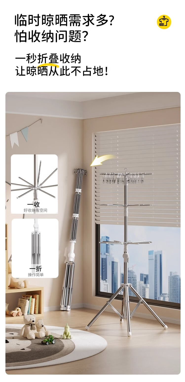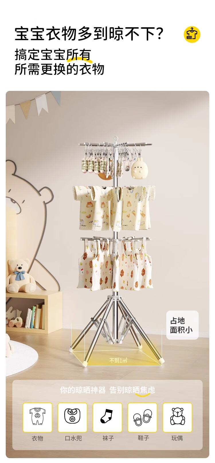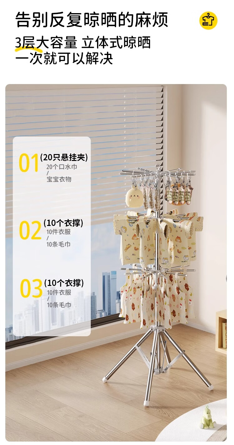 Hotata clothes drying rack floor-standing baby clothes hanger baby special folding drying rack stainless steel multi-functional windproof mobile clothes hanger three-layer stainless steel material & free 20 windproof clips
