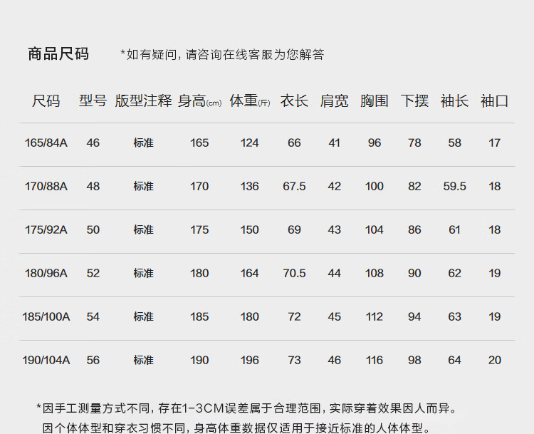 China (cm) 160-165/84-86 165-170 / 88-90 167-172 / 92-96 168-173 / 98-102 170-176 / 106-110