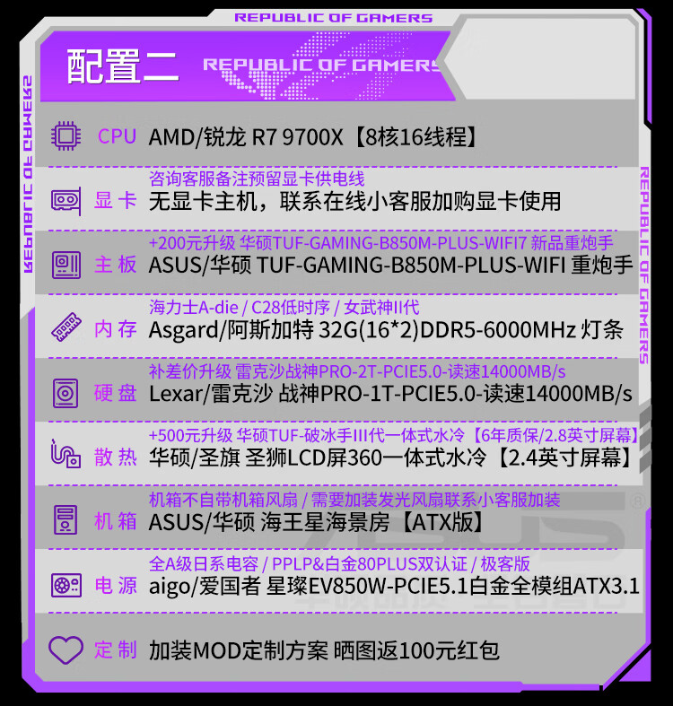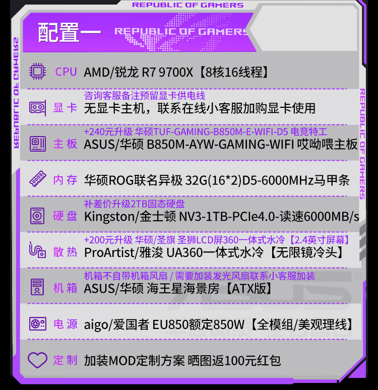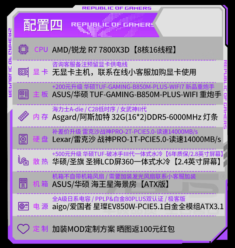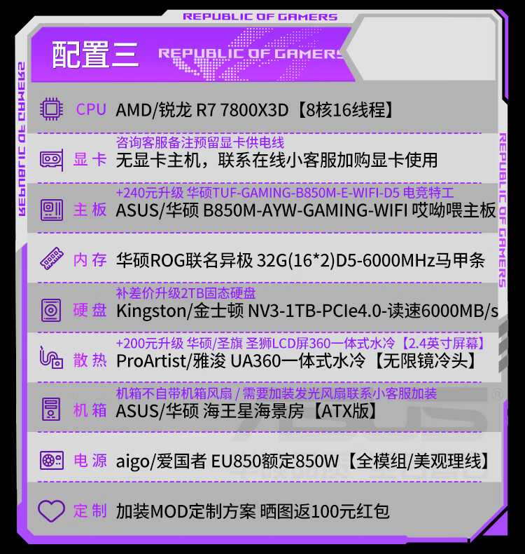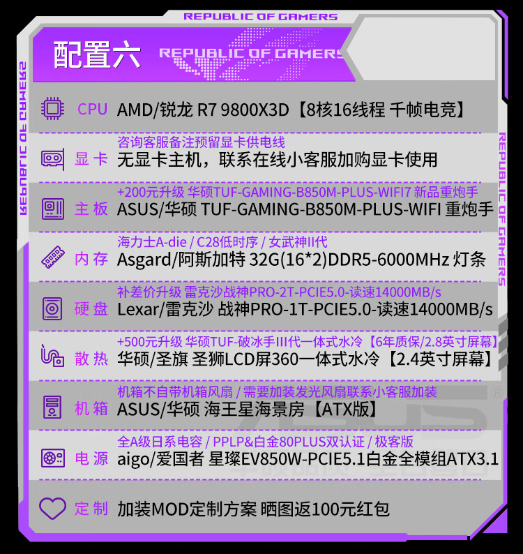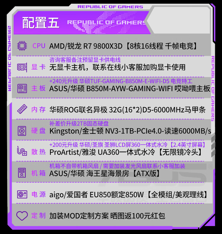 ASUS (ASUS) ASUS ROG family bucket AMD Ryzen R7 7800X3D/R7 9800X3D host barebone AI rendering sea view room desktop computer diy assembly computer 9800X3D barebone + 32G + 5.0 solid state | heavy gunner
