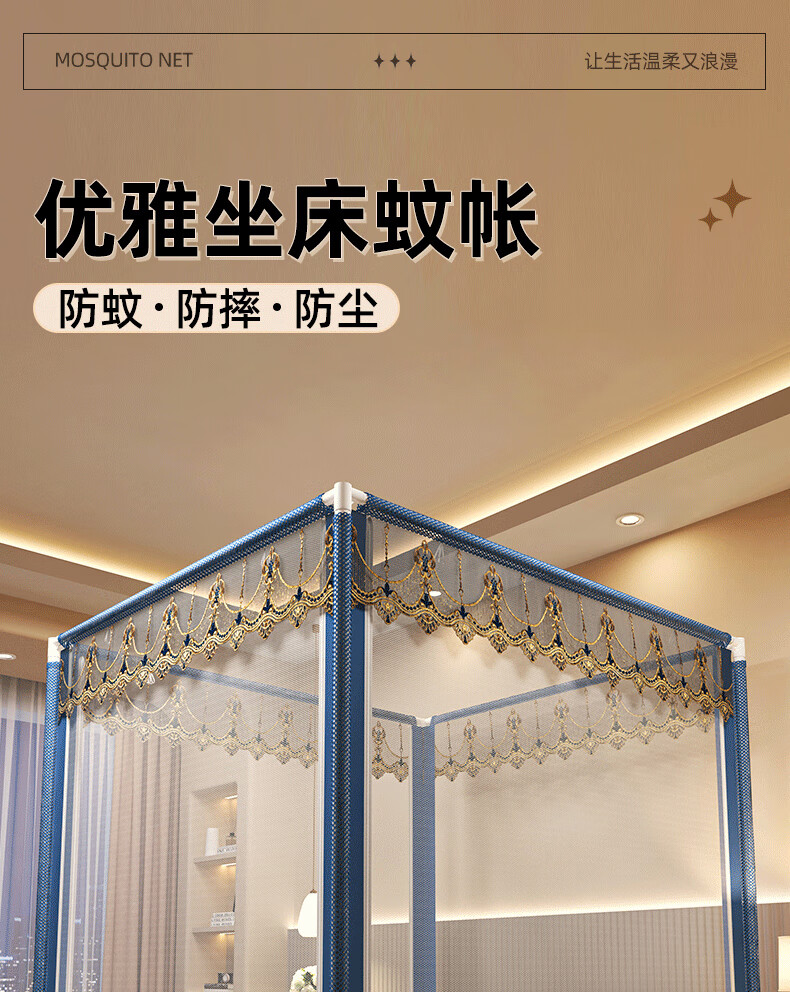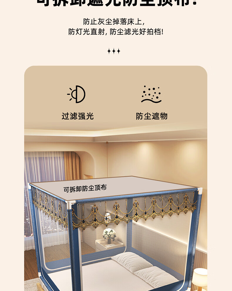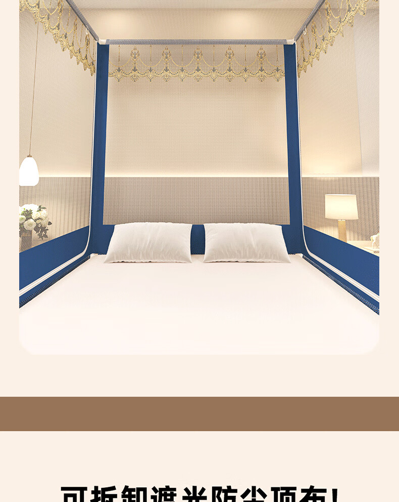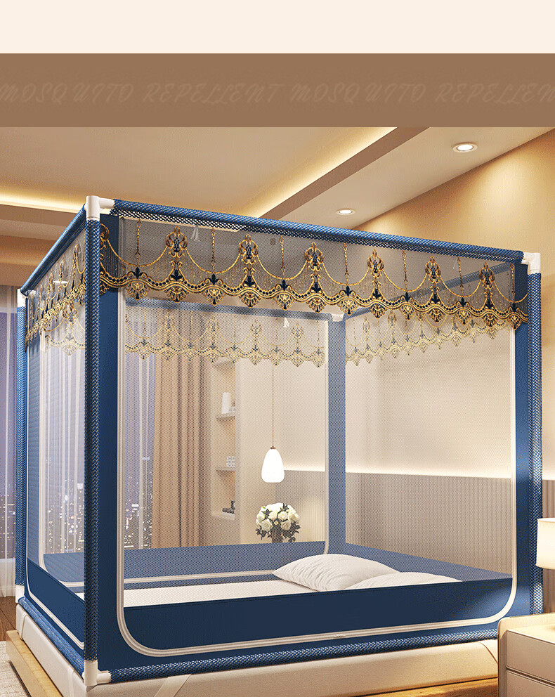 Anti-fall mosquito net for home bedroom children and babies to prevent falling out of bed Mongolian yurt dust-proof pattern net 2025 new style dark blue French lace tent edge romantic light luxury style 1.97m*1.8m*1.7m suitable for 1.8m bed