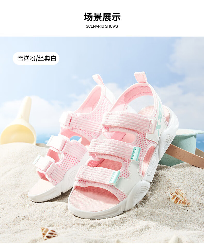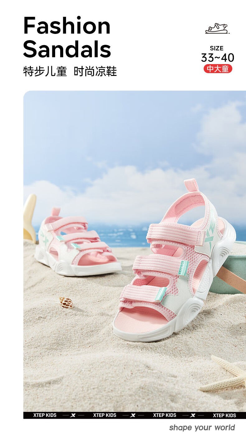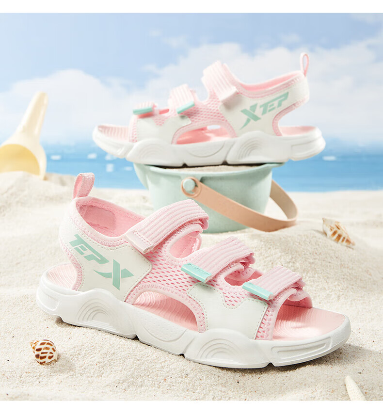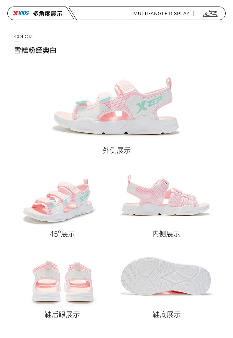 Xtep children's beach shoes for summer for girls, middle and large children with strap design for easy putting on and taking off, comfortable, breathable, fashionable and versatile sandals, ice cream pink/classic white 36