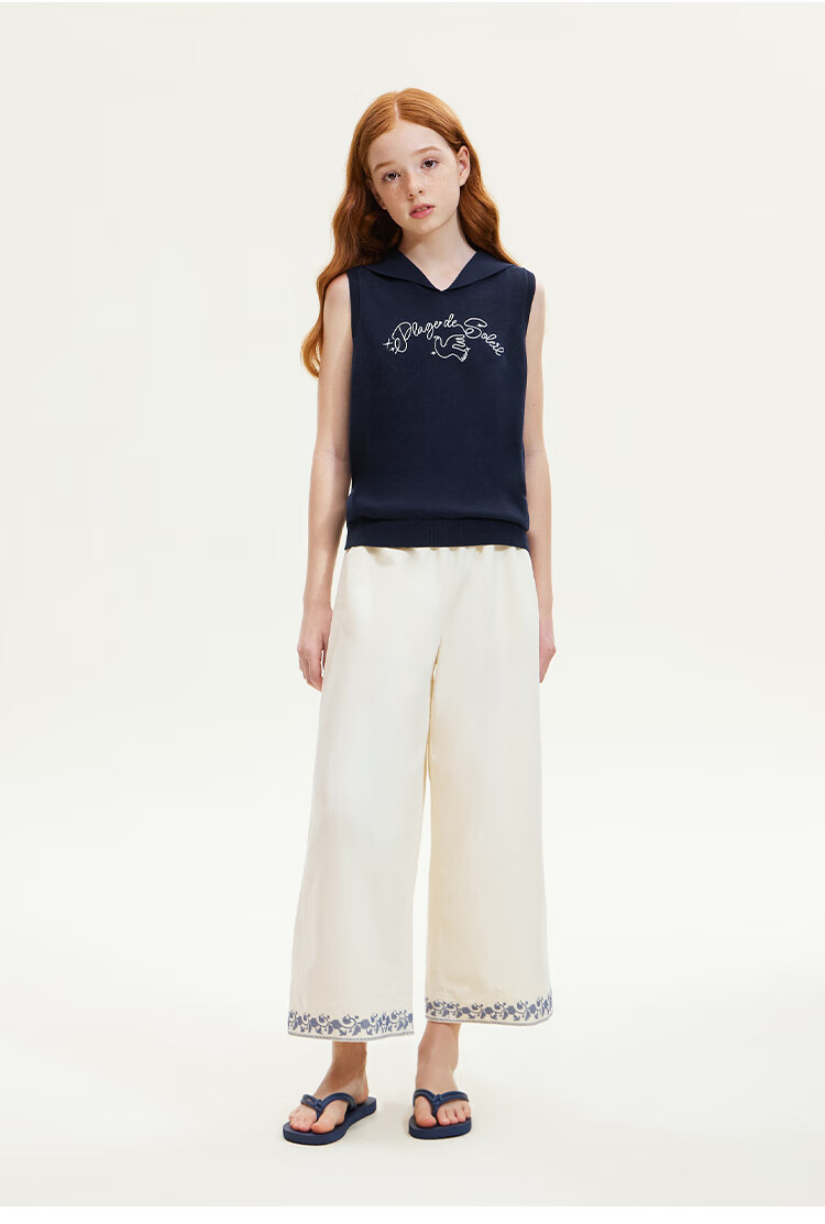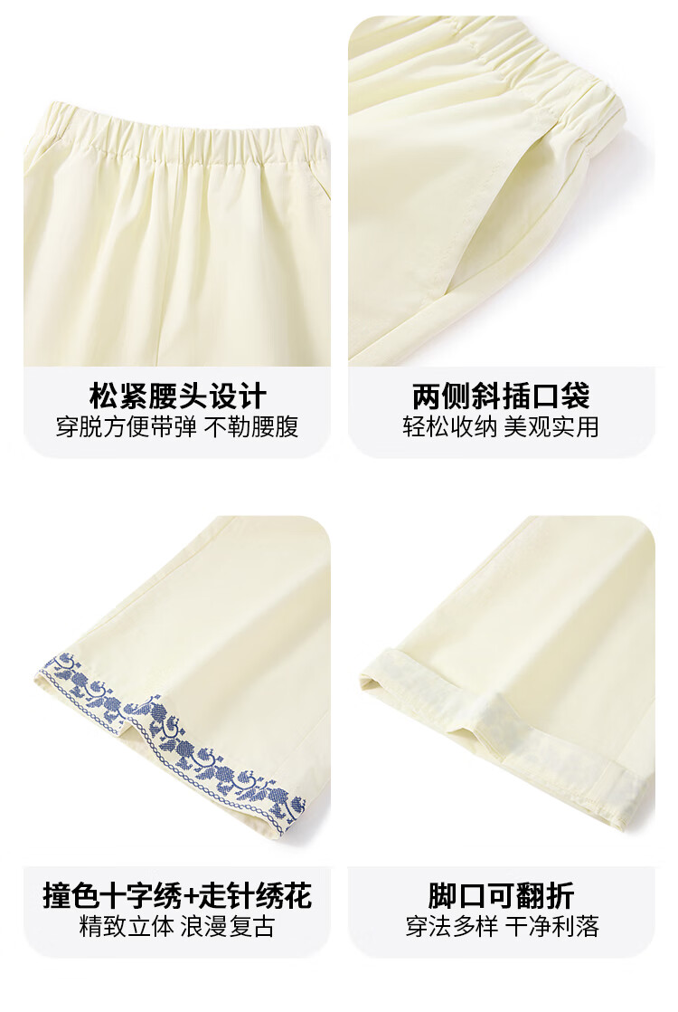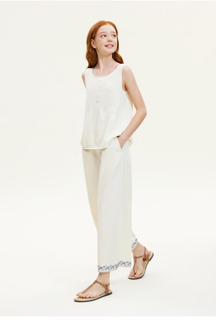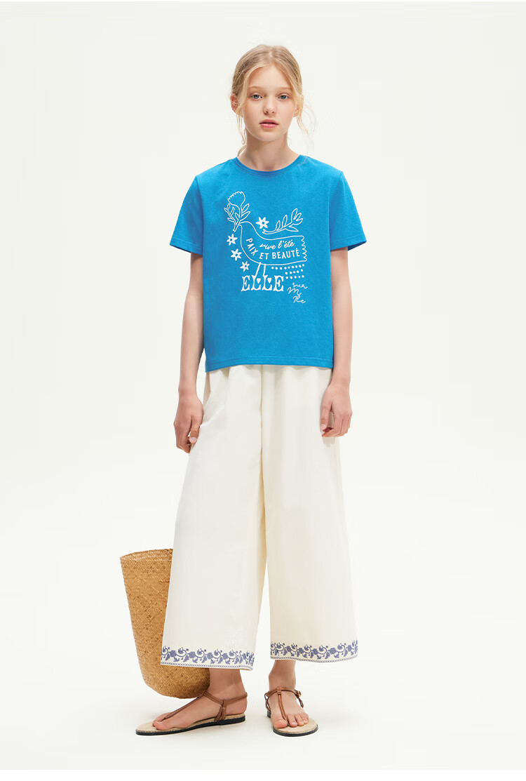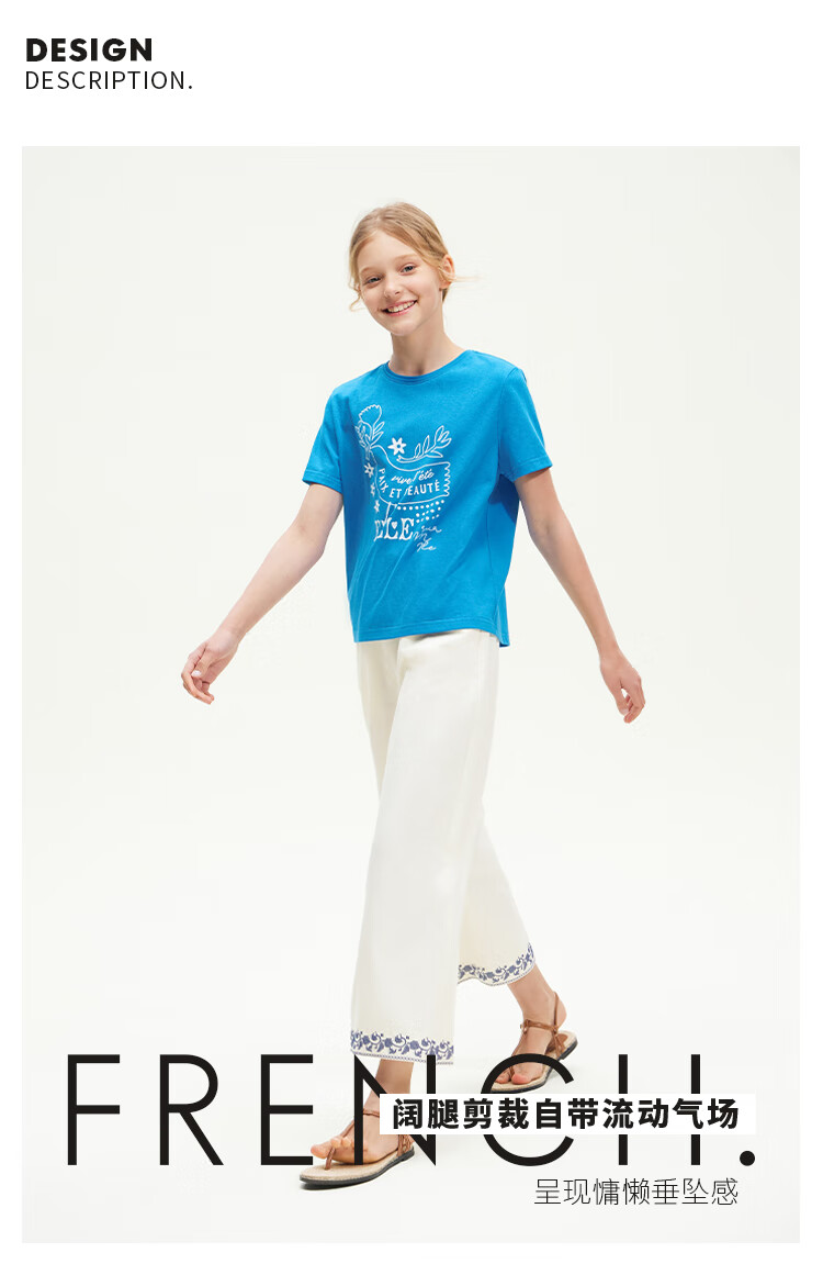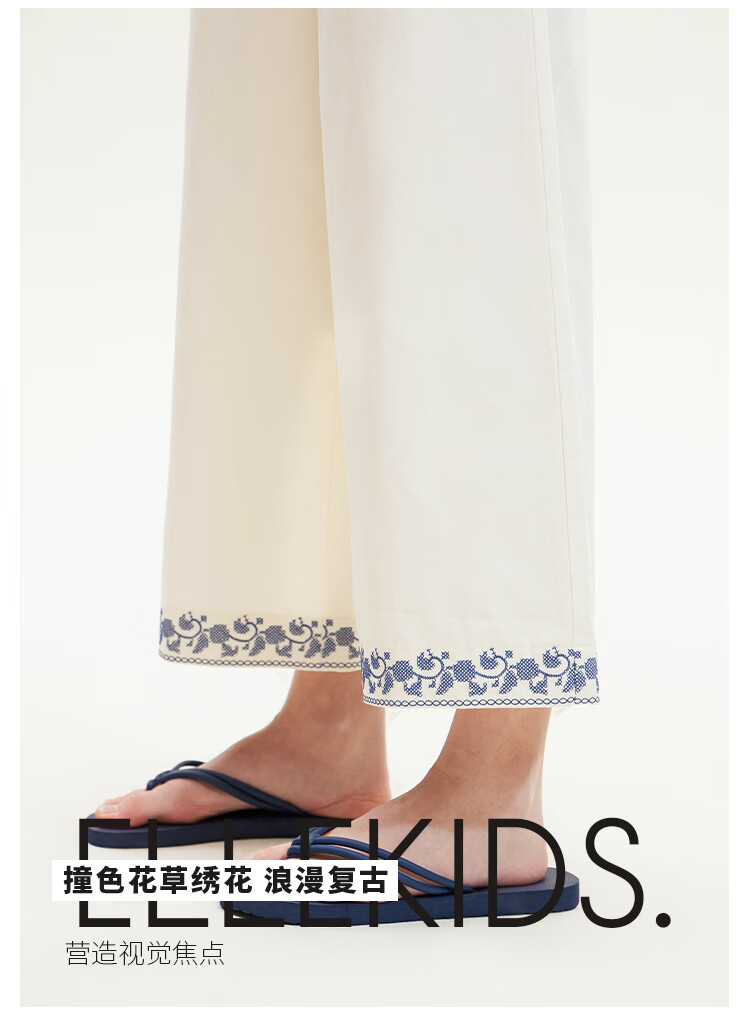 ELLE ACTIVEELLEkids Children's Clothing Contrast Color Embroidered Wide Leg Nine-Point Pants Girls Summer New Vacation Casual Loose Pants White_Ready Stock 110_120cm