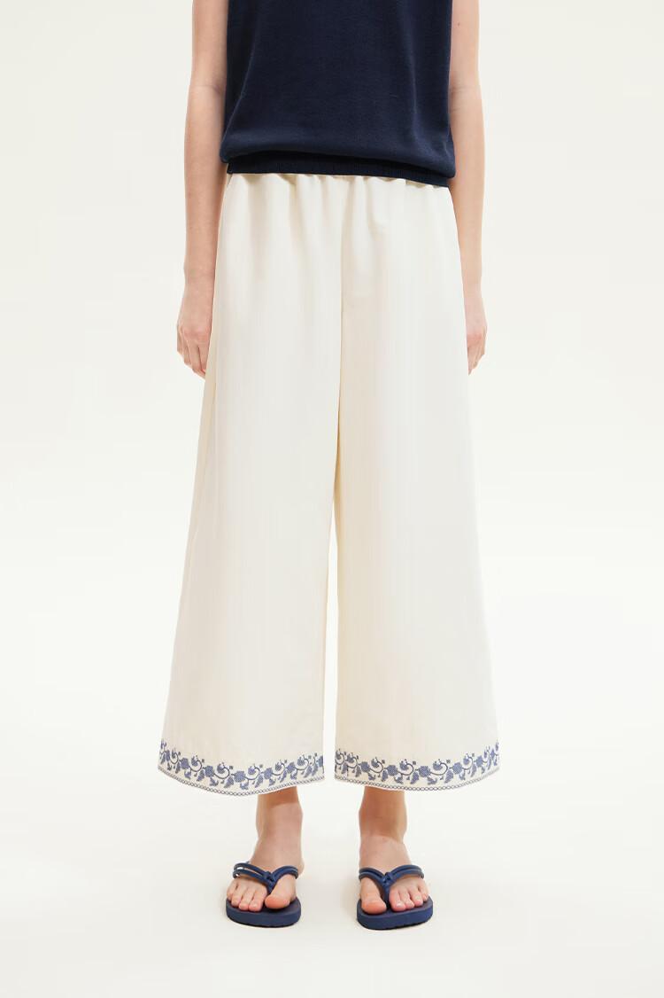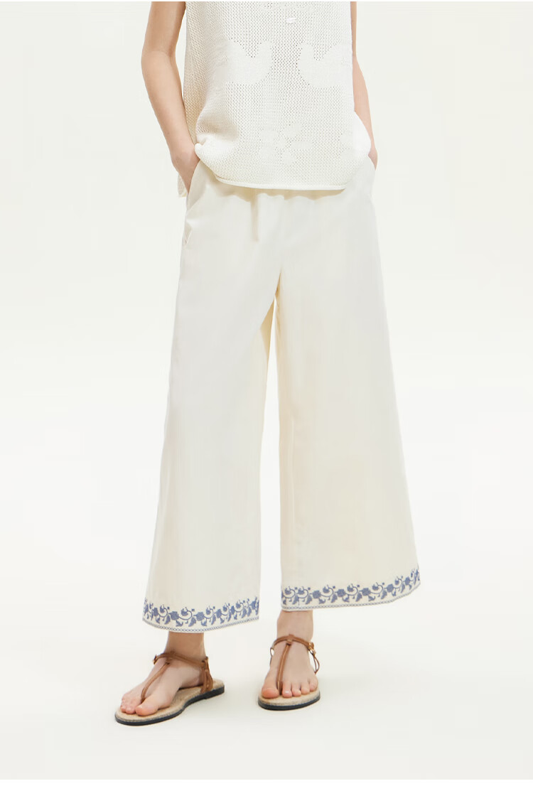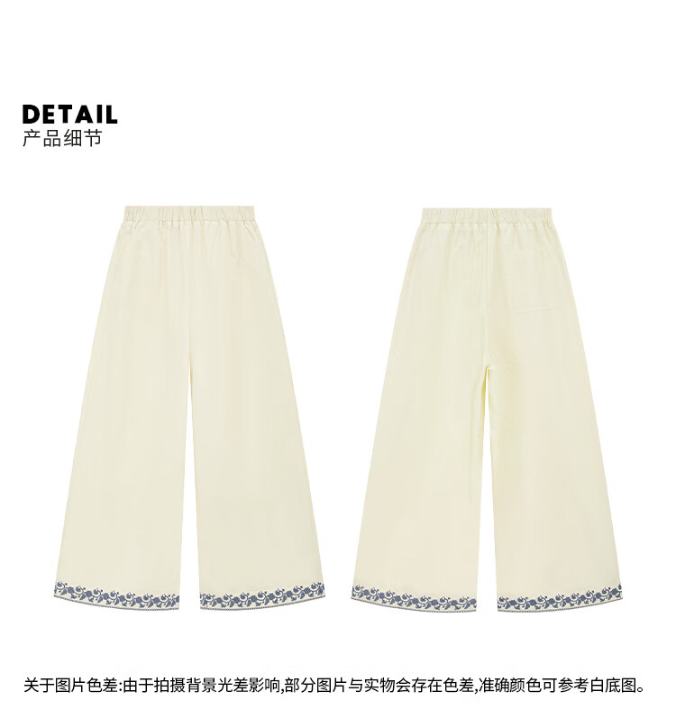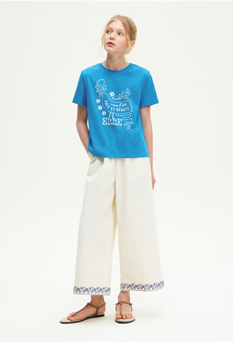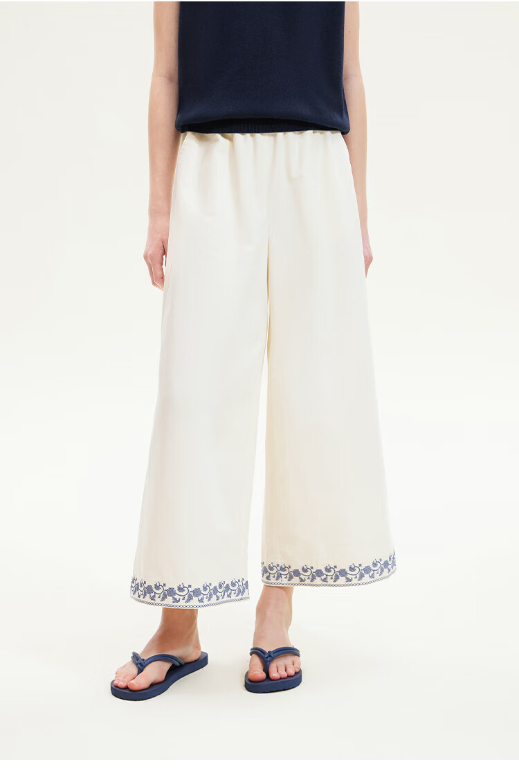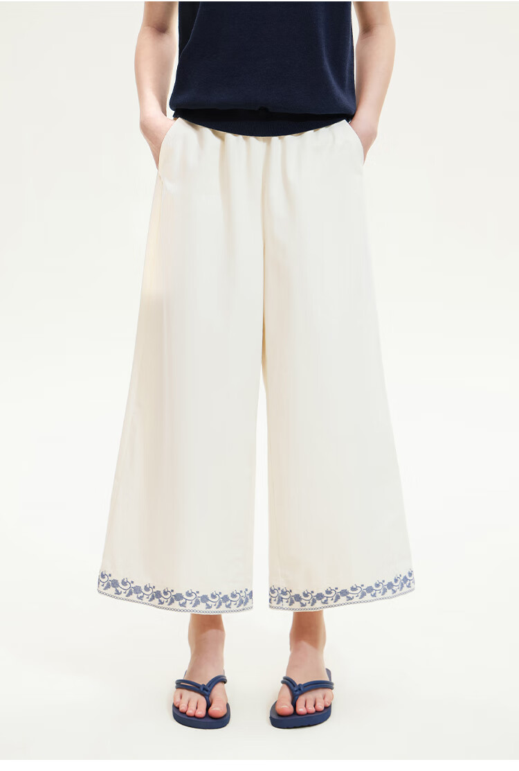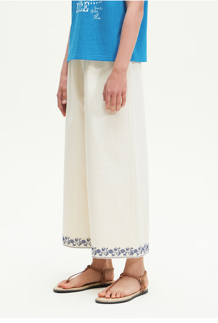 ELLE ACTIVEELLEkids Children's Clothing Contrast Color Embroidered Wide Leg Nine-Point Pants Girls Summer New Vacation Casual Loose Pants White_Ready Stock 110_120cm