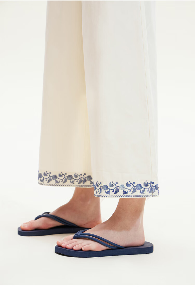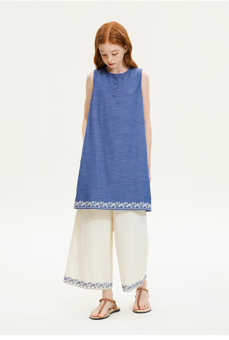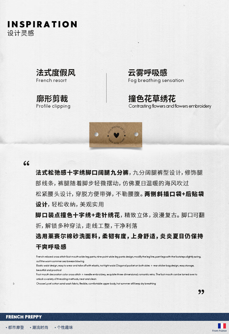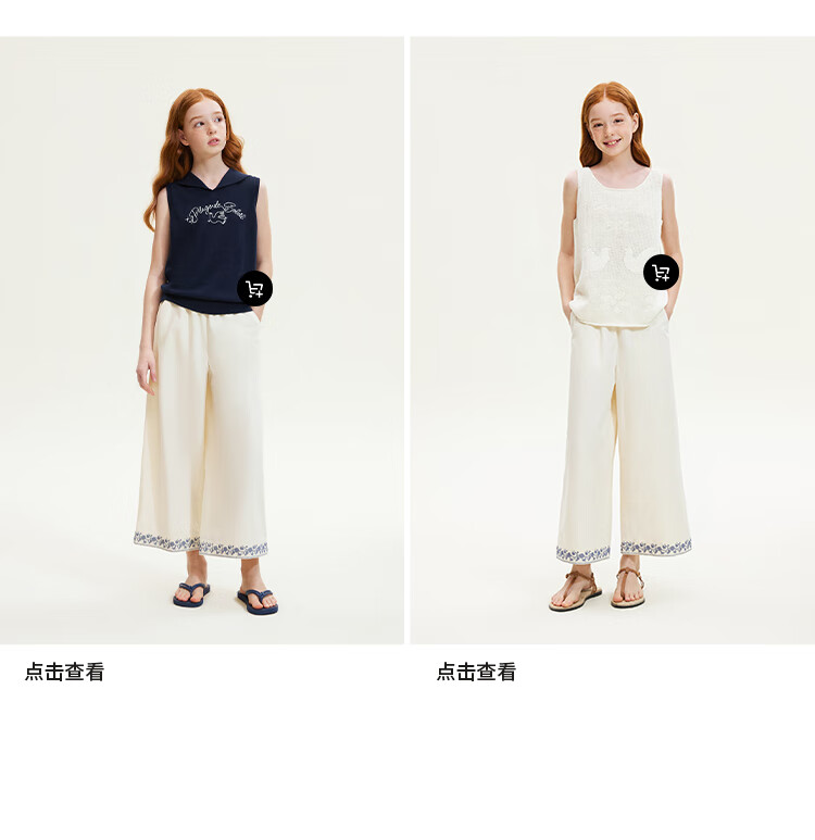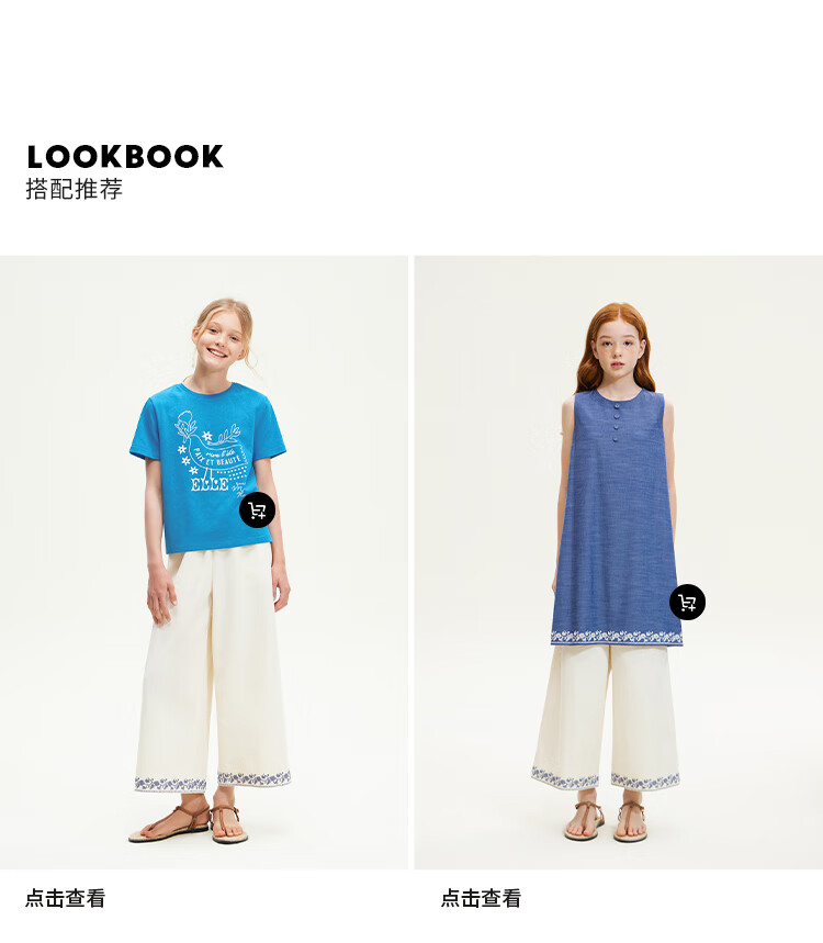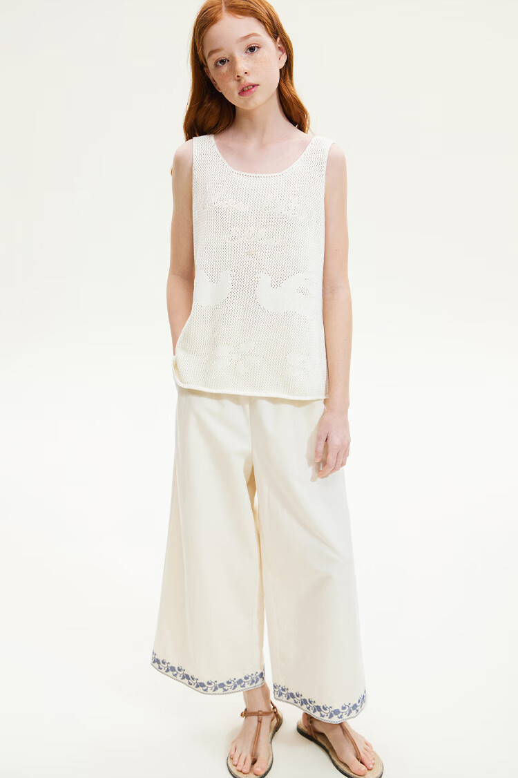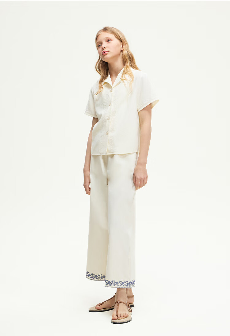 ELLE ACTIVEELLEkids Children's Clothing Contrast Color Embroidered Wide Leg Nine-Point Pants Girls Summer New Vacation Casual Loose Pants White_Ready Stock 110_120cm