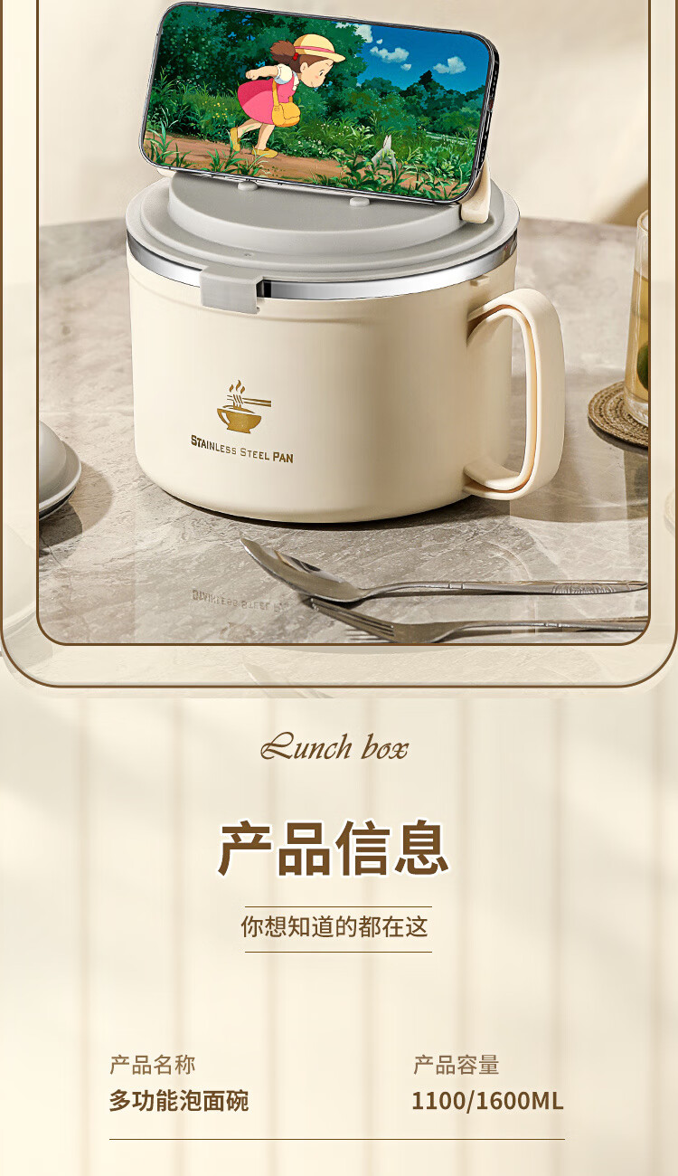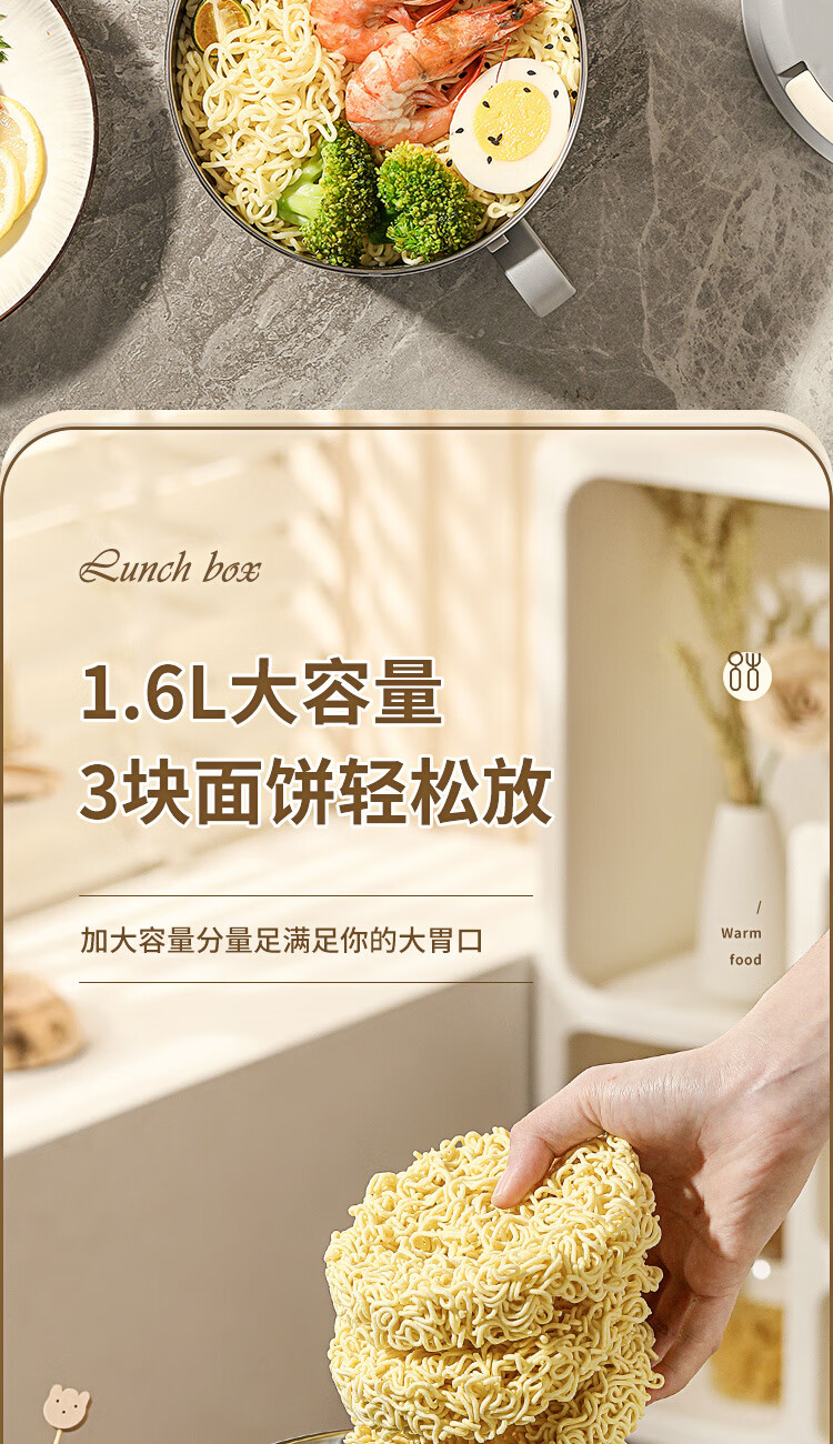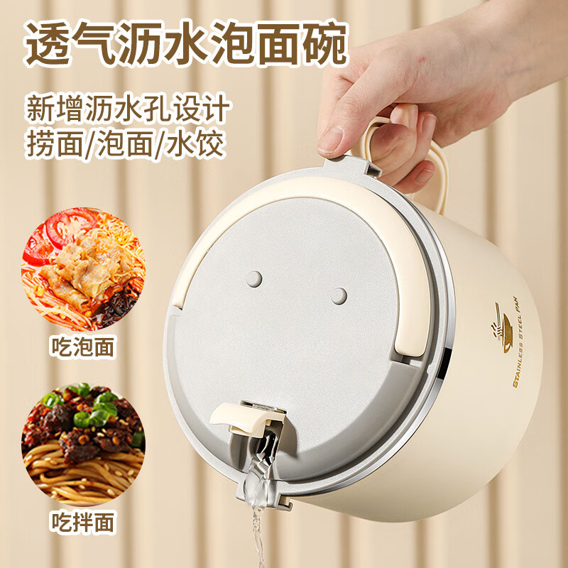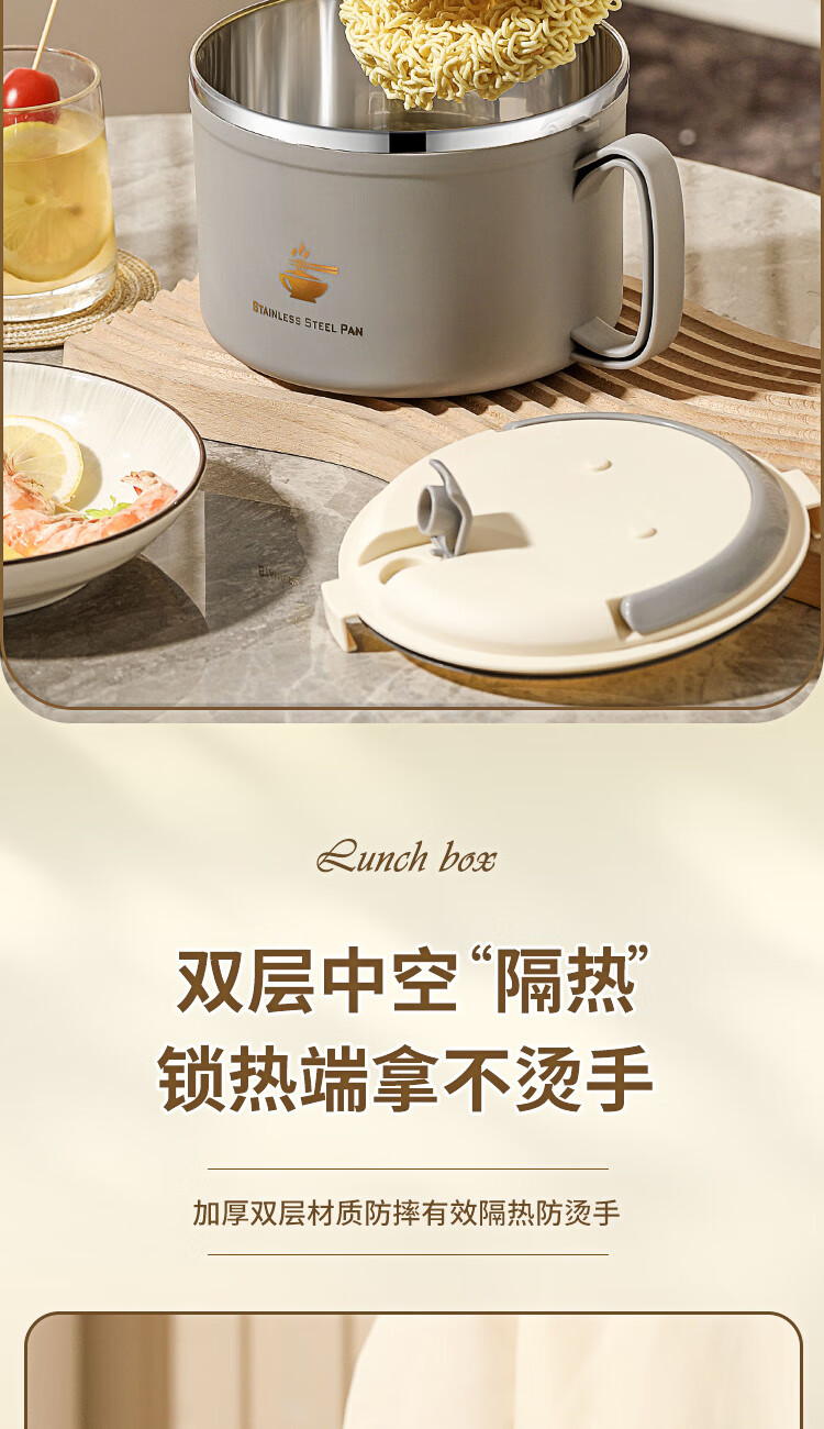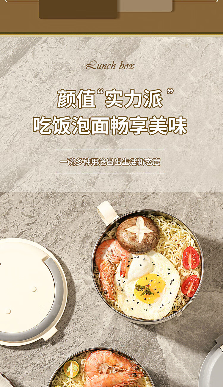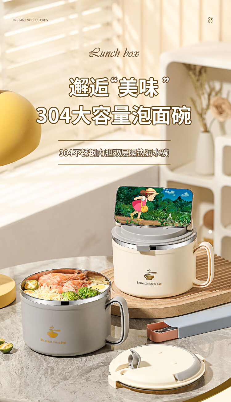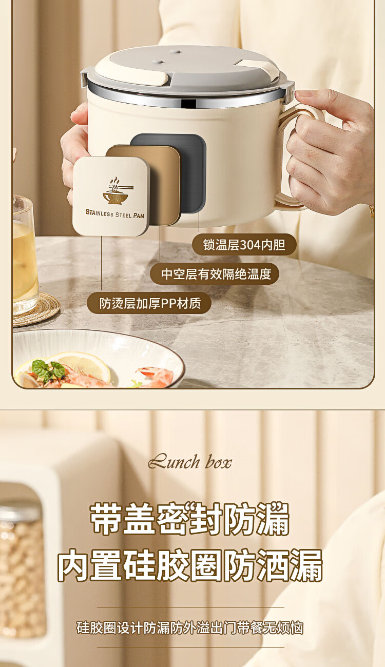 Langxi stainless steel instant noodle bowl with lid for student dormitory 304 bowls and chopsticks set for office workers canteen lunch box easy to wash 304 inner tank milky white 1600ML tableware can be soaked 2-3 packs