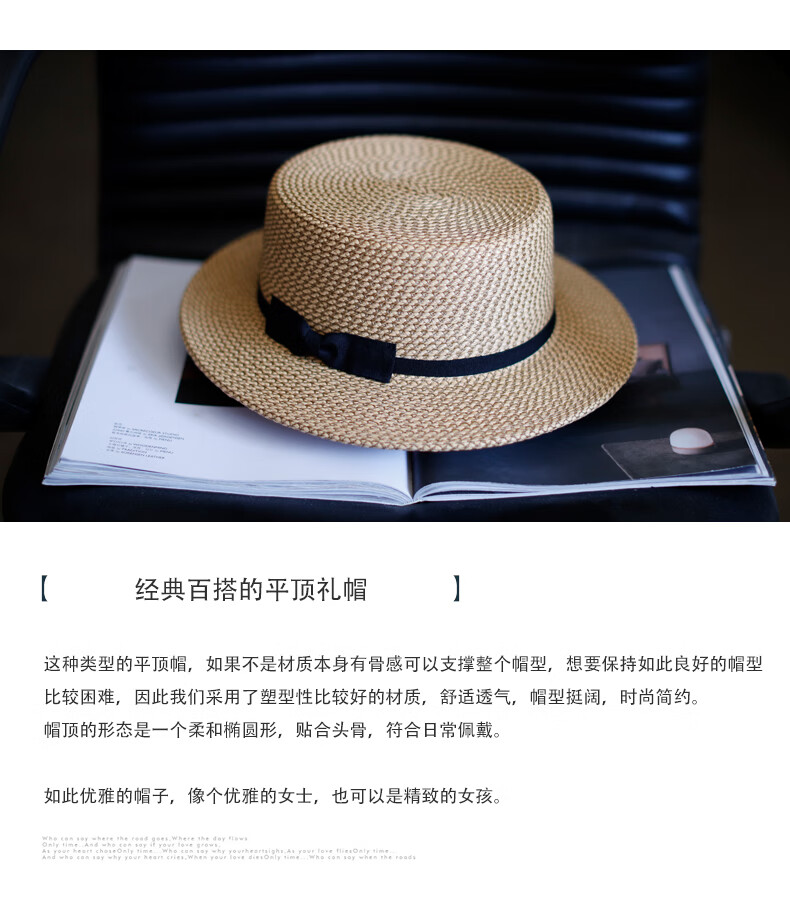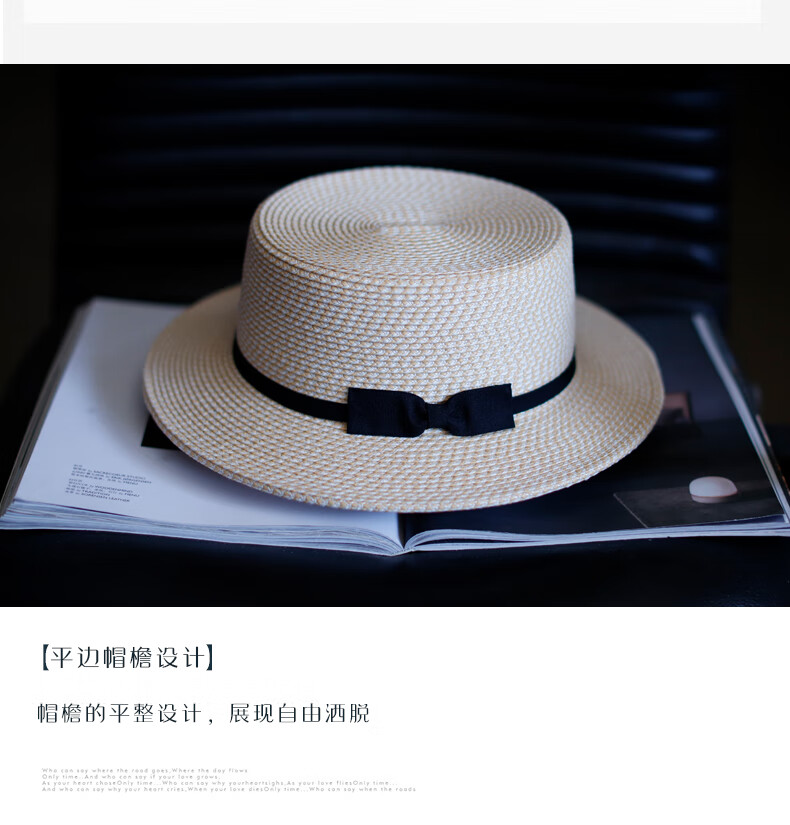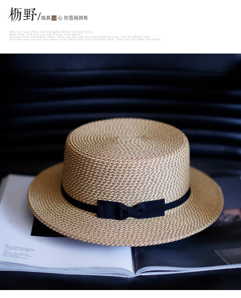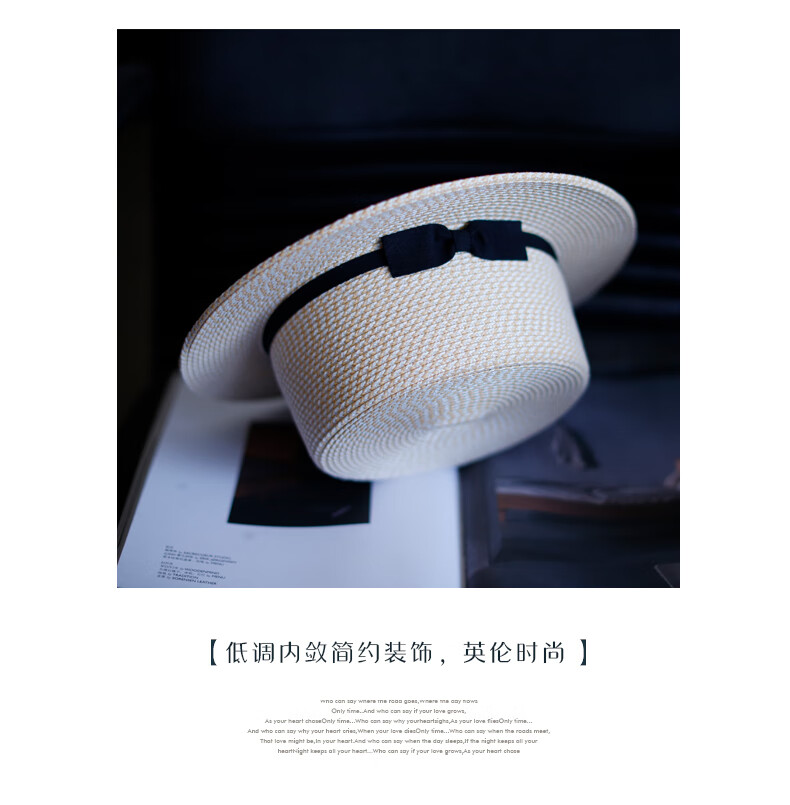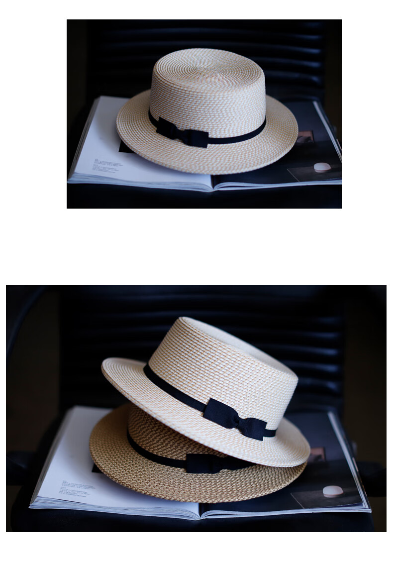 Tochino Japanese style straw hat women's summer sun hat flat brim small bow flat top hat sun protection beach hat vacation beige