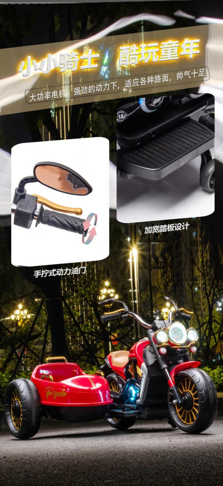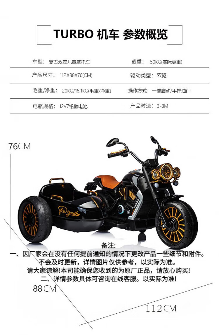 Coolpad Chi children's electric motorcycle, three-wheeled motorcycle, double stroller, sidecar motorcycle, birthday gift for boys and girls. Standard configuration - black 7A Chaowei + foot pedal + leather seat, Bluetooth music + remote control self-driving