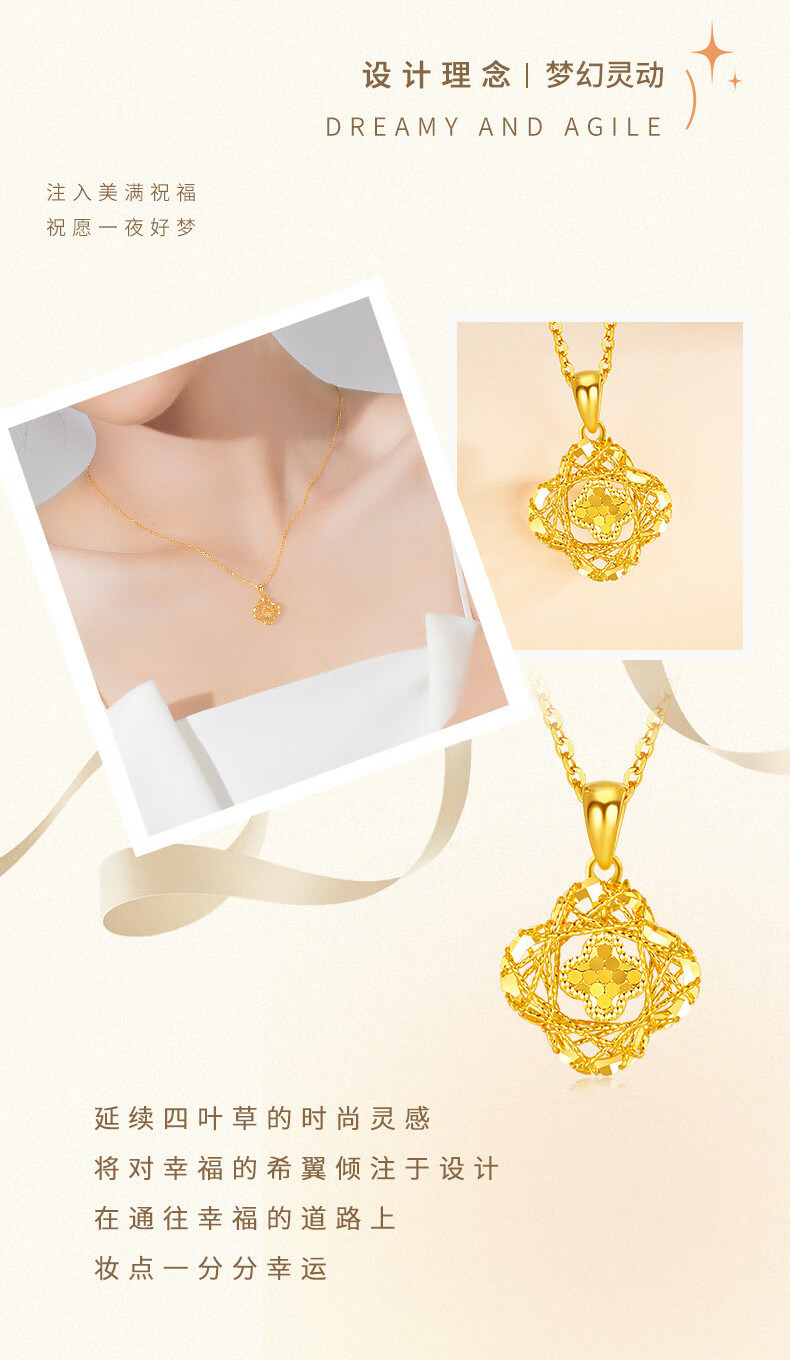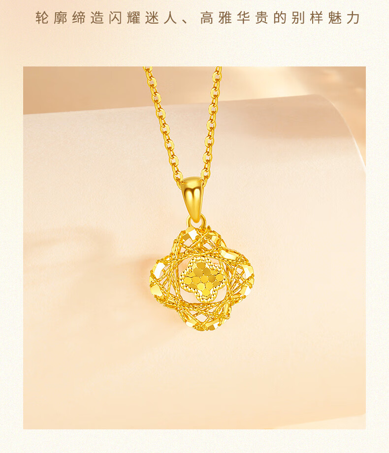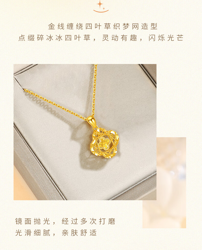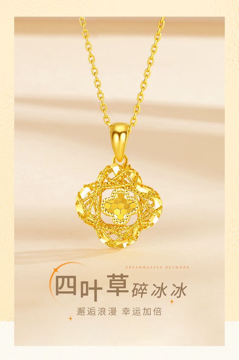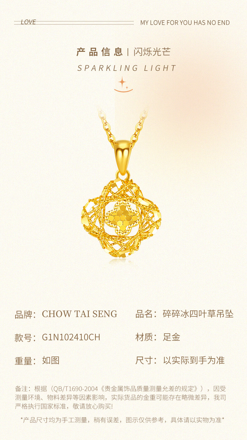 Chow Tai Sang Gold Necklace Crushed Ice Four-leaf Clover Gold Necklace Women's Valentine's Day Gift for Girlfriend Wife Mom Birthday Gift Pure Gold About 1.15-1.25g + Free S925 Silver Chain/Gift Box