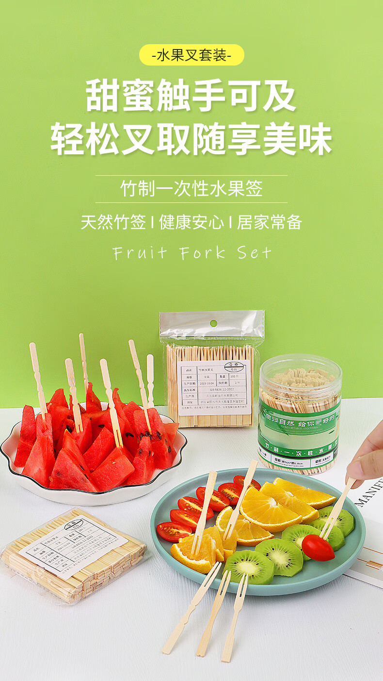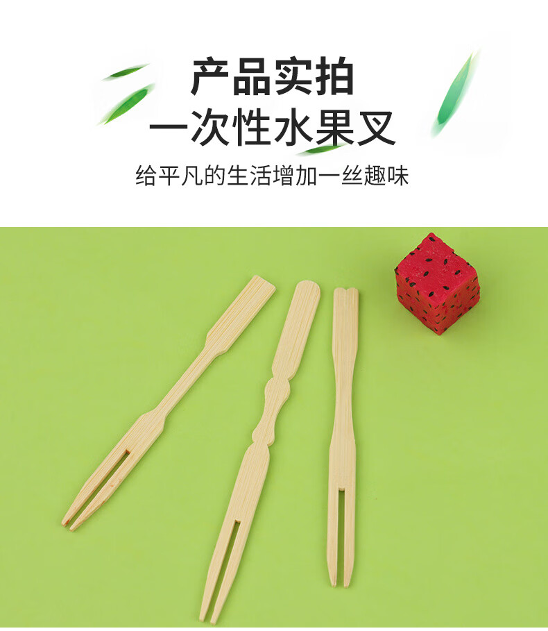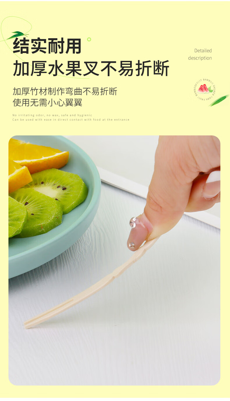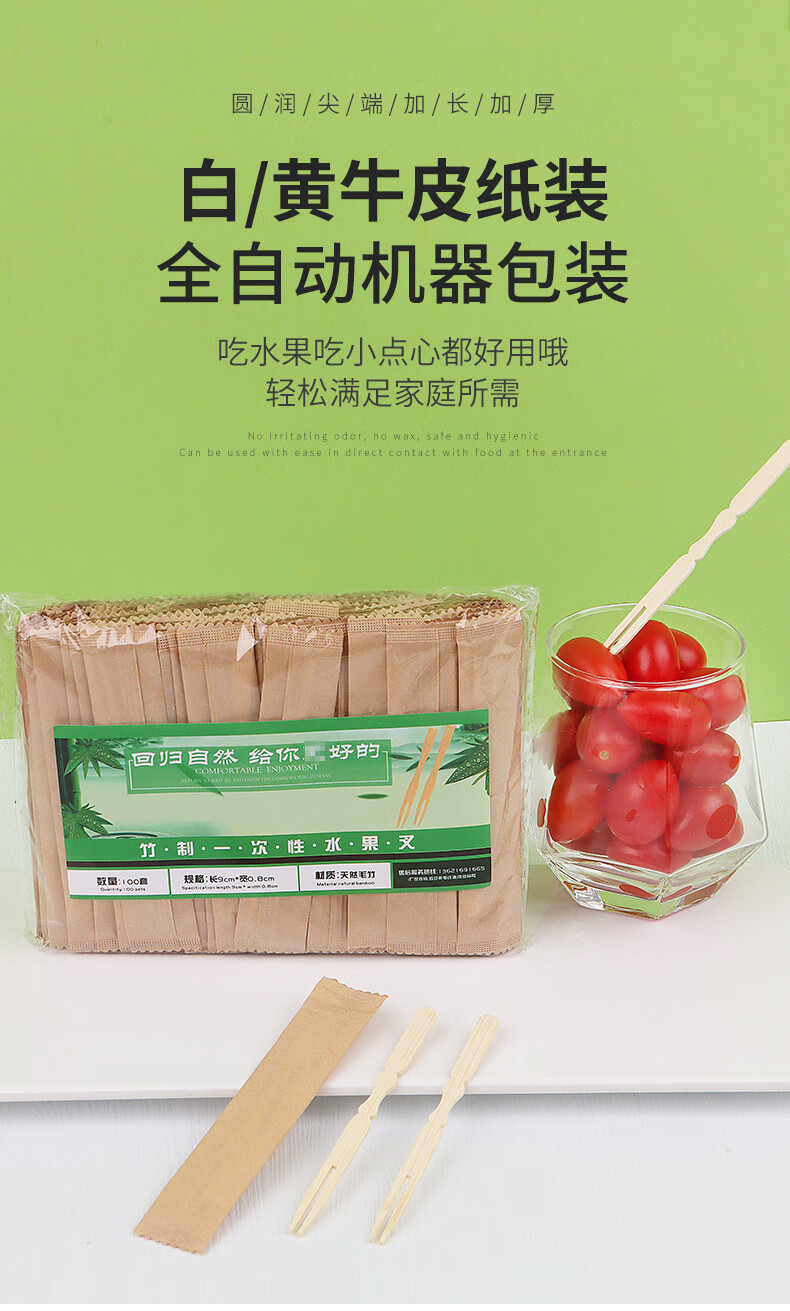 Qinkai disposable fruit fork thickened bamboo skewer two-tine fork cake dessert household fork kraft paper package yellow kraft paper 1 piece total 100 pieces length 8.8CM