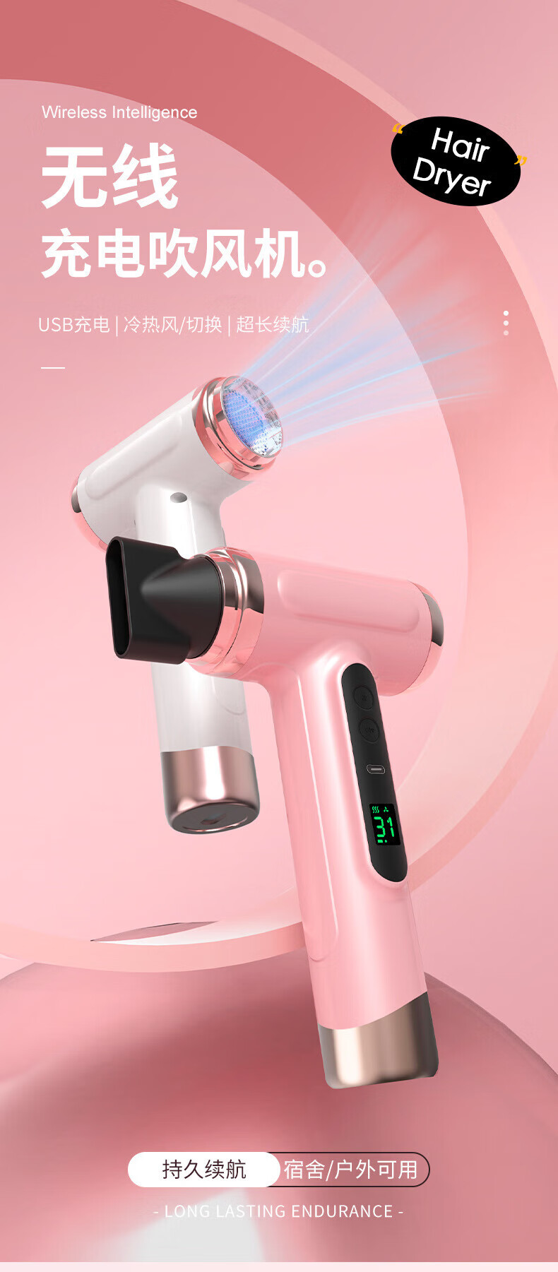 Rongtai rechargeable wireless hot and cold air hair dryer for student dormitories, unplugged, outdoor hair dryer, USB lithium battery, low power portable art entrance examination hair dryer, technology white, long battery life with charging + wireless hot and cold air + quick-drying hair care