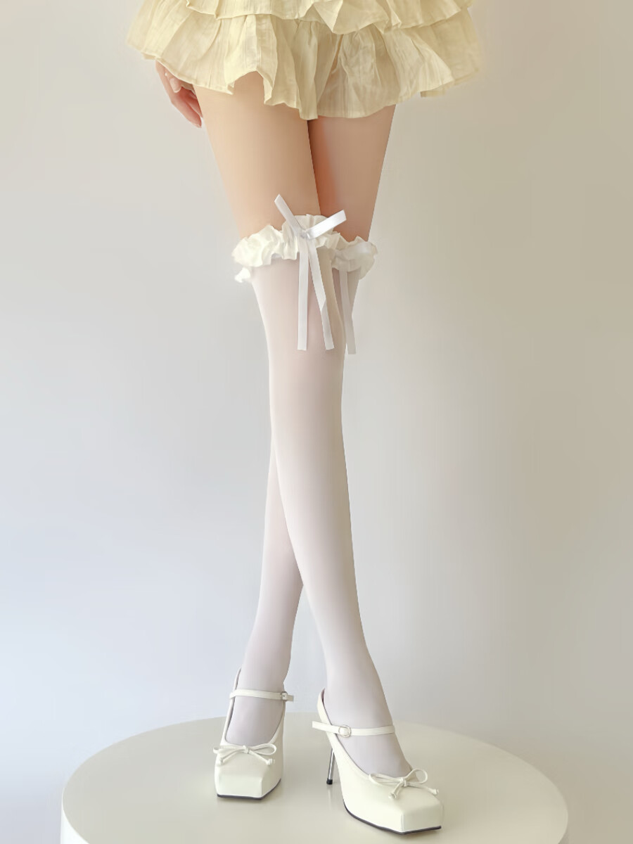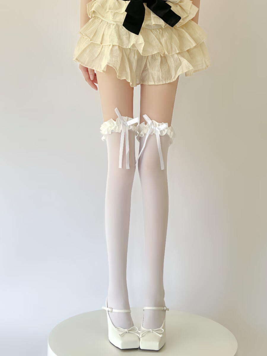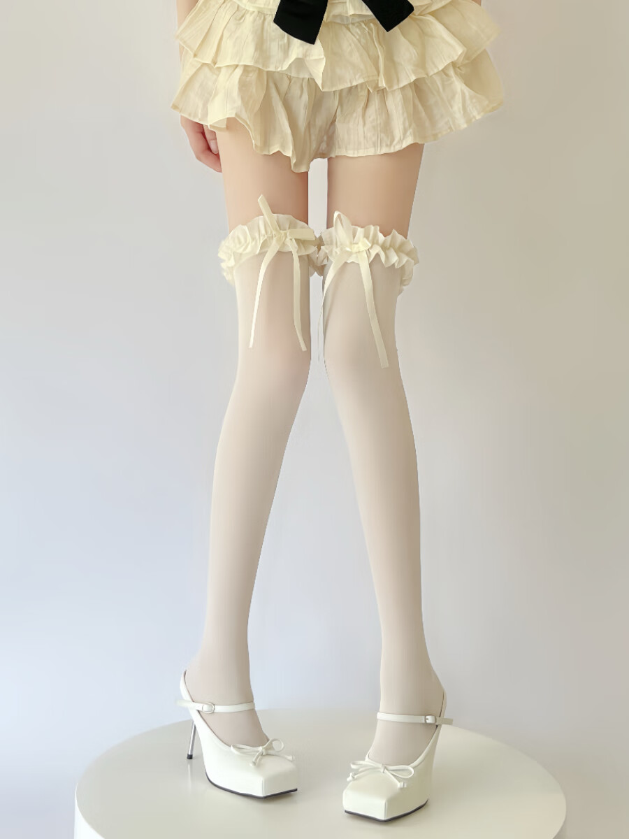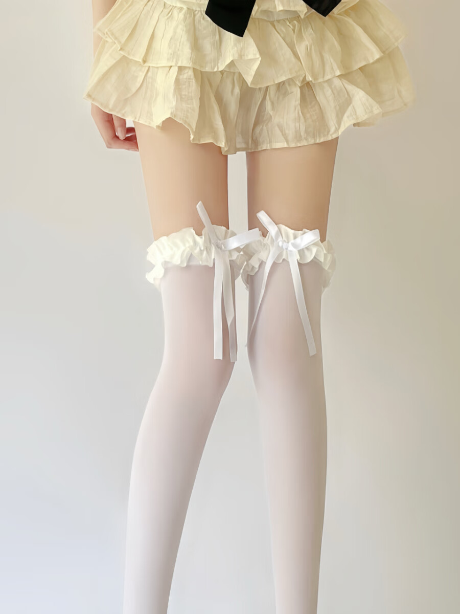 Yalu Lolita white over-the-knee socks, thin velvet high thigh socks, pure lust lace bow stockings, creamy yellow, 1 pair, one size fits all, good elasticity