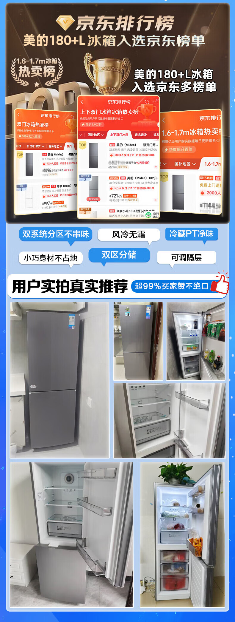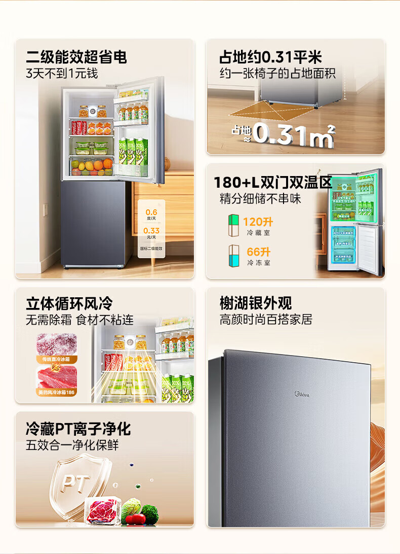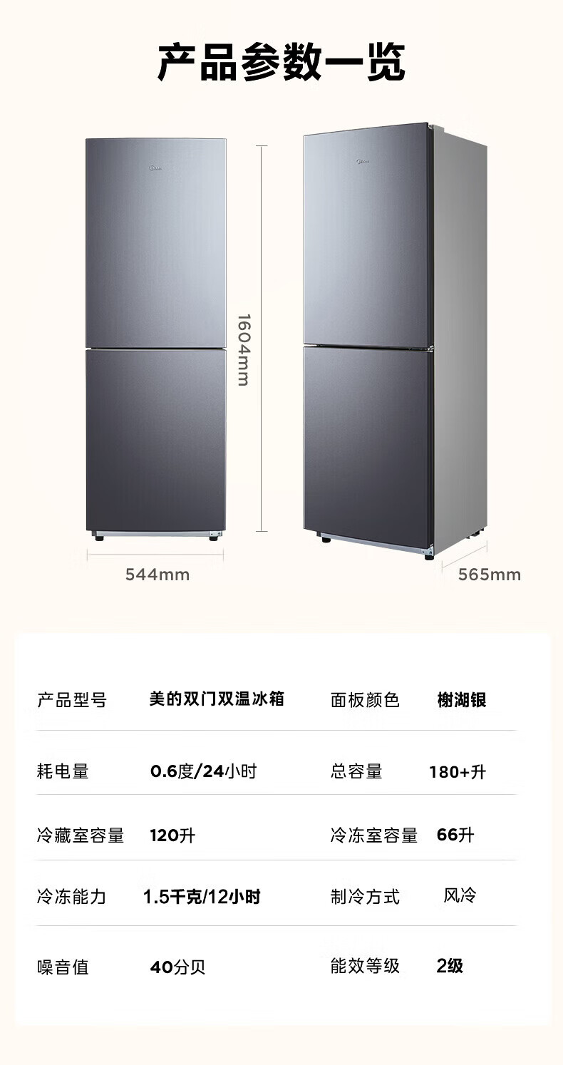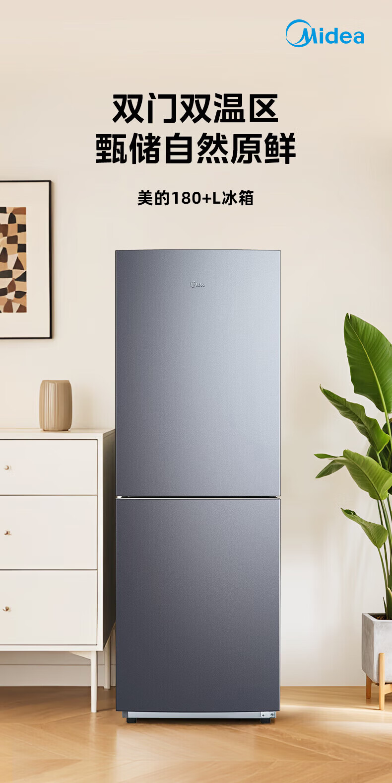 Midea 186 liter two-door refrigerator air-cooled frost-free dual system circulation rental household PT odor purifier small mini ultra-thin double door first-class saving non-inverter BCD-186WMA heavy new 186 liter air-cooled dual system PT odor purifier