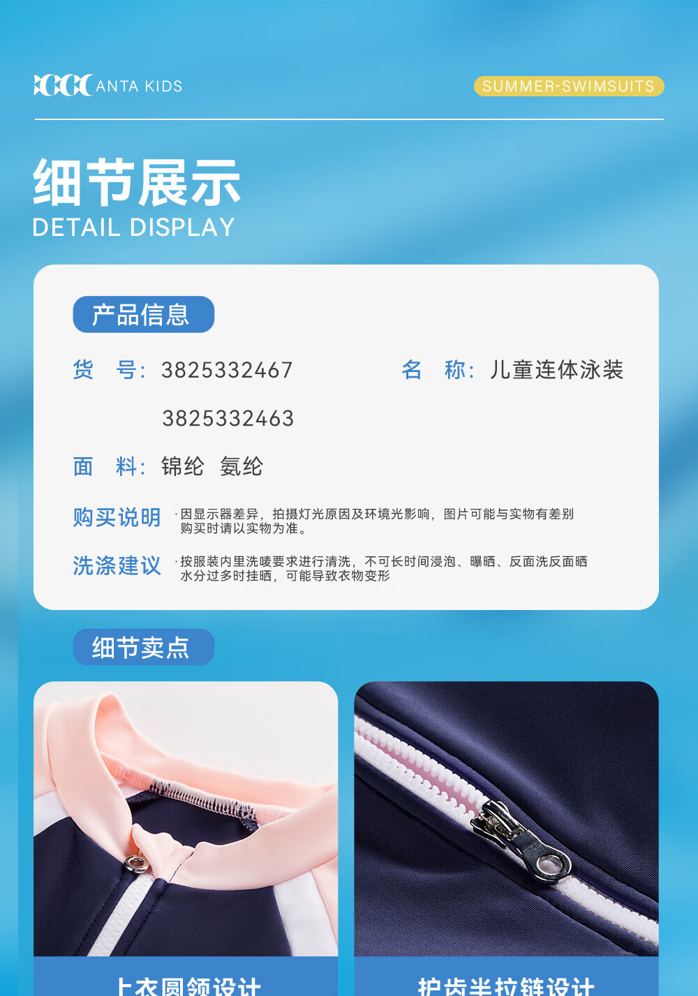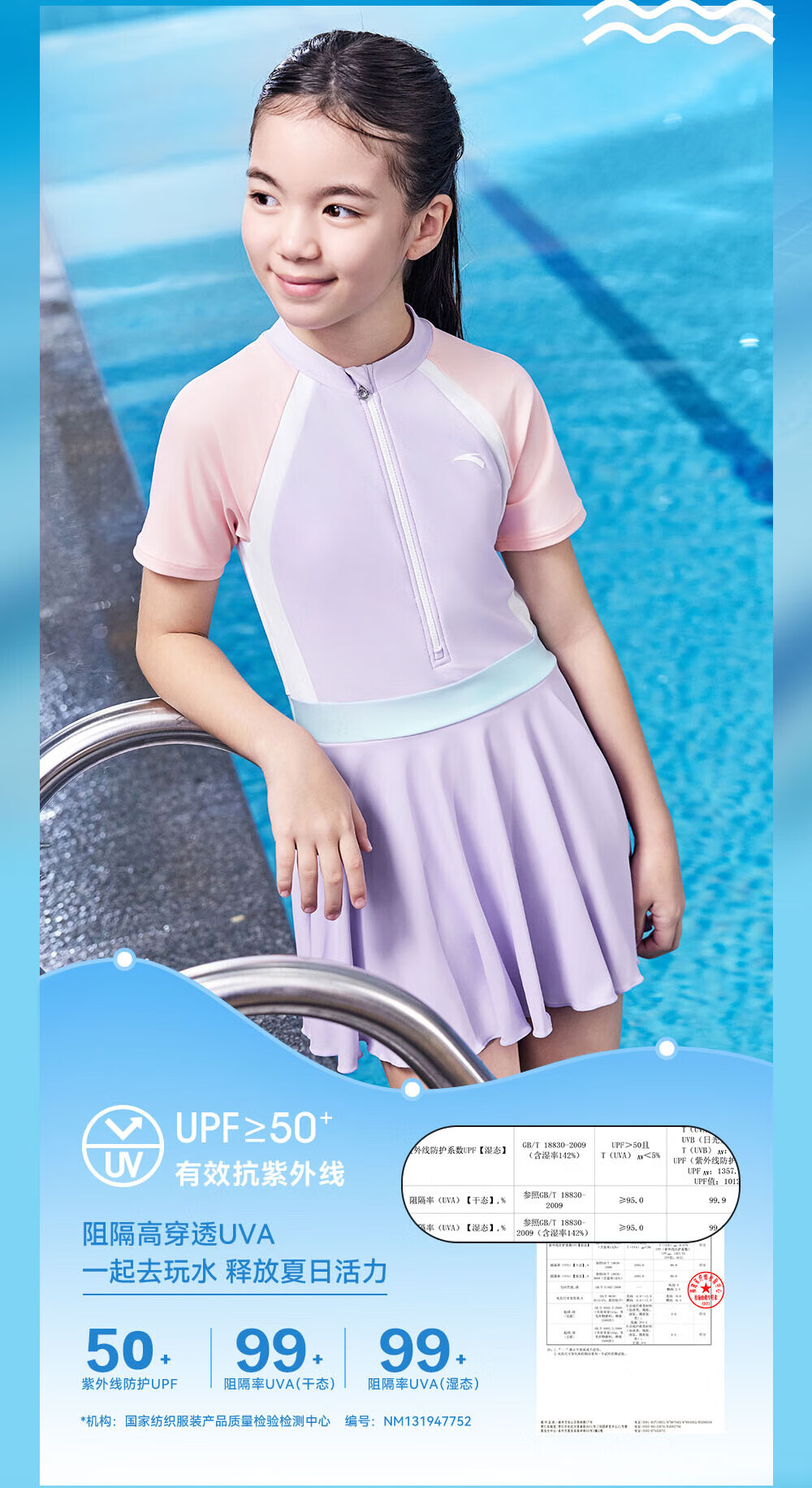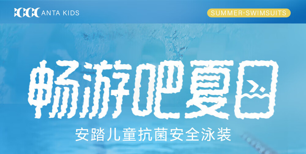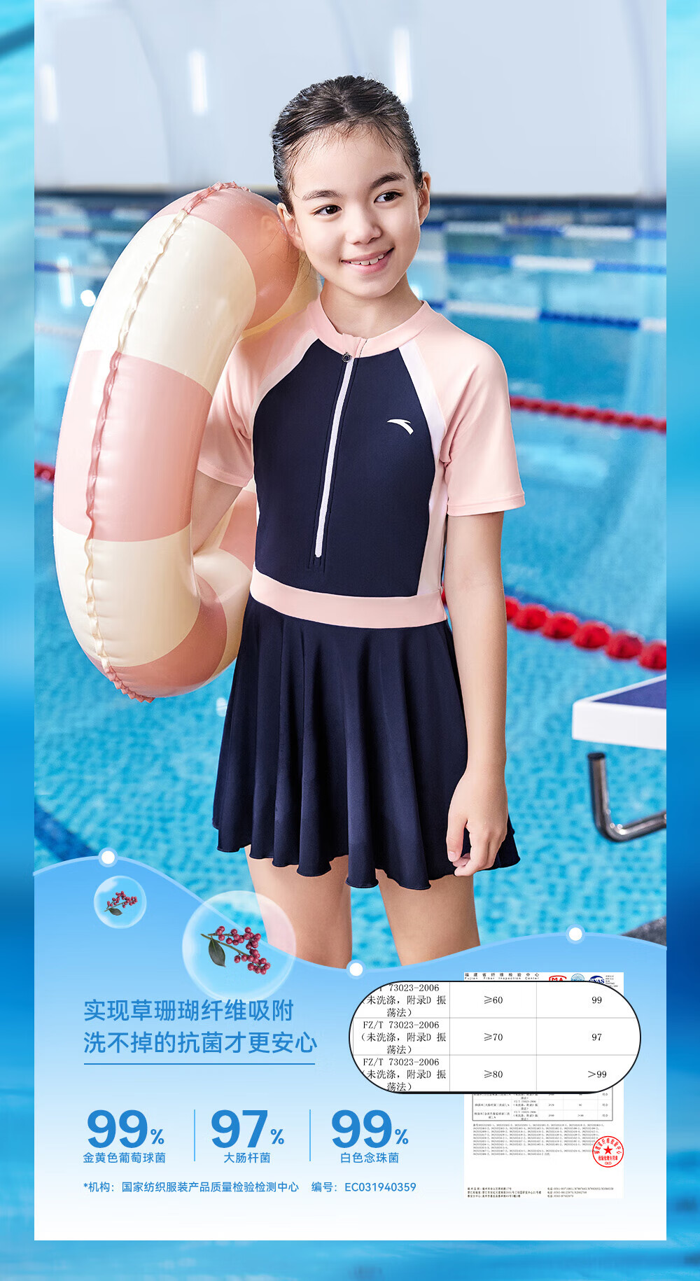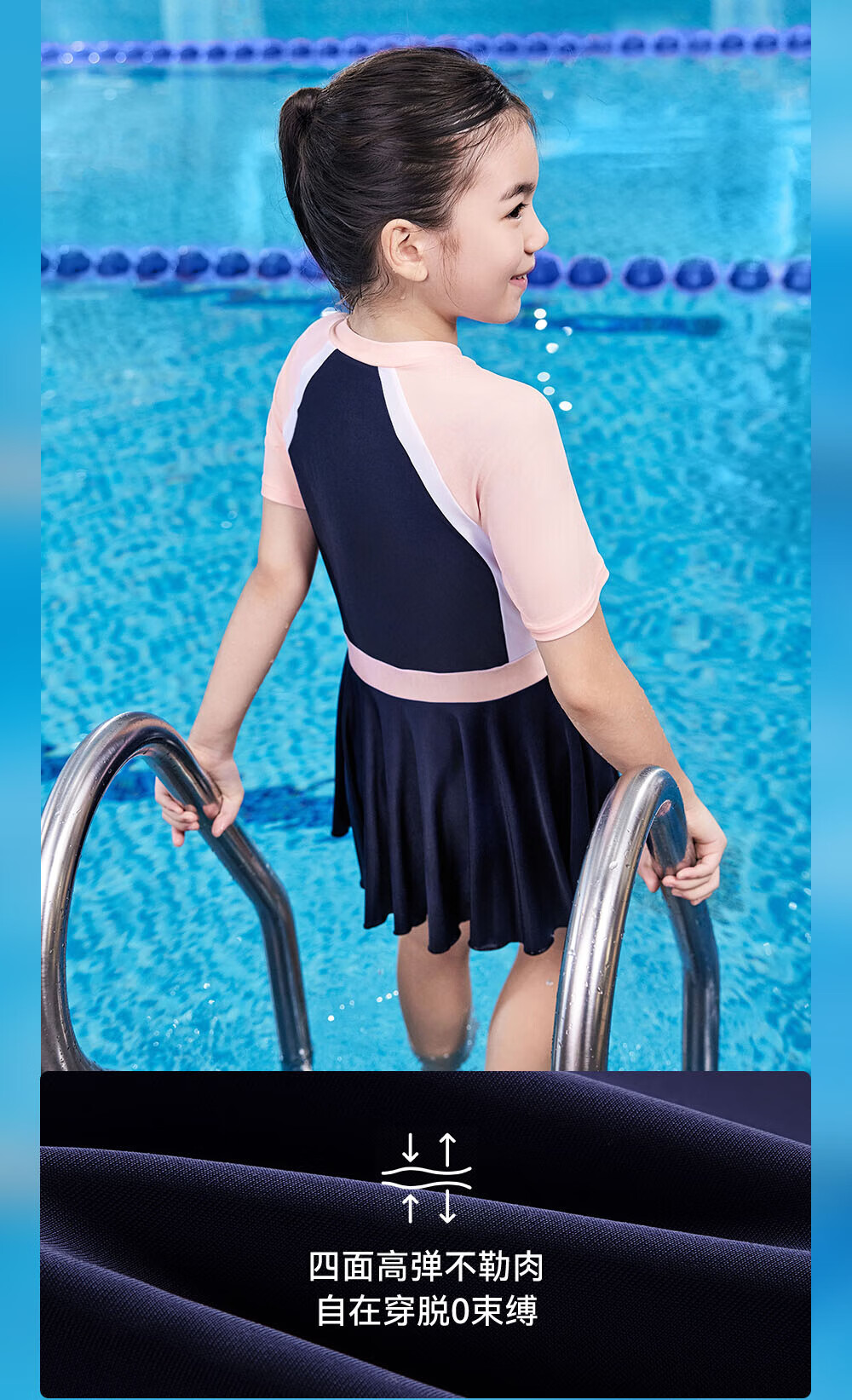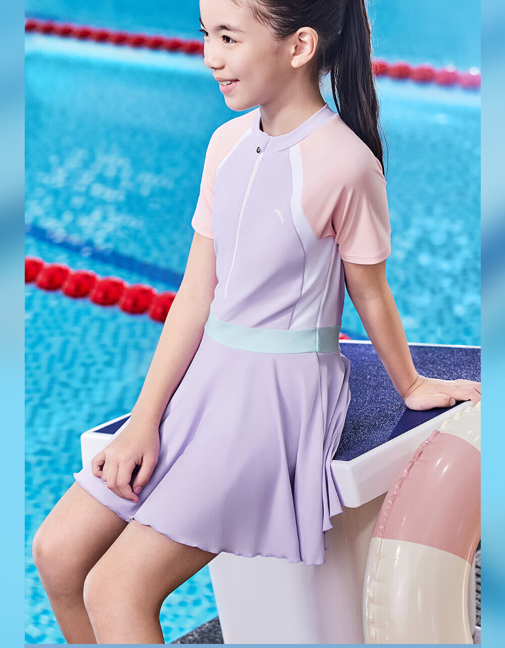 Anta children's swimsuit for girls and boys one-piece swimsuit 2025 summer new style fresh and sweet antibacterial and anti-chlorine sunscreen swimming skirt navy/pink-1 160