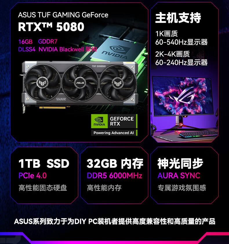 ASUS ROG family bucket 14th generation CPU RTX5080/5070Ti/5060Ti graphics card host e-sports game live broadcast design DIY sea view room desktop assembly computer complete machine configuration three i7-14700KF/5060Ti/32G host package
