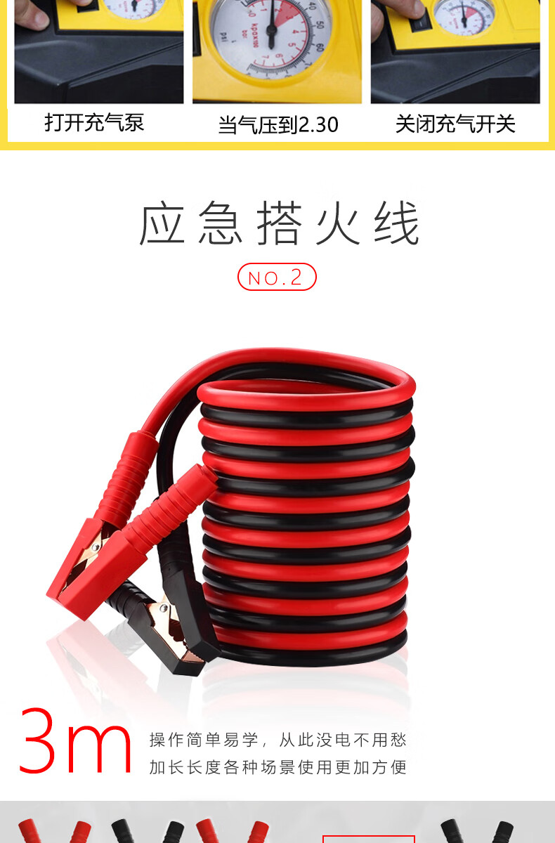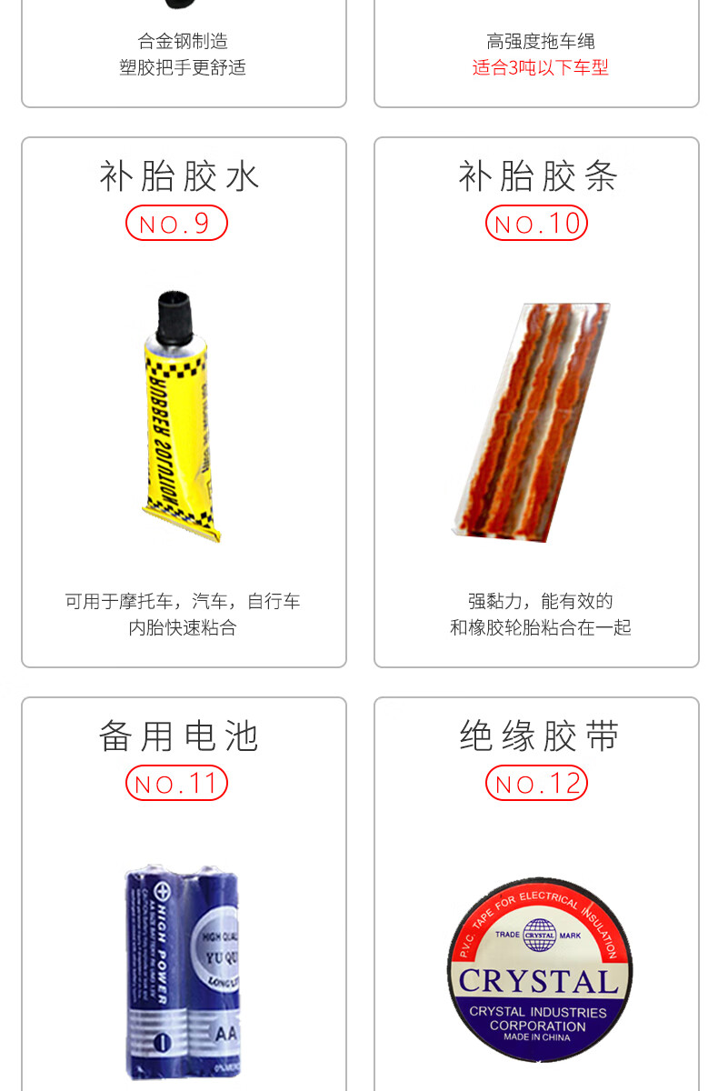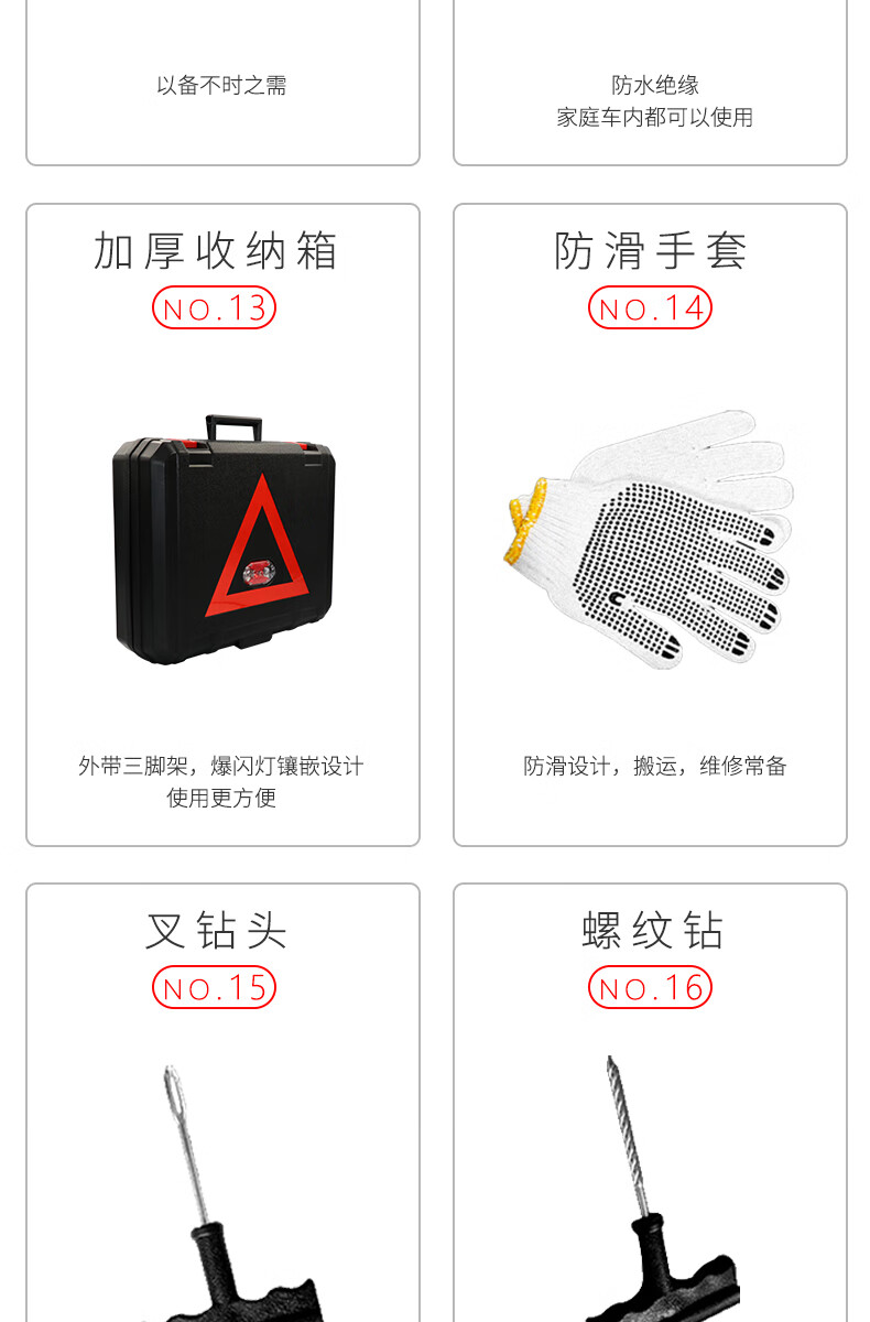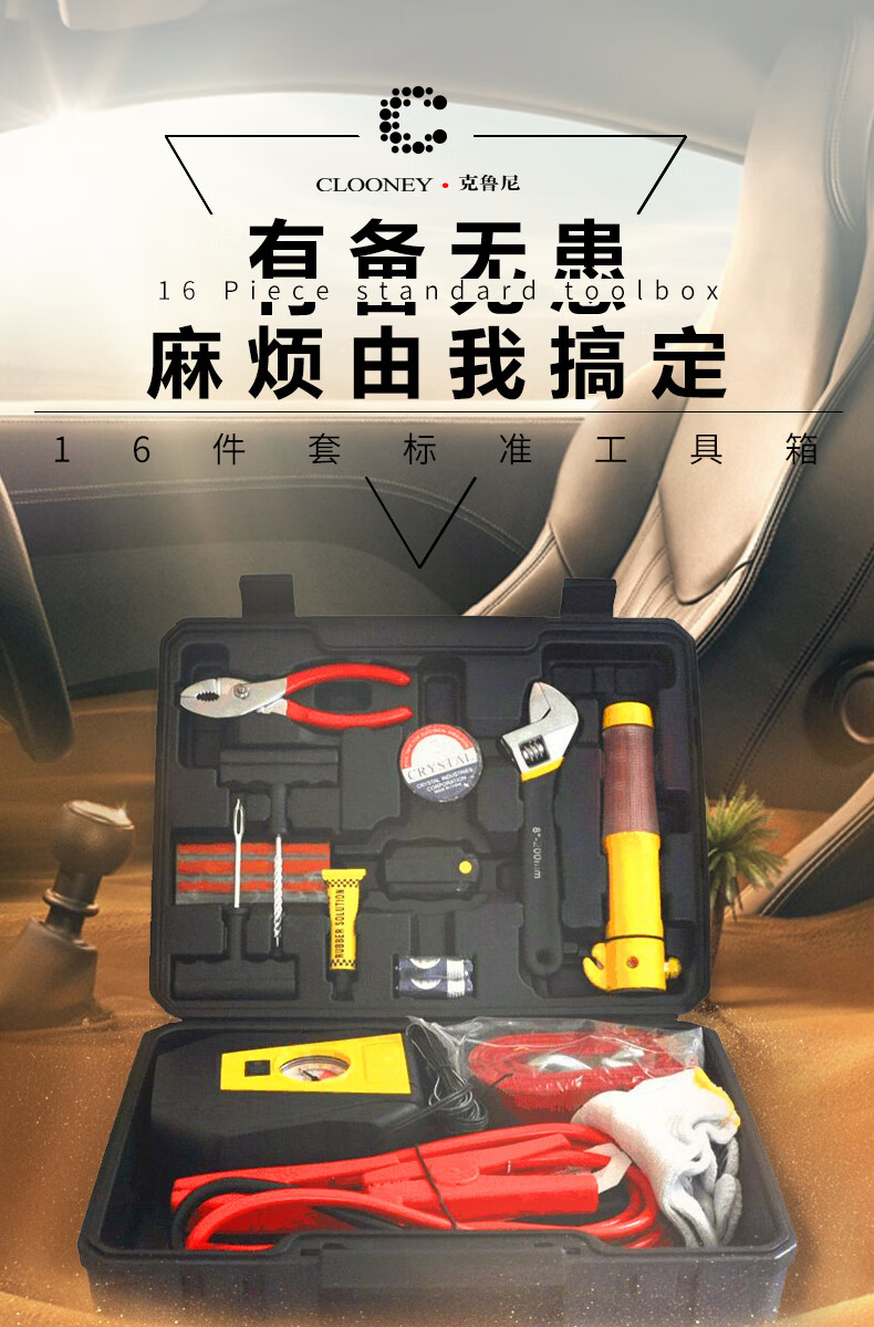 Clooney car tool box, emergency rescue kit, 16-piece standard air pump, tire repair tool, tow rope, etc.