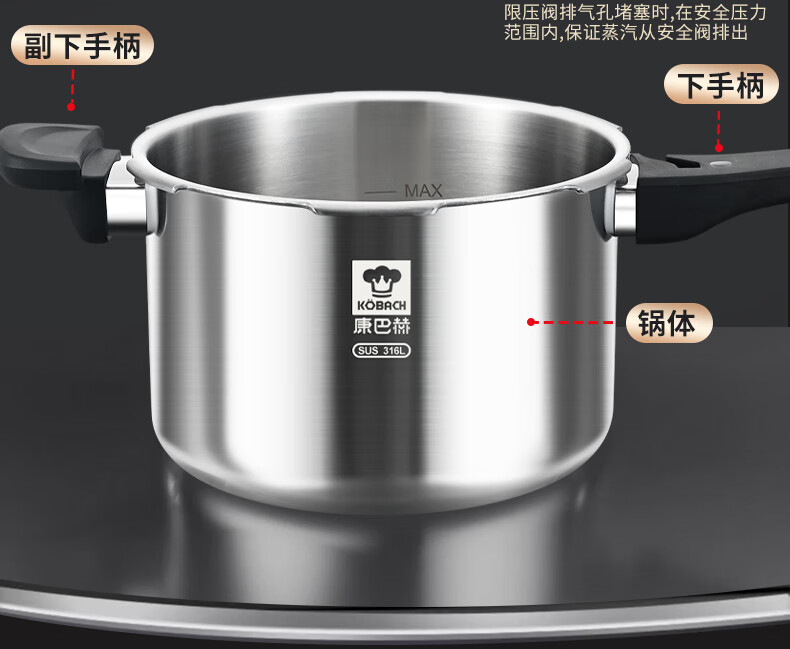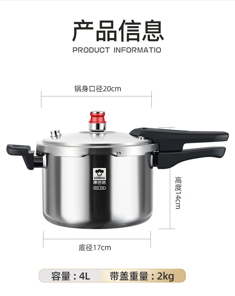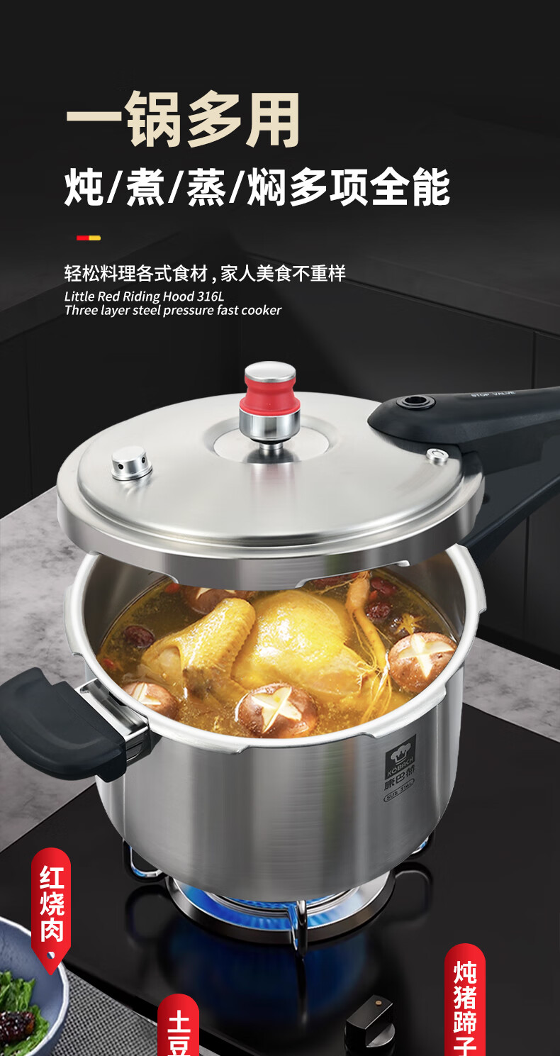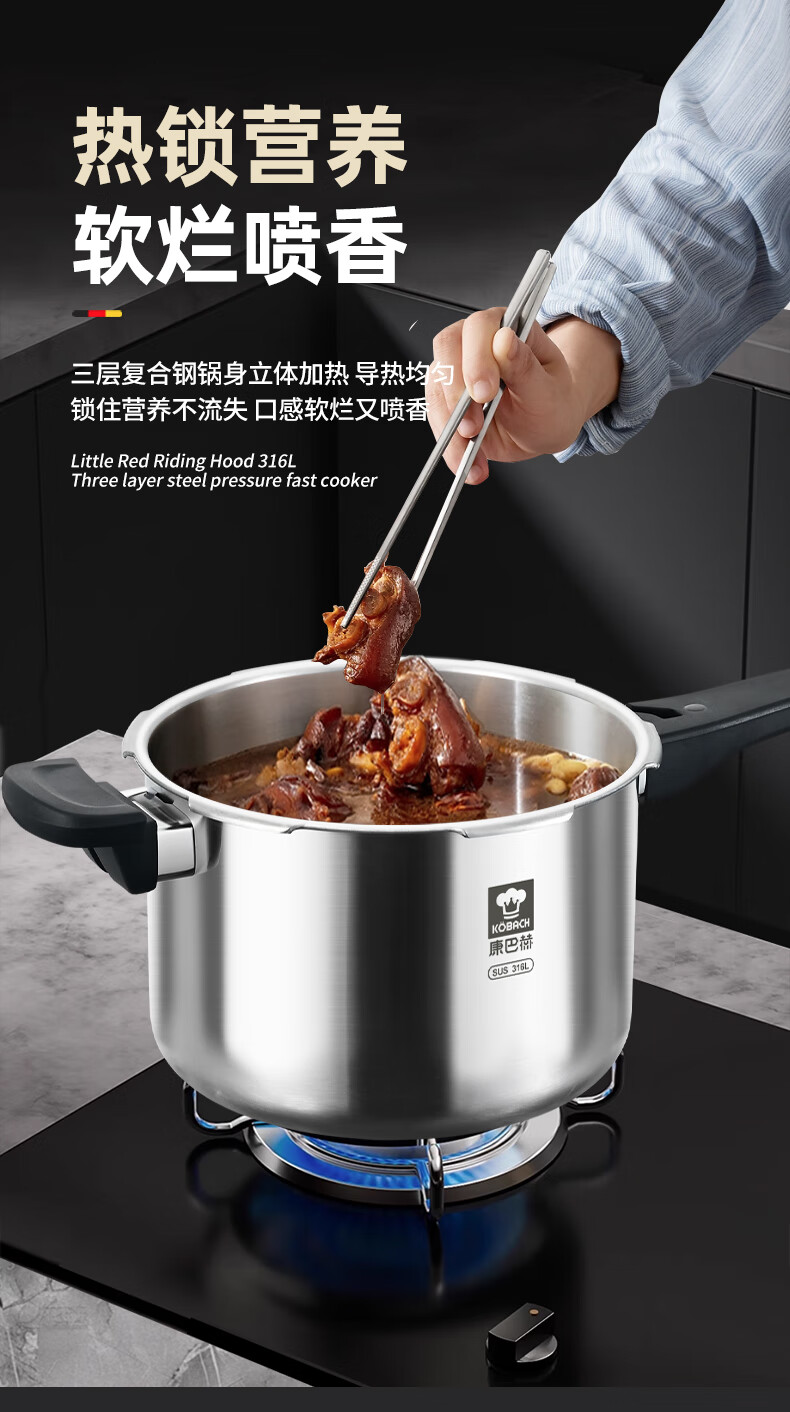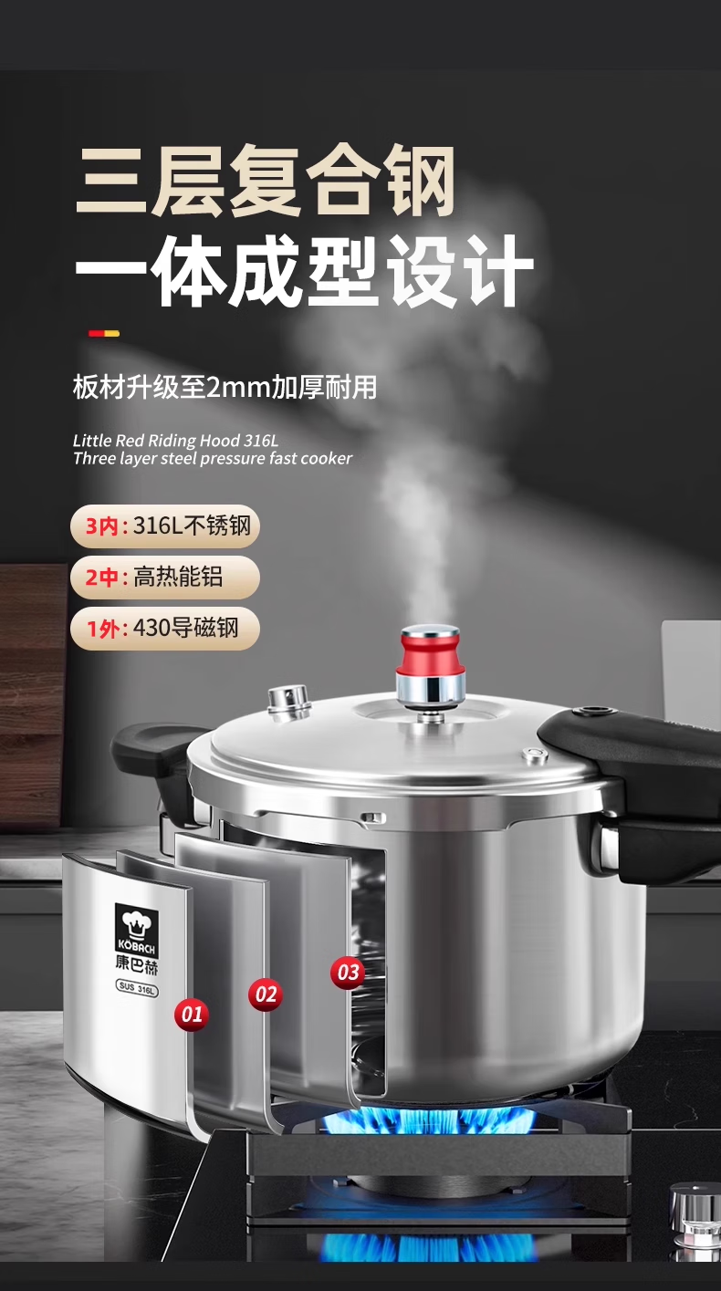 Konbach pressure cooker 316 food grade stainless steel household gas induction cooker universal one-piece explosion-proof pressure cooker upgraded version 316 steel 100kpa 22cm 6L
