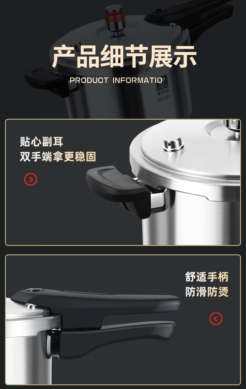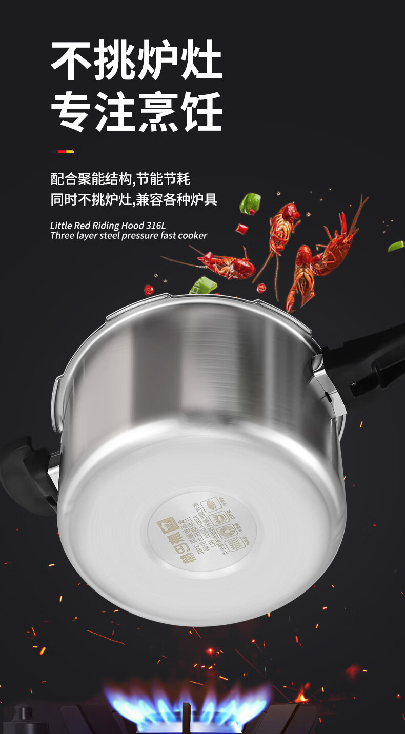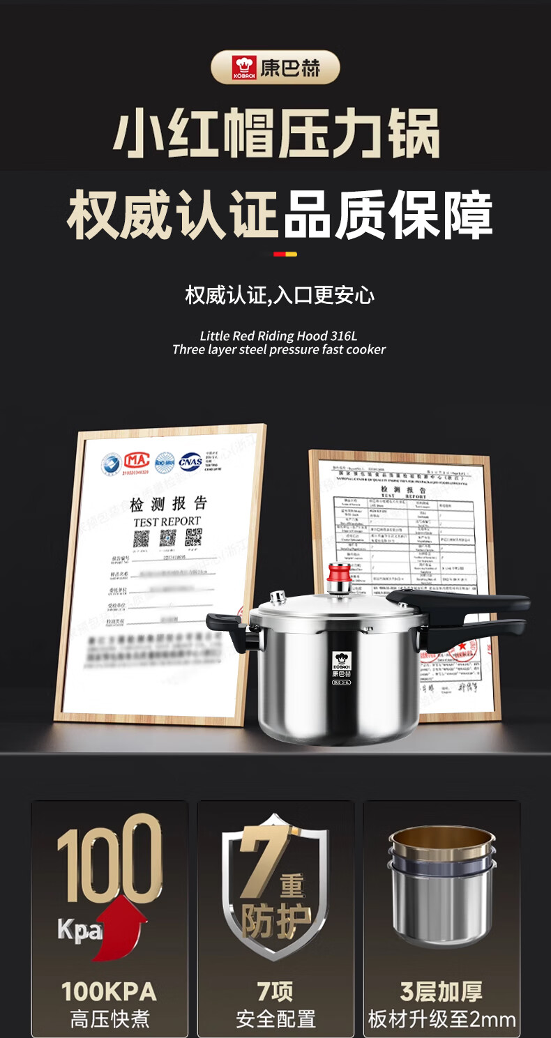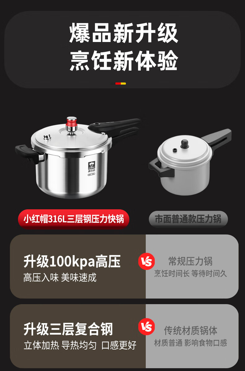 Konbach pressure cooker 316 food grade stainless steel household gas induction cooker universal one-piece explosion-proof pressure cooker upgraded version 316 steel 100kpa 22cm 6L