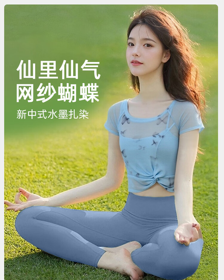 Double show Chinese style printed yoga clothes for women 2025 new style Pilates beautiful breathable mesh short-sleeved fitness training clothes set moon white blue top L 110-125