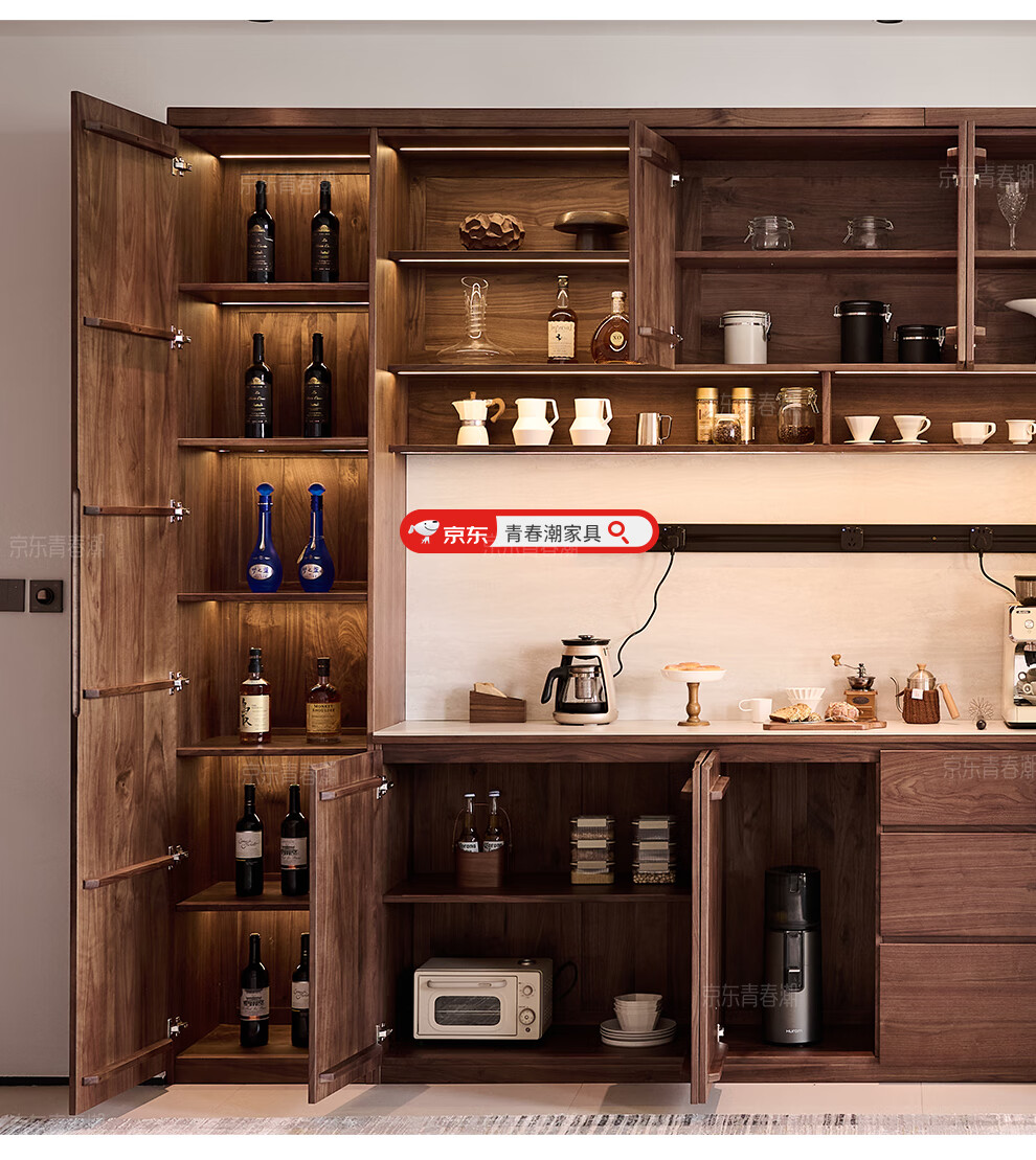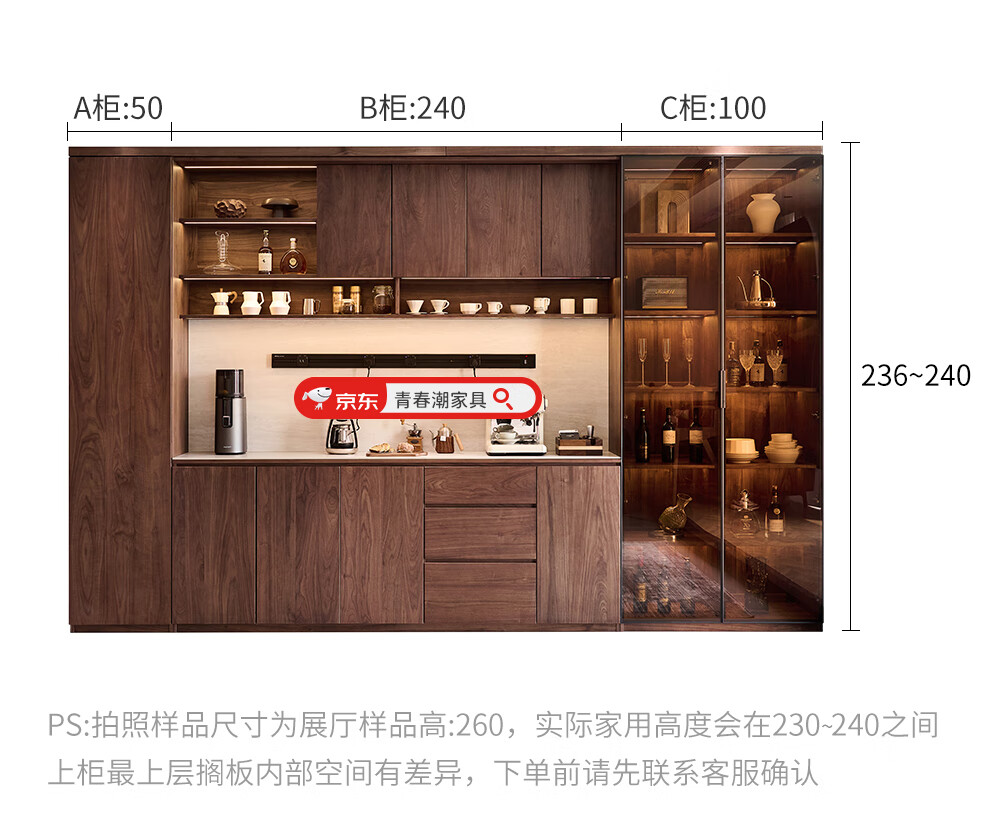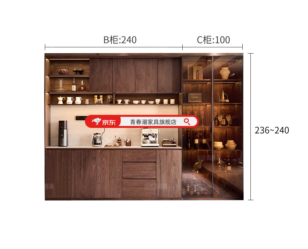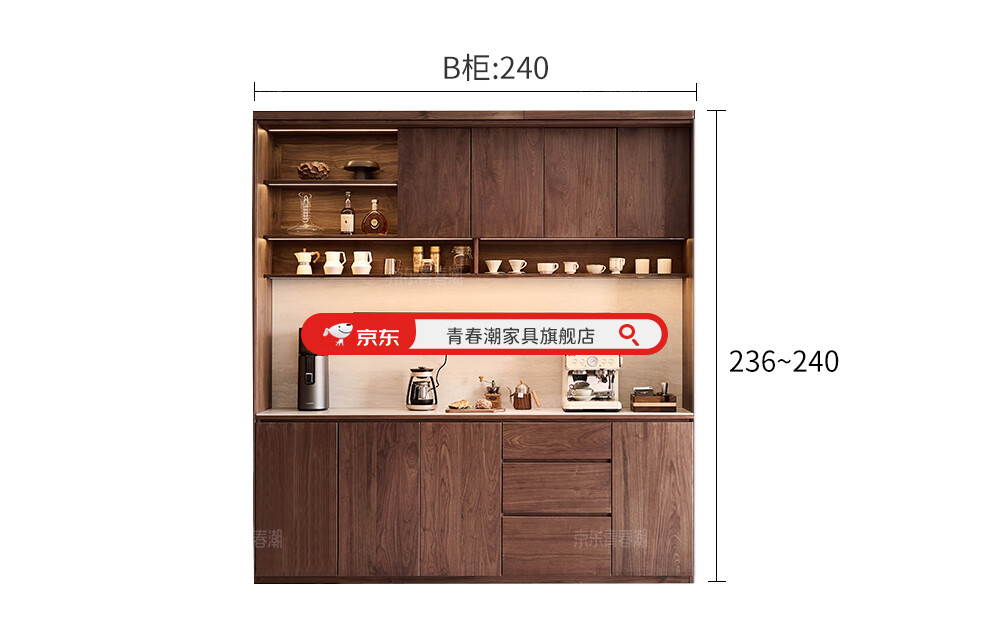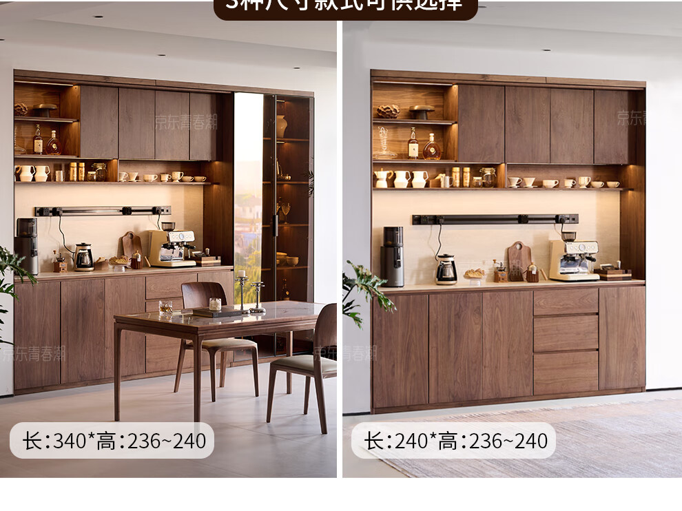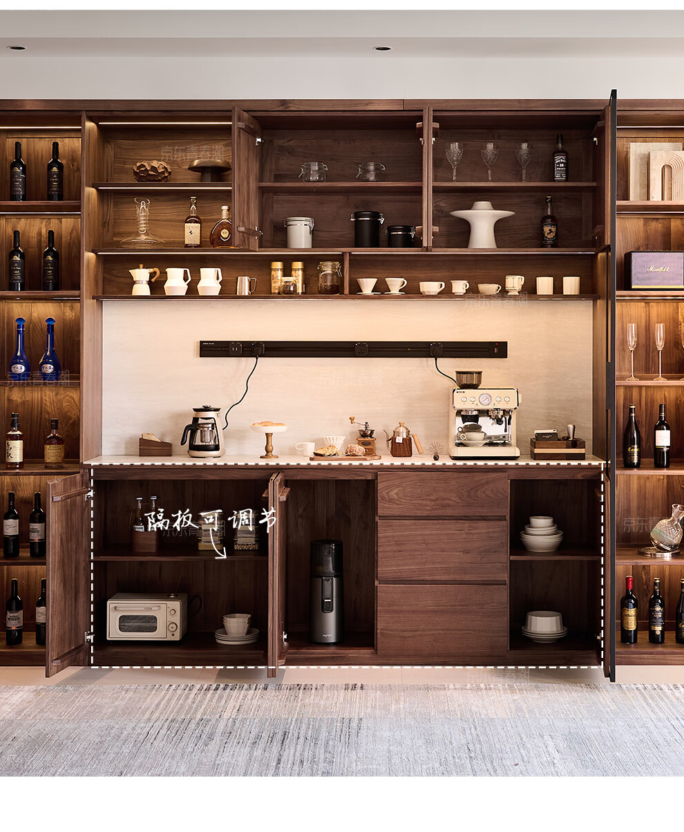 Youthful and trendy wall-to-wall sideboard integrated wall cabinet Black walnut living room wall-mounted multi-functional water bar cabinet Solid wood sideboard 240* (lower cabinet 50 upper cabinet 30)*236~240cm