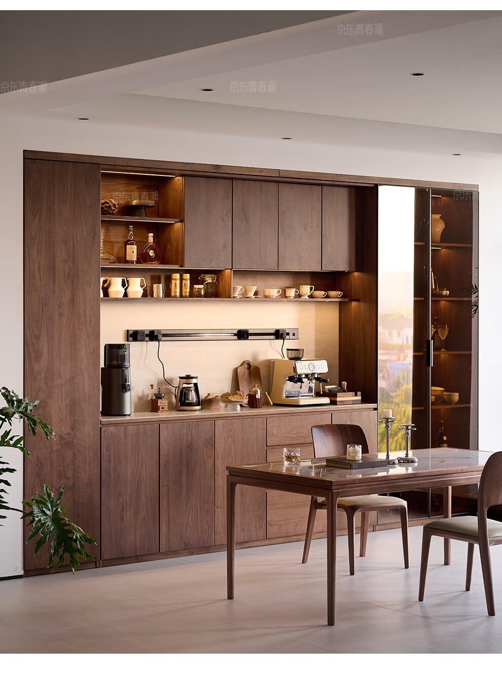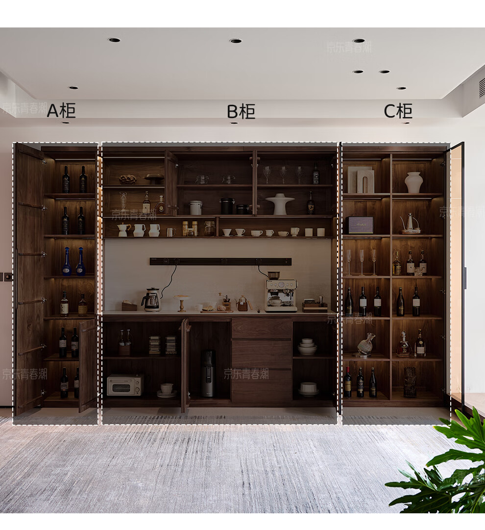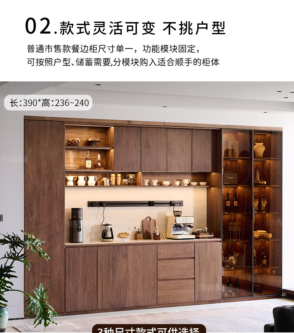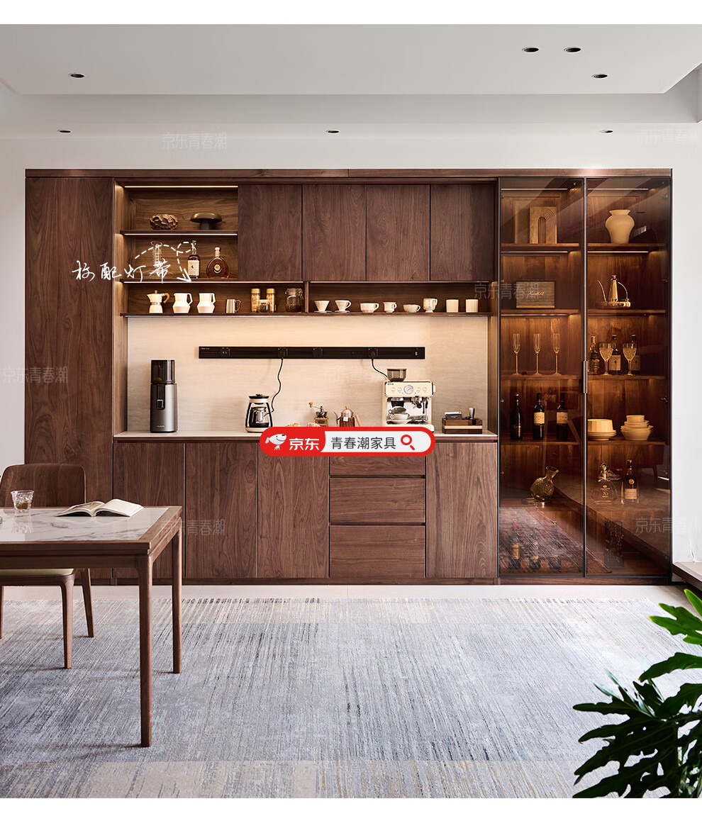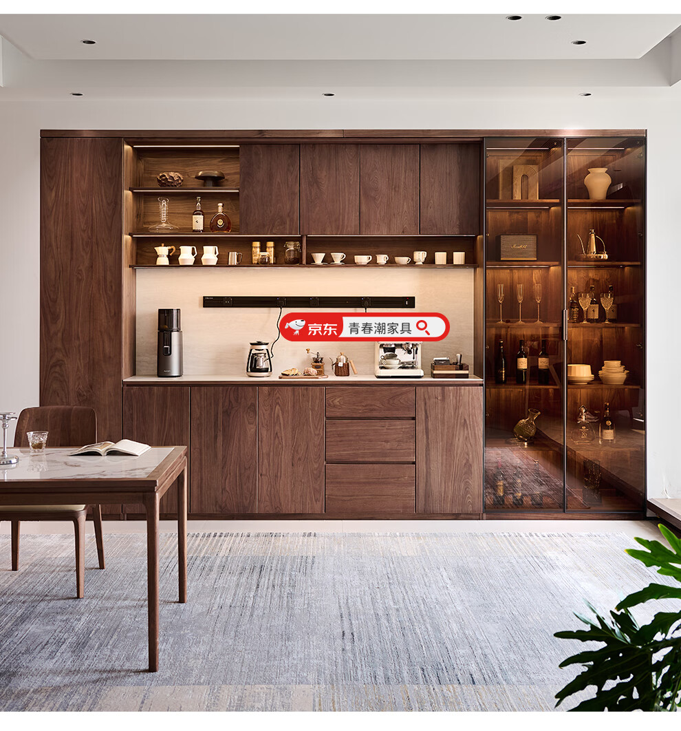 Youthful and trendy wall-to-wall sideboard integrated wall cabinet Black walnut living room wall-mounted multi-functional water bar cabinet Solid wood sideboard 240* (lower cabinet 50 upper cabinet 30)*236~240cm