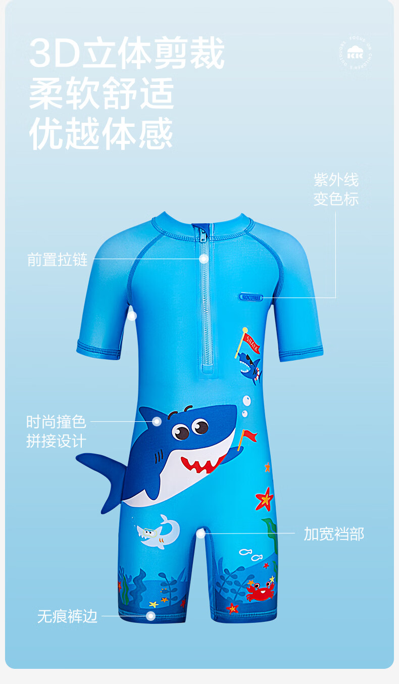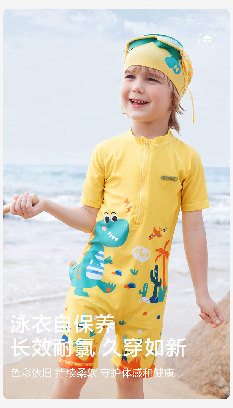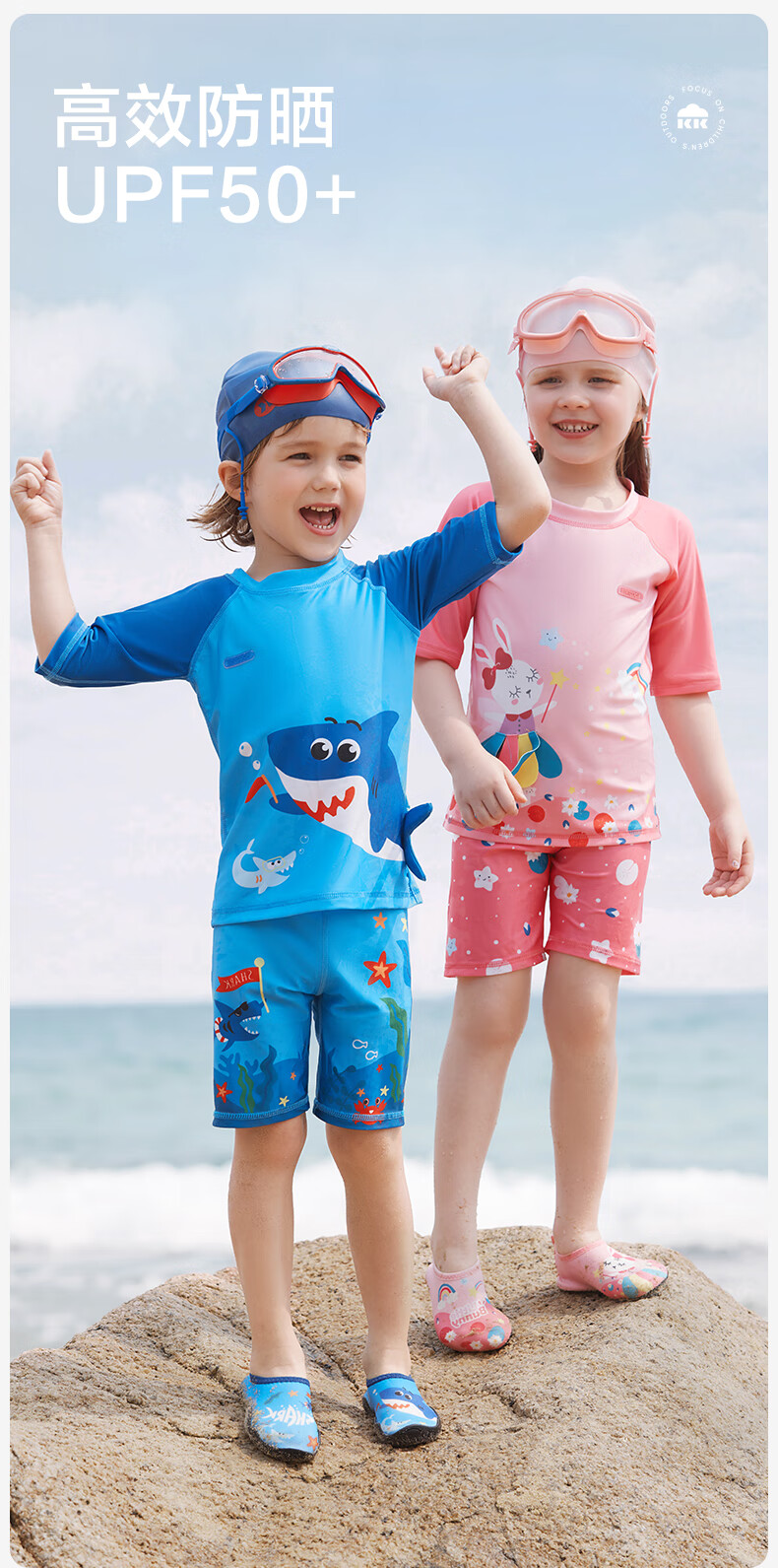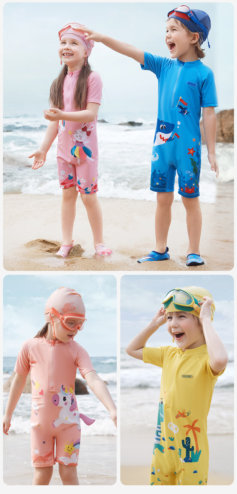 KocotreeK tree children's swimsuit new sun protection one-piece baby swimsuit for boys and girls, small shark blue one-piece, comes with swimming cap, storage bag, 120 cm recommended height 110-120, weight 30