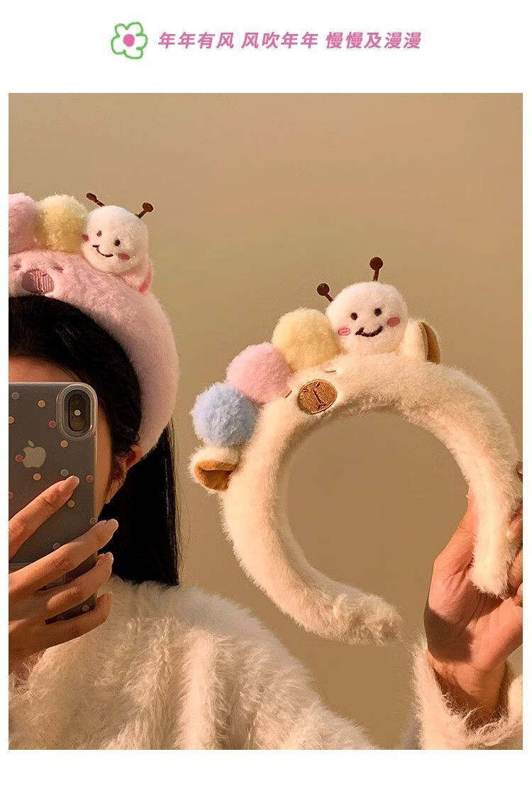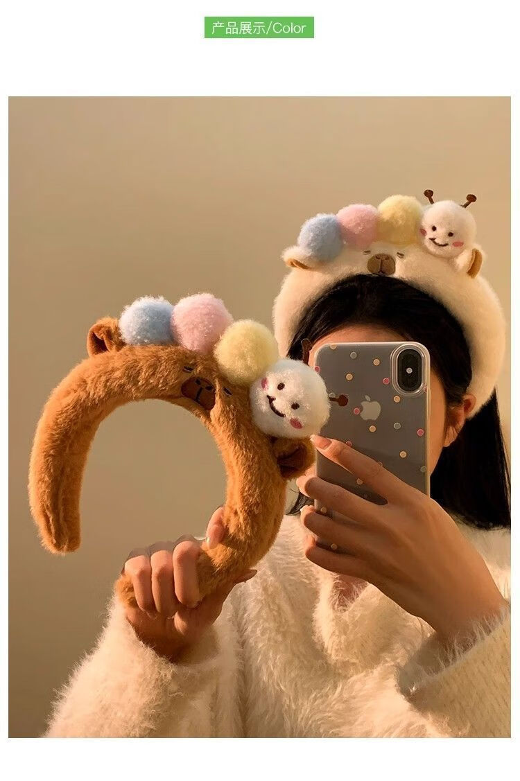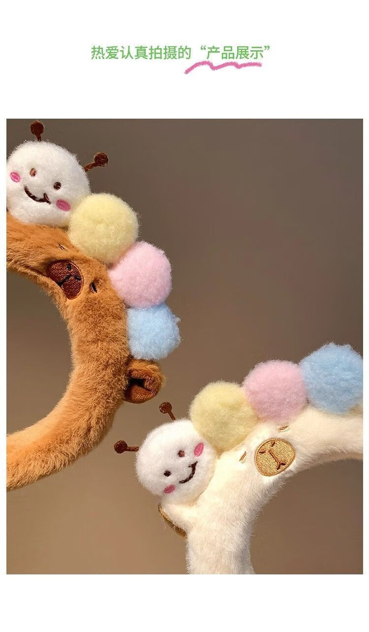 Cute caterpillar plush headband with spring flowers for women, special cartoon headband for face wash and makeup, hair clip hair accessory, brown colored ball capybara